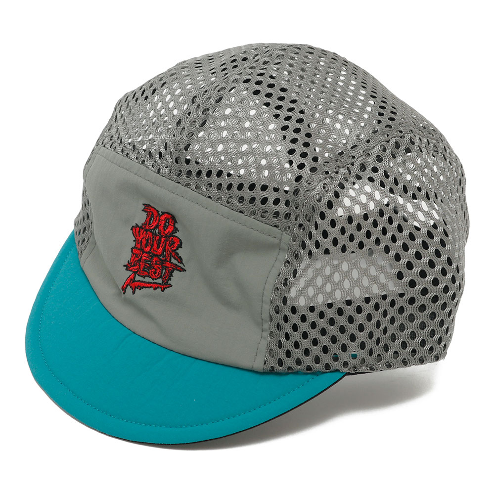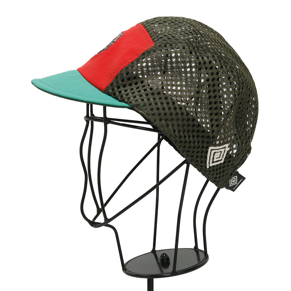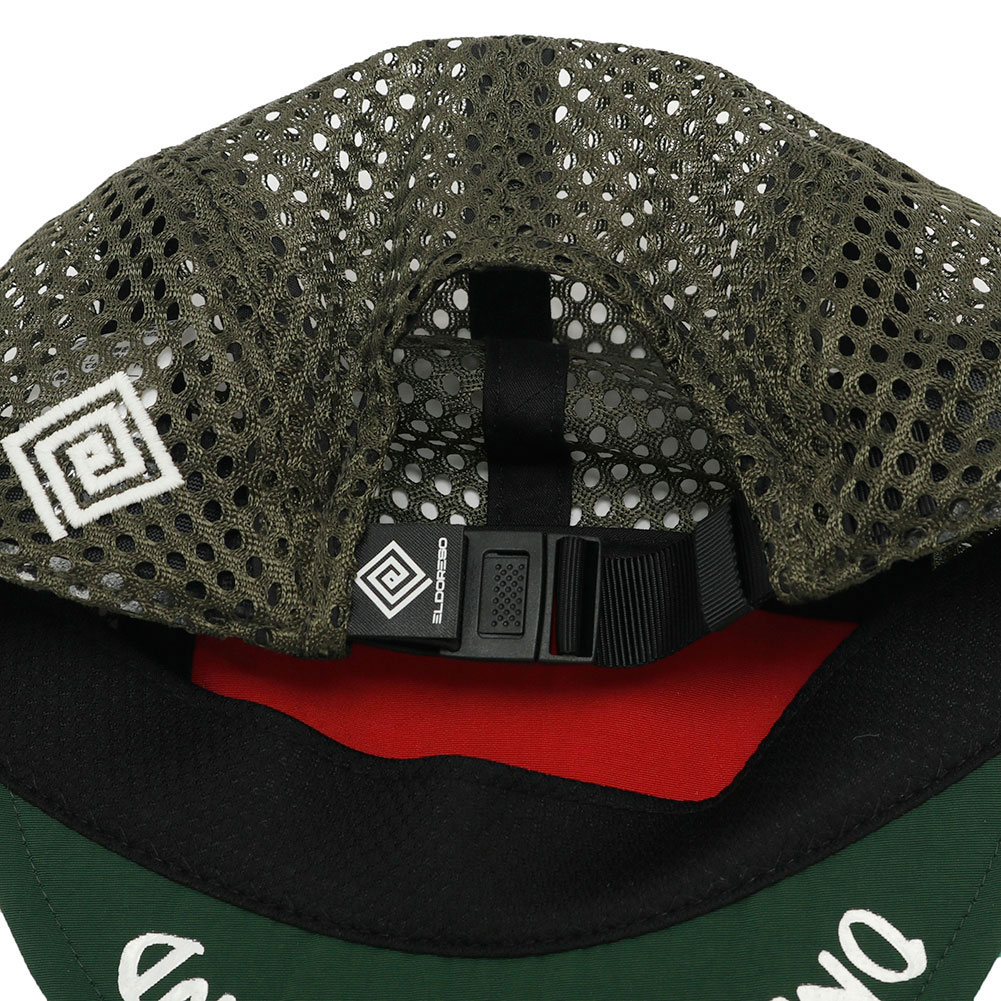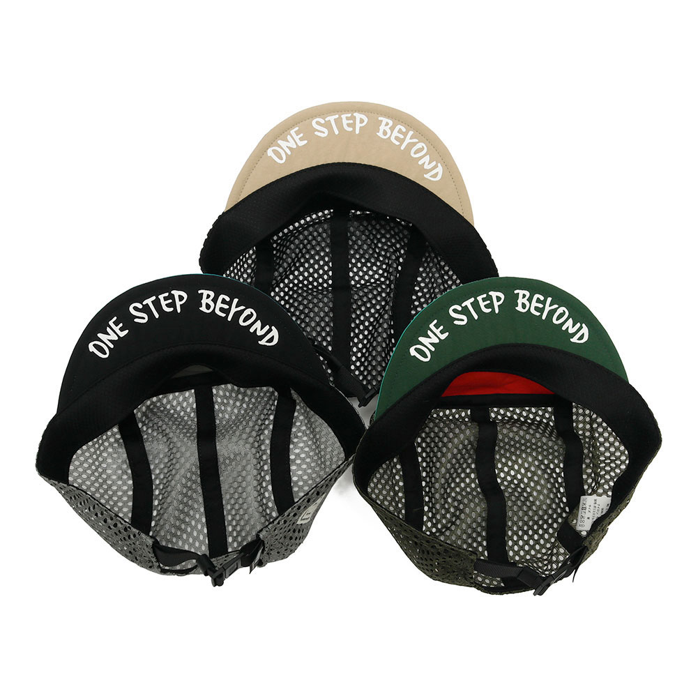 ELDORESOのスタンダードモデルの一つ、サイクリングキャップをベースにオリジナルのパターンで作成したジェットキャップタイプのランニングキャップです。フロントのパネルには、ランナーを鼓舞するワードを落とし込んだグラフィックをコンパクトなサイズの刺繍であしらいました。ブリム裏にも「One Step Beyond」のワードを手書き風のプリント配し、ツバを跳ね上げて被った際のアクセントになるように仕上げました。この型はELDORESOのキャップの中で頭囲の調節の幅が広く、フィット感のあるコンパクトなフォルムな為、頭の小さな方に人気の高いモデルです。通気性を確保する為、トップとサイドのパネルを目が大きく柔らかなメッシュに切り替えています。