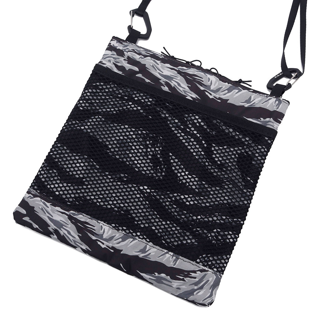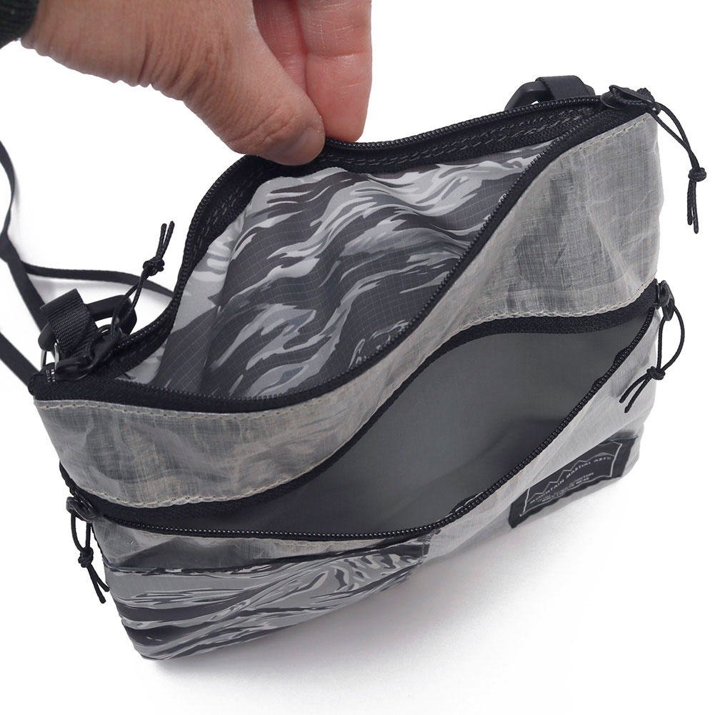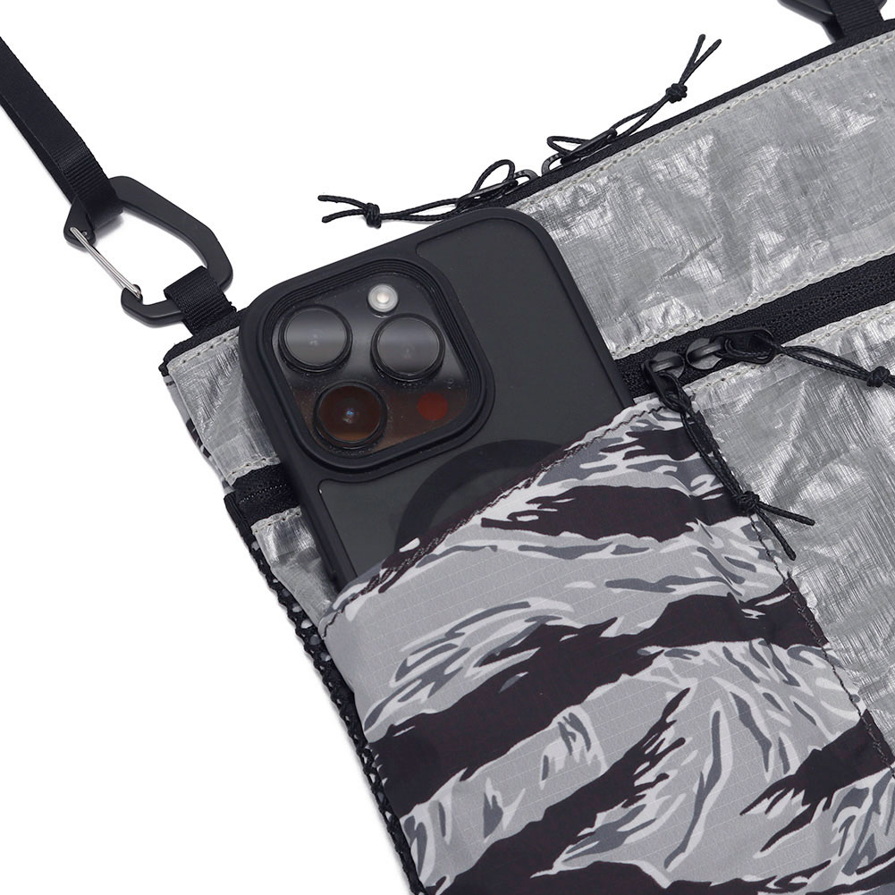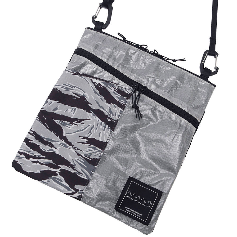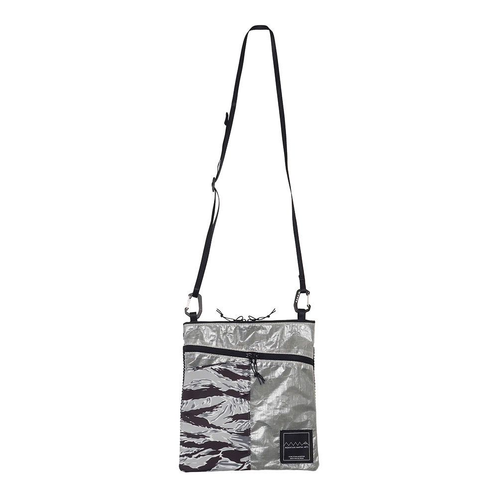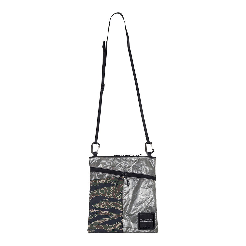 カモ柄を組み合わせたデザインが特徴的な軽量サコッシュ。豊富なポケットと軽量さでタウンユースからハイクまで活躍する。縦長方形にすることで体にフィットしやすい形状で、ザックを背負った際にも動きを妨げにくい。表面は DCF(Dyneema®Composite Fabric)、前面ポケットと背面は撥水加工を施した軽量リップストップにタイガーカモを昇華転写プリント。前面ポケットはスマートフォンが入るサイズ。上部のファスナーからアクセスする本体と、前面の斜めファスナーからアクセスする前面ポケットの 2 室構造。ファスナーは止水仕様で左右から開けることができる。背面にもメッシュポケットで充分な収納力。ショルダーベルトは細めの 15mm で、MMA ロゴ入りカラビナで本体にフックする。