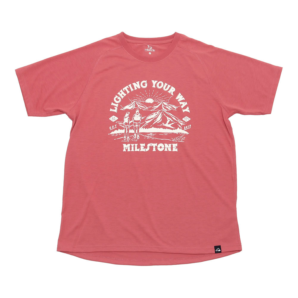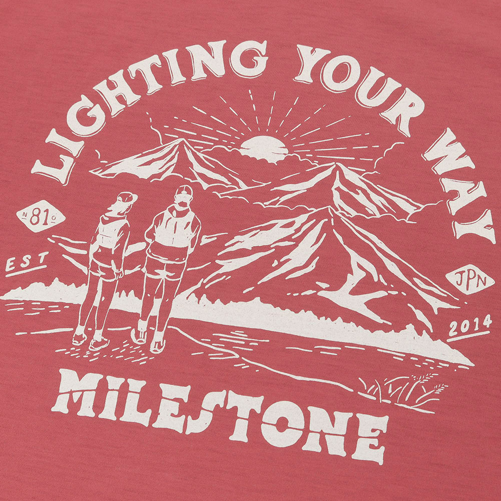 milestoneオリジナルTシャツの新定番ボディ『キャンバス』。“色んなアートワークが載るキャンバスのように”、という意味から名付けられています。リサイクルポリエステル100%を採用し、デイリーユース、ランニング、あらゆるアウトドアアクティビティにも使えるよう動かし易い袖付けや、裾の後ろを長く撮るなどオリジナルパターンを起こし、フラットシーマミシンで仕上げた渾身の一枚。今回のキャンバスTシャツは、過去にSTAMP RUN & COとのコラボTシャツで大好評を博したデザイナー、岡本氏のアートを使用した一色刷りのシンプルなデザイン。国立公園をイメージしたヴィンテージTシャツ風のイメージにトレランスタイルの男女を落とし込んでいます。