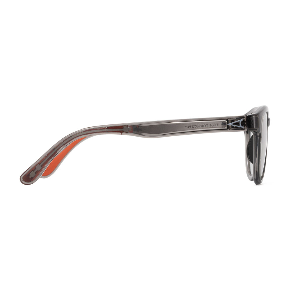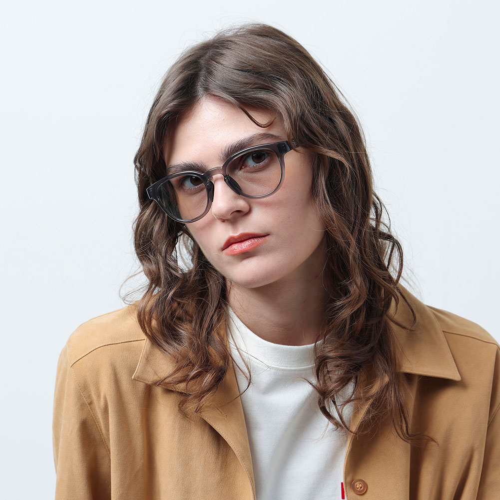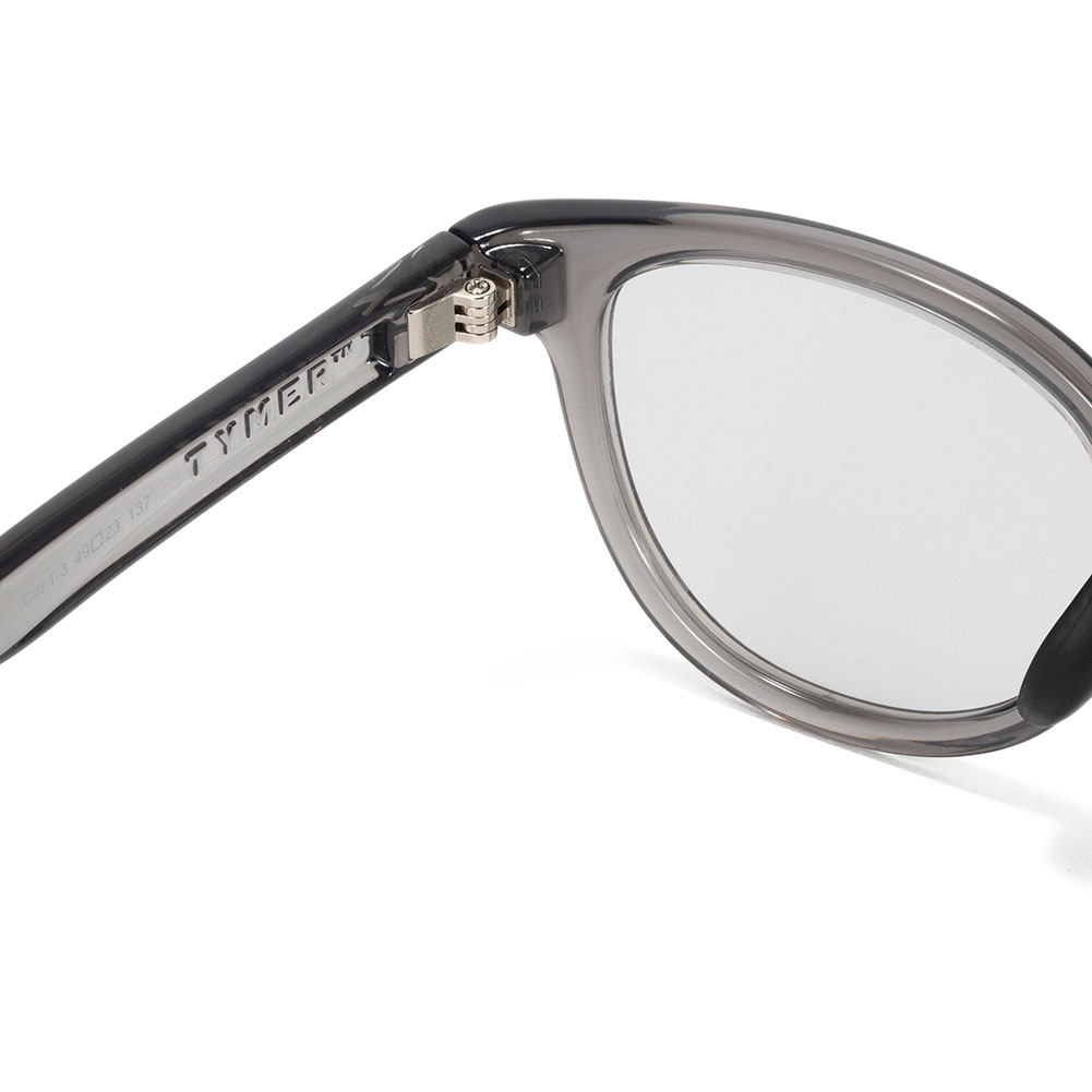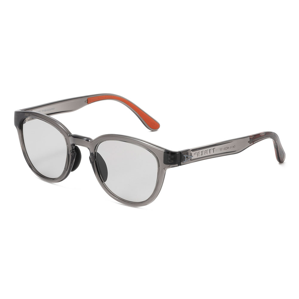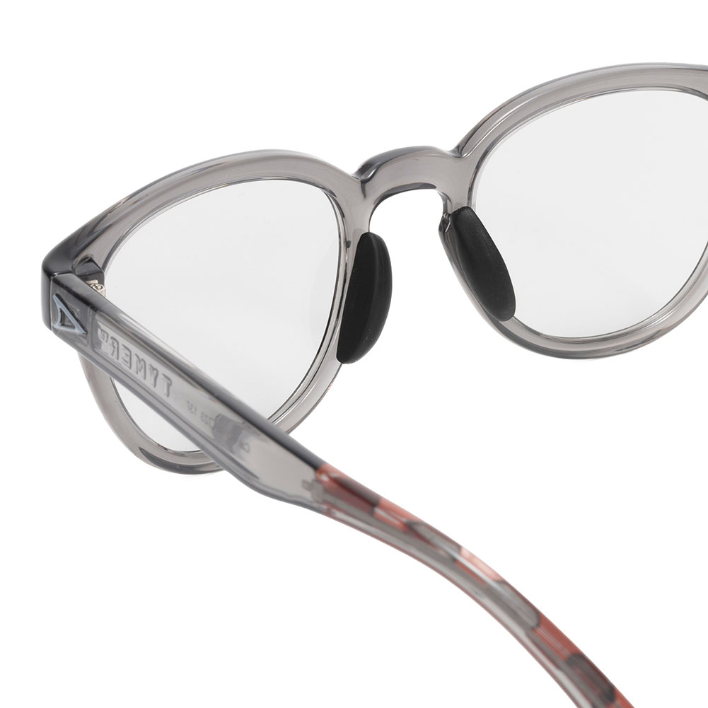 近年人気のクラシカルなボストンシェイプにより洗練された柔和な印象に仕上げられています。 絶妙なサイズ感により性別やスタイルを問わないモデルです。フレームはグロスクリアグレー、レンズは紫外線量により明るさが変わる調光レンズ。