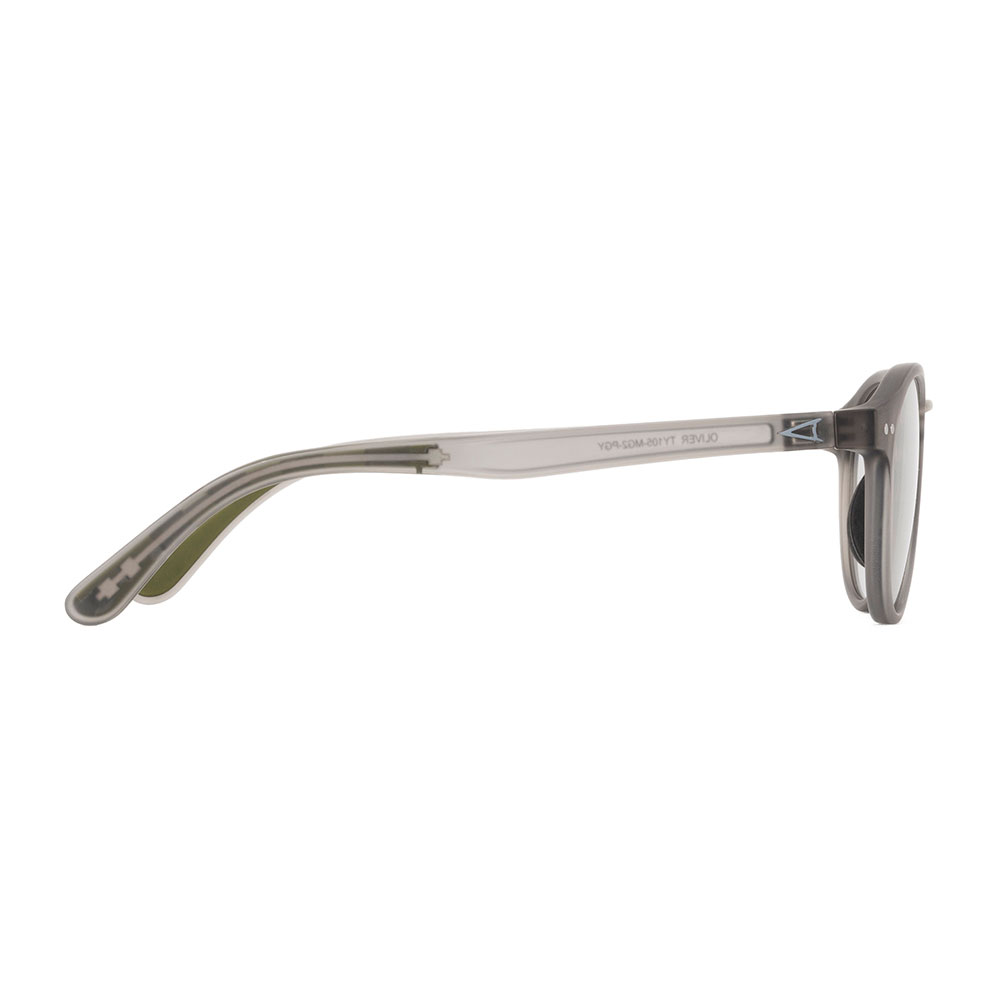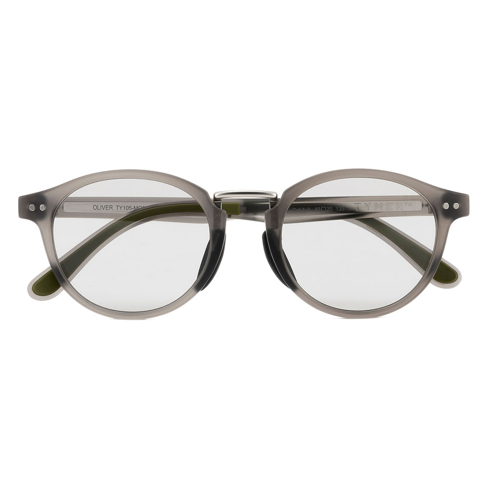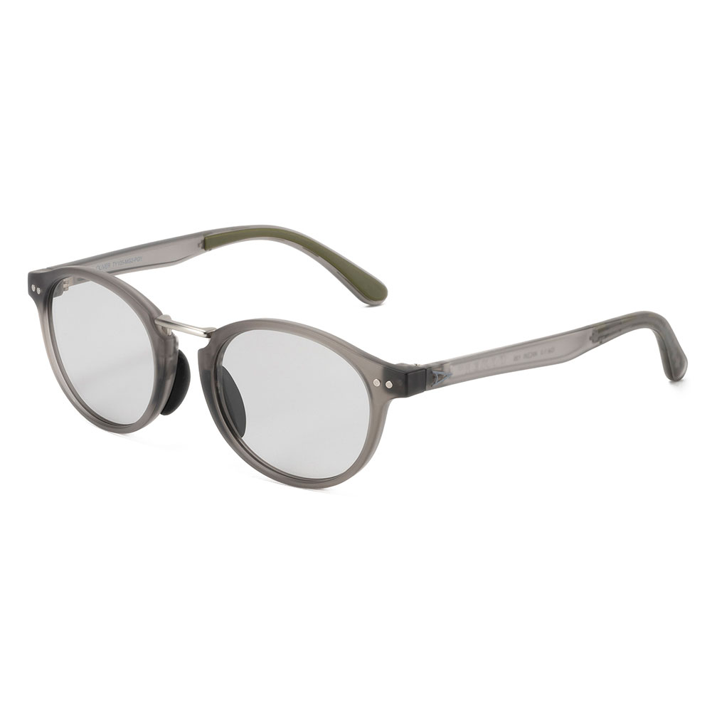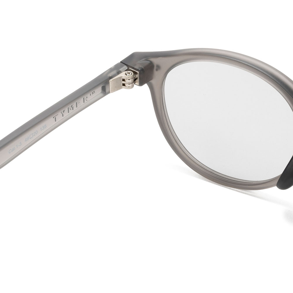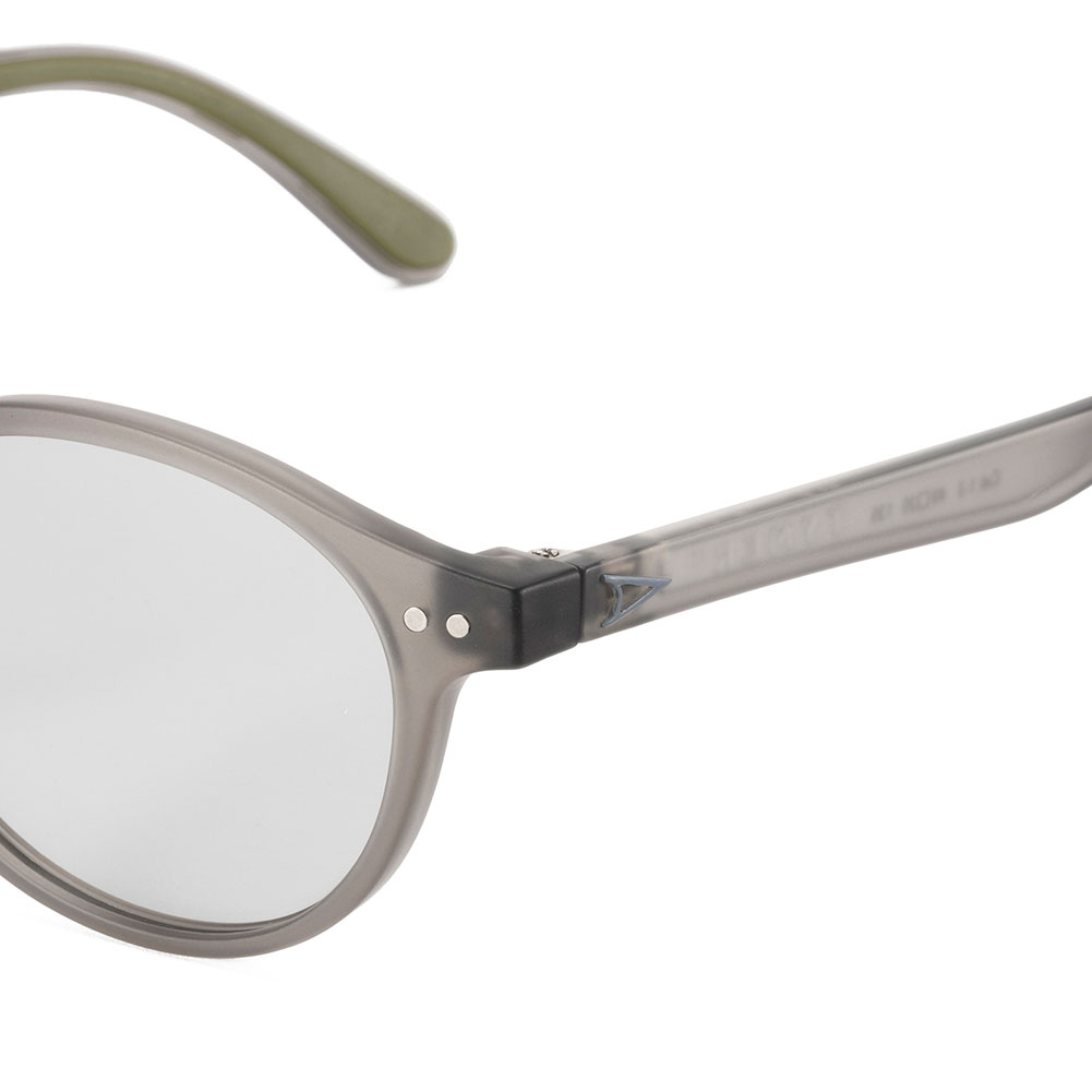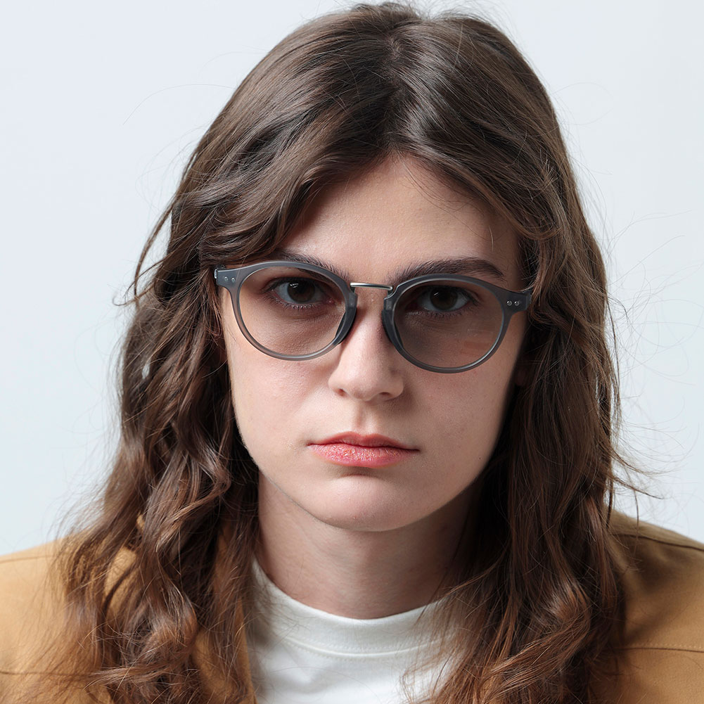 天地幅を抑えたボストンタイプのレンズシェイプにメタルブリッジを組み合わせて、新開発の細身のナローテンプルを採用。フレーム全体をスリムに仕上げる事で見た目、着用感共に軽快さを感じさせつつ、メタルのカシメ(ドット鋲)でクラシックさも演出しています。フレームはマットクリアグレー、レンズは紫外線量により明るさが変わる調光レンズ。