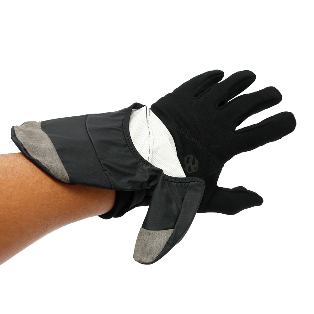 Hoboとadaptを融合した汎用性の高いモデルで、コンパクトに収納できるフードを掲載したフルフィンガーグローブ。本体は保温性、調湿性、抗菌性に優れたメリノウールを使用。細かい作業が出来るように指だしの仕様で、素早く時計を確認できるウォッチウインドを搭載。