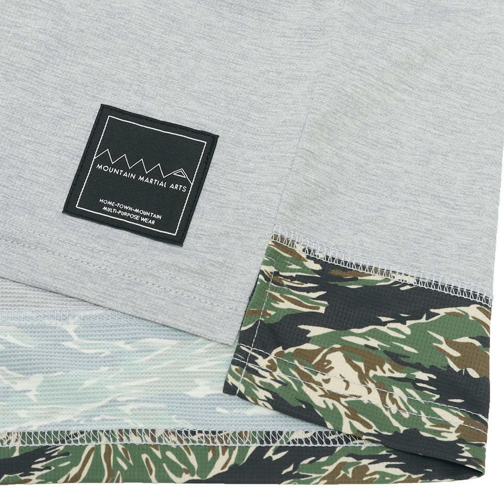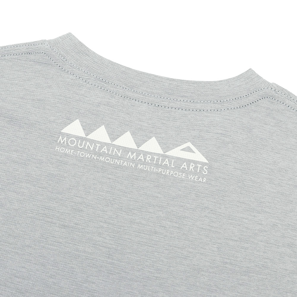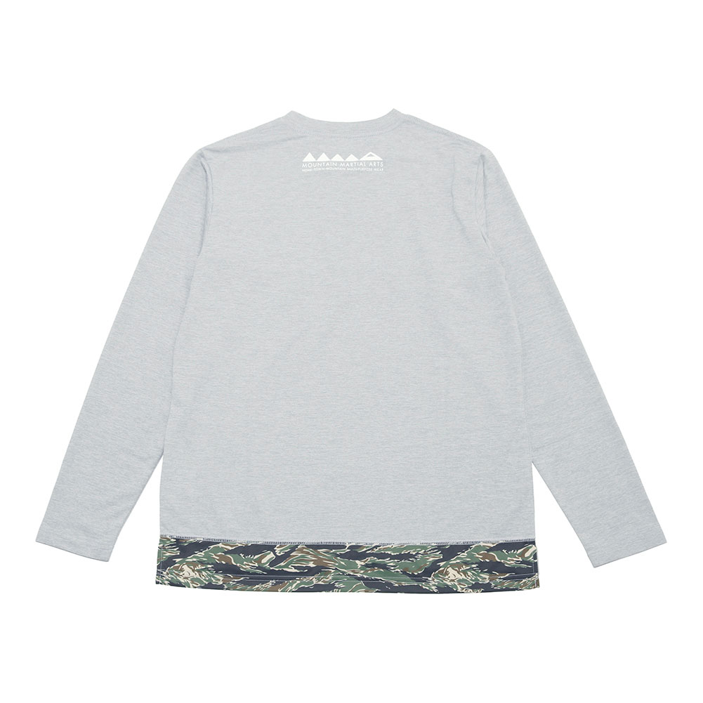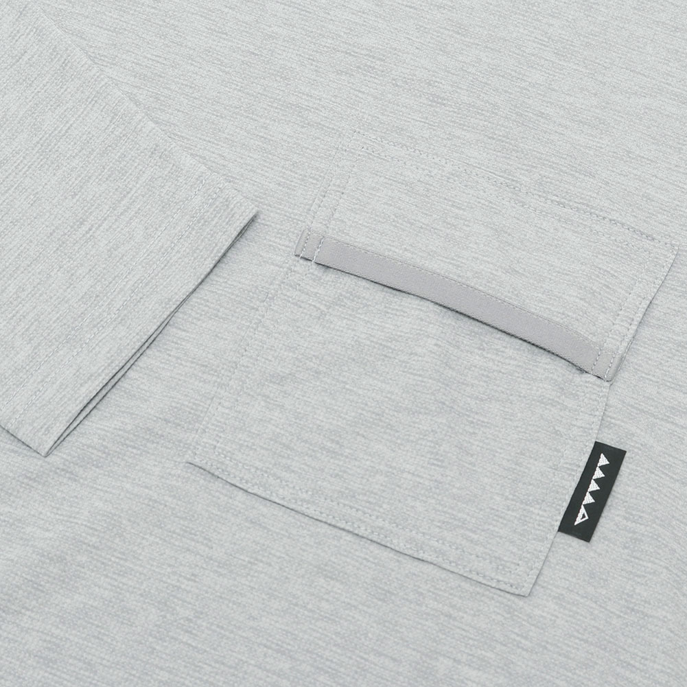 ポケットはバインダーテープにより落としにくい形状。裾にはスリットが入り、背面が長いクラシカルなディティール。背面下部を MMA オリジナル柄に切り替えている。本体素材は凹凸感のある軽量な機能素材を使用。肌面は撥水糸で汗をかいてもべたつかず、吸水速乾と抗 UV 機能を備える。しなやかで肌触りがよく、ライトアクティビティから長時間のヘビーアクティビティにも対応する。天然素材に比べ、洗濯しても速く乾くメンテナンス性のよさも魅力のひとつ。シンプルなロング T シャツは様々なスタイルとコーディネートしやすく、ランやハイクなどのアクティビティのベースレイヤー