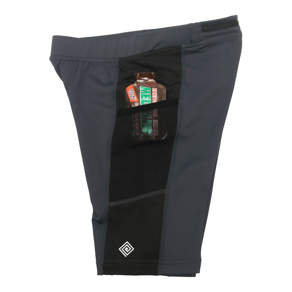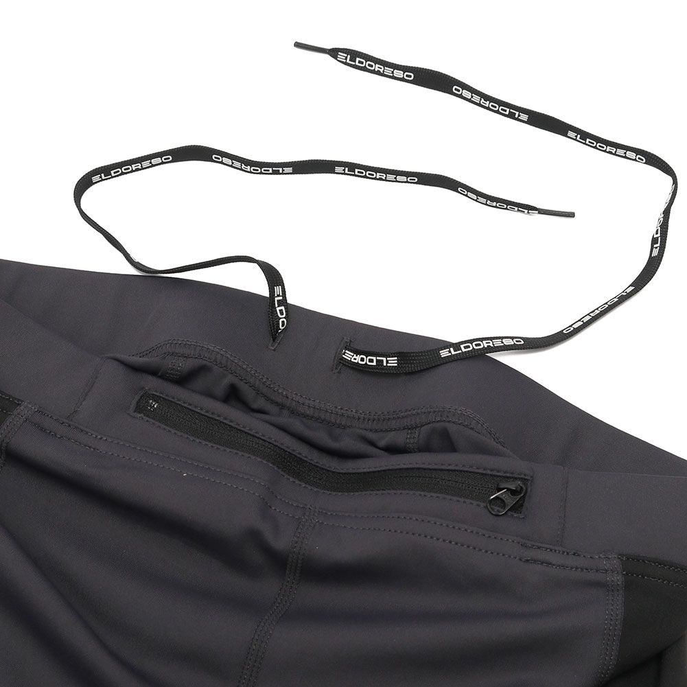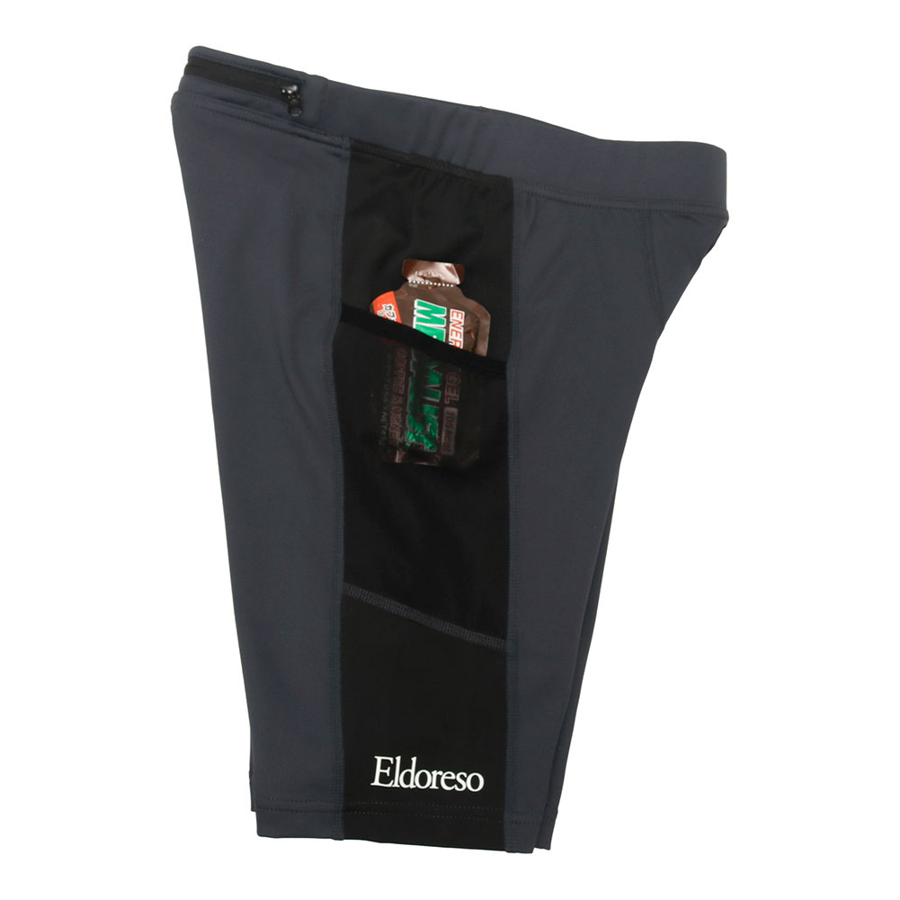 実業団選手やアスリートからの「レース用に使えるタイツを」とのリクエストにより誕生したエルドレッソのハーフタイツの定番タイプです。ジェルなどの小物の収納に便利なジップ付きの腰ポケットに加え、左右の腿にもメッシュポケットを搭載した機能的な仕様です。一般的な着圧タイツと比べて締め付け感を感じづらい快適な履き心地を実現したエルドレッソのタイツは、着圧の強すぎるランニングタイツは苦手というランナーの方々にお勧めの一着となっています。