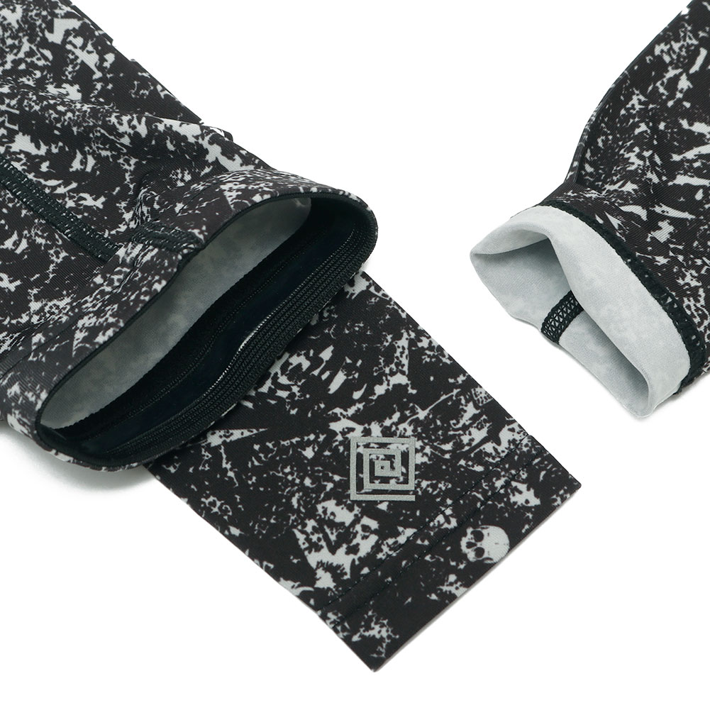 見た目にフラットに仕上がるのに加え、着用時に縫い目のあたりが出づらくストレスフリーな装着感となっています。腕口には滑り止めのゴムが付属。ワンポイントでブランドロゴのプリント入りです。