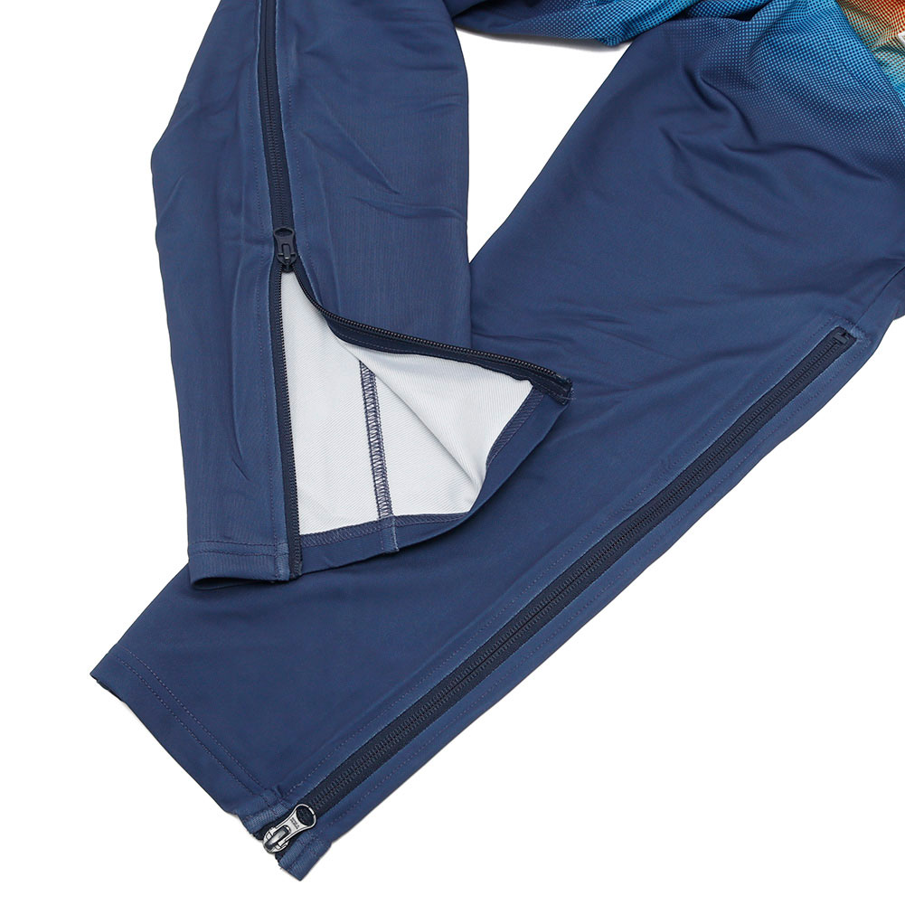 ランニングパンツの上からもレイヤードしやすいよう、ややゆとりのあるシルエットに設定。長めの裾ジップを両足に搭載しており、シューズを履いたままでも着脱が可能なように設計しています。サイドポケットにはジップを配し、実用性を持たせながらもデザインのアクセントとしています。ゴム入りのウエストに加え、ブランドロゴのプリント入りのドローコードも付属しているので、ジャストサイズでの着用が可能となっています。