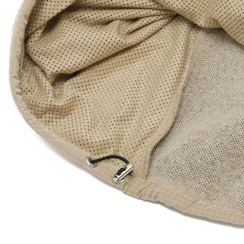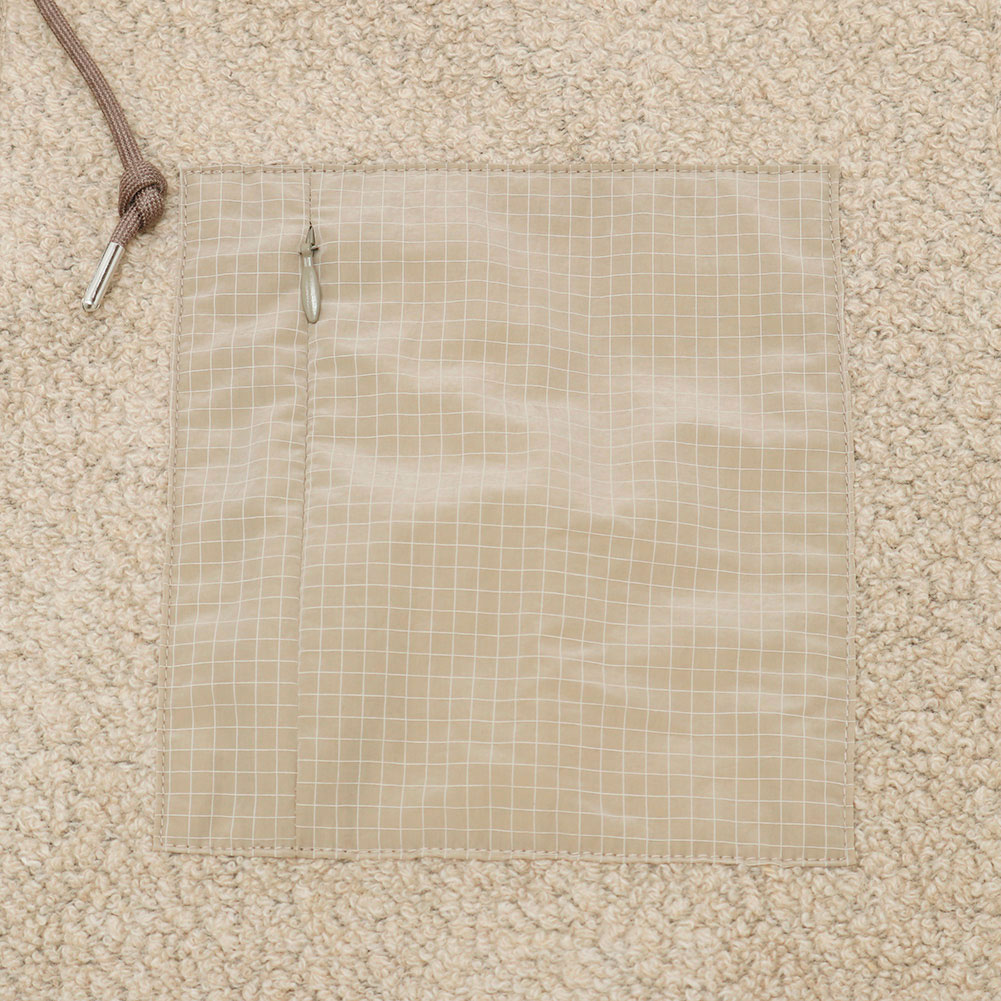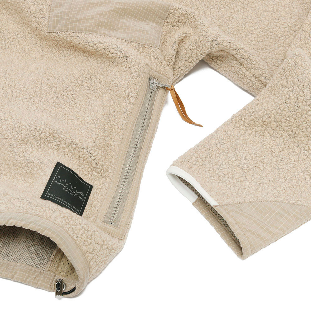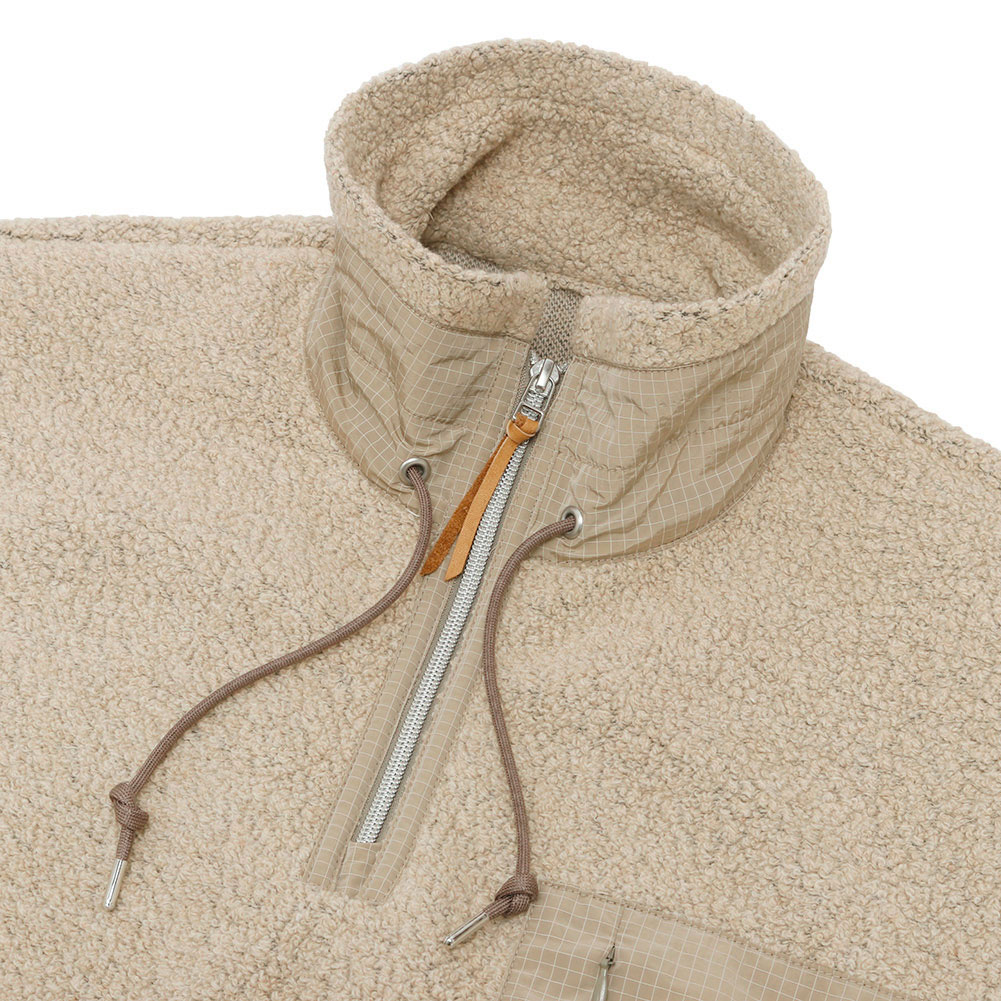 日本製のオリジナルボディは、ナチュラルショルダーで肩幅と身幅にゆとりを持たせたリラックスシルエット。胸元のハーフファスナーで体温調節が可能。襟元とポケットカバー、袖先は高強度の撥水モノフィラメントリップストップナイロンで耐久性向上とデザインのアクセントに。本体素材は、CALAMAI 社の再生ウールとマイクロ化繊糸を混紡したエアリーなウールフリース。イタリアならではの発色の良さとソフトな肌触り。ボリューミーながら軽くて快適な着心地。ウールの持つ「保温性」「防臭性」に優れ、ウォッシャ