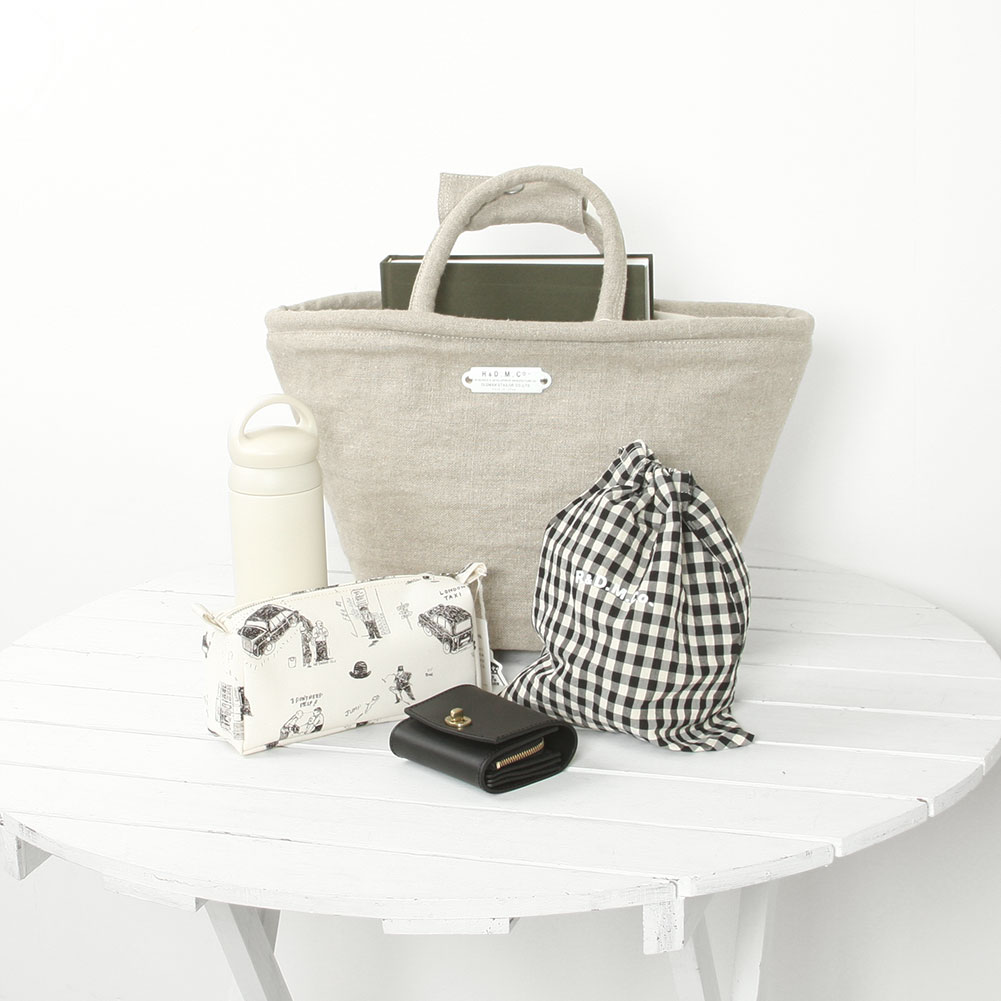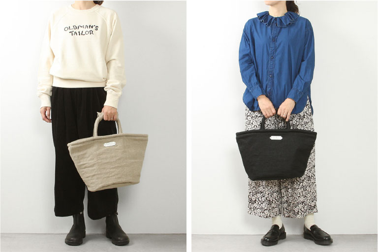シンプルな着こなしのアクセントになるR&D.M.Co-のマルシェバッグ。