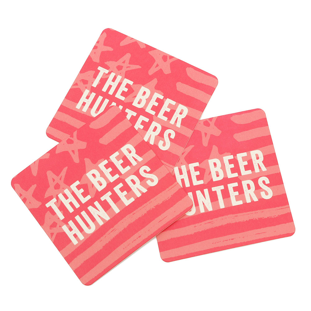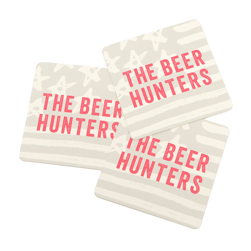 クラフトビールをこよなく愛するビアハンターたちのために製作した「THE BEER HUNTERS」コースターの第三弾が完成!筆書きストライプ&スター柄にHUNTER PINKが映えまくります。コースターは水滴をしっかりキャッチする専用紙を使用。3枚セットです。
