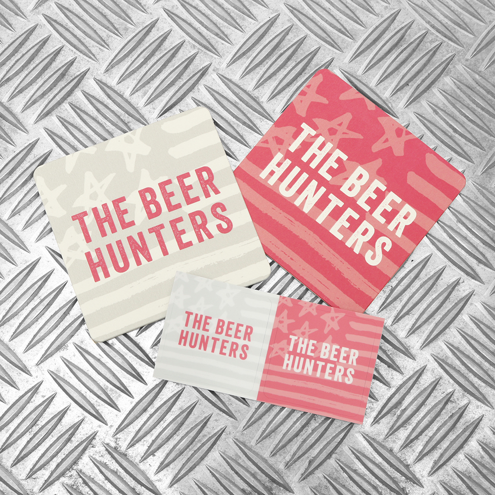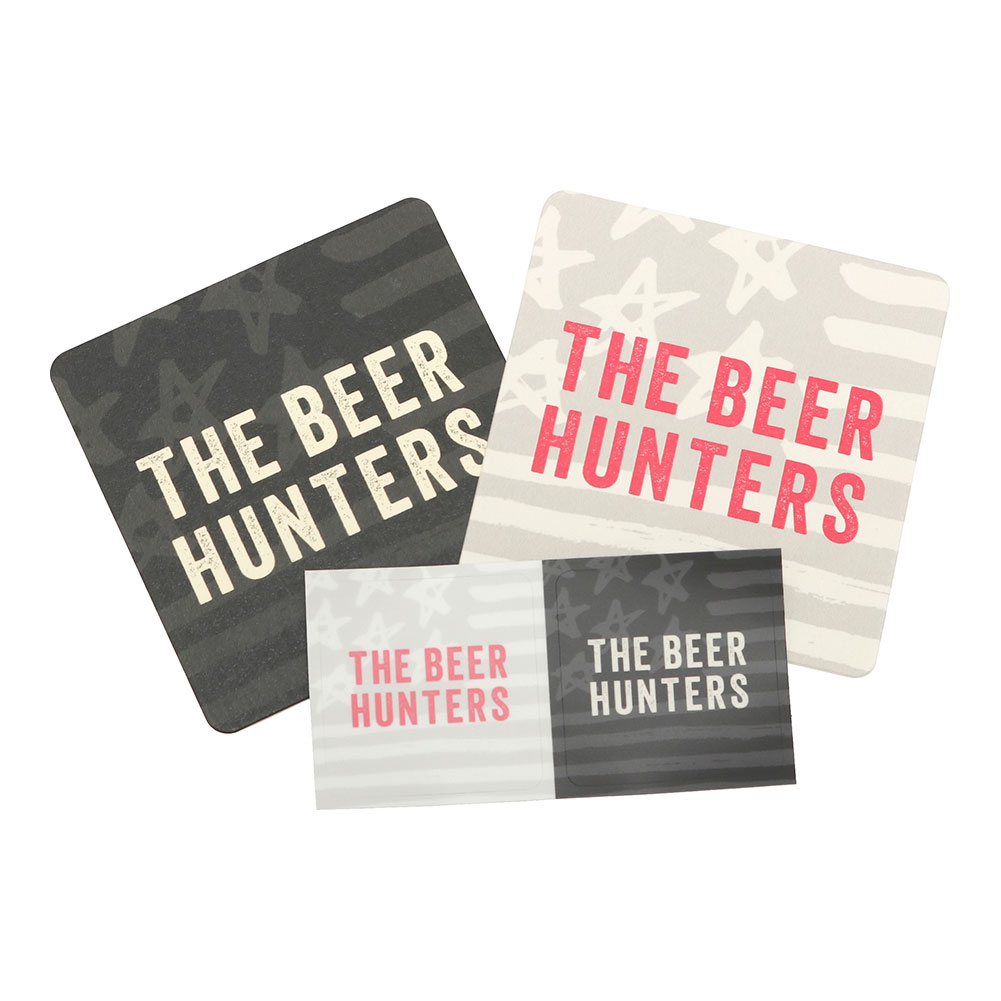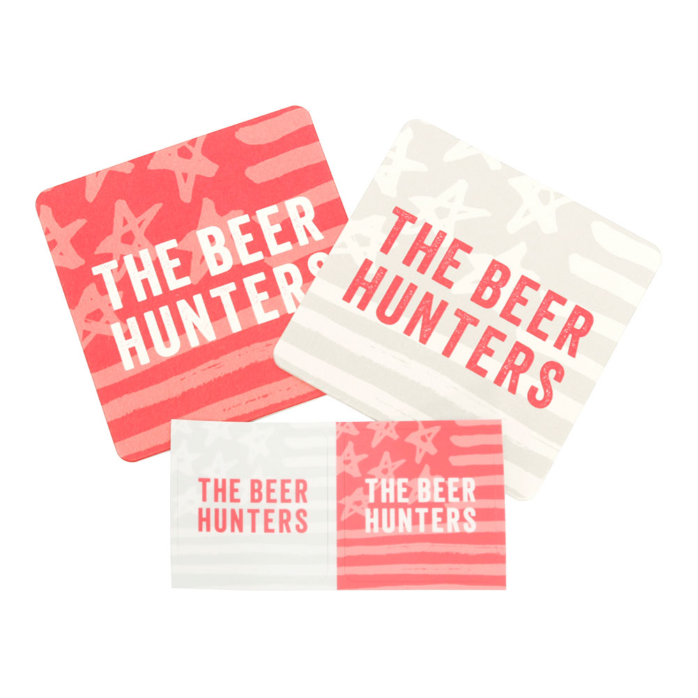 クラフトビールをこよなく愛するビアハンターたちのために製作した「THE BEER HUNTERS」コースター&ステッカーのセットです。筆書きストライプ&スター柄にHUNTER PINKが映えまくります。コースターは水滴をしっかりキャッチする専用紙を使用。ステッカーは耐水性・耐熱性ともに優れたポリエステルを素材とした光沢のない専用紙で屋外でも使用できます。
