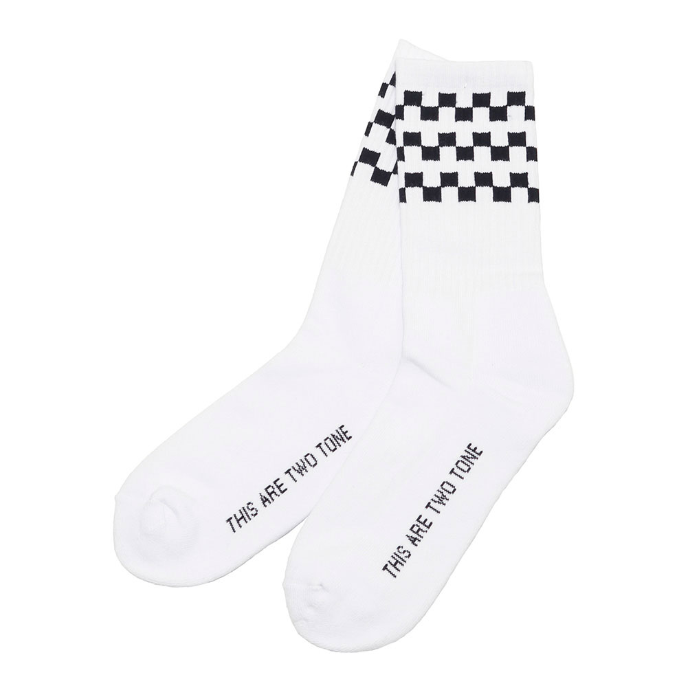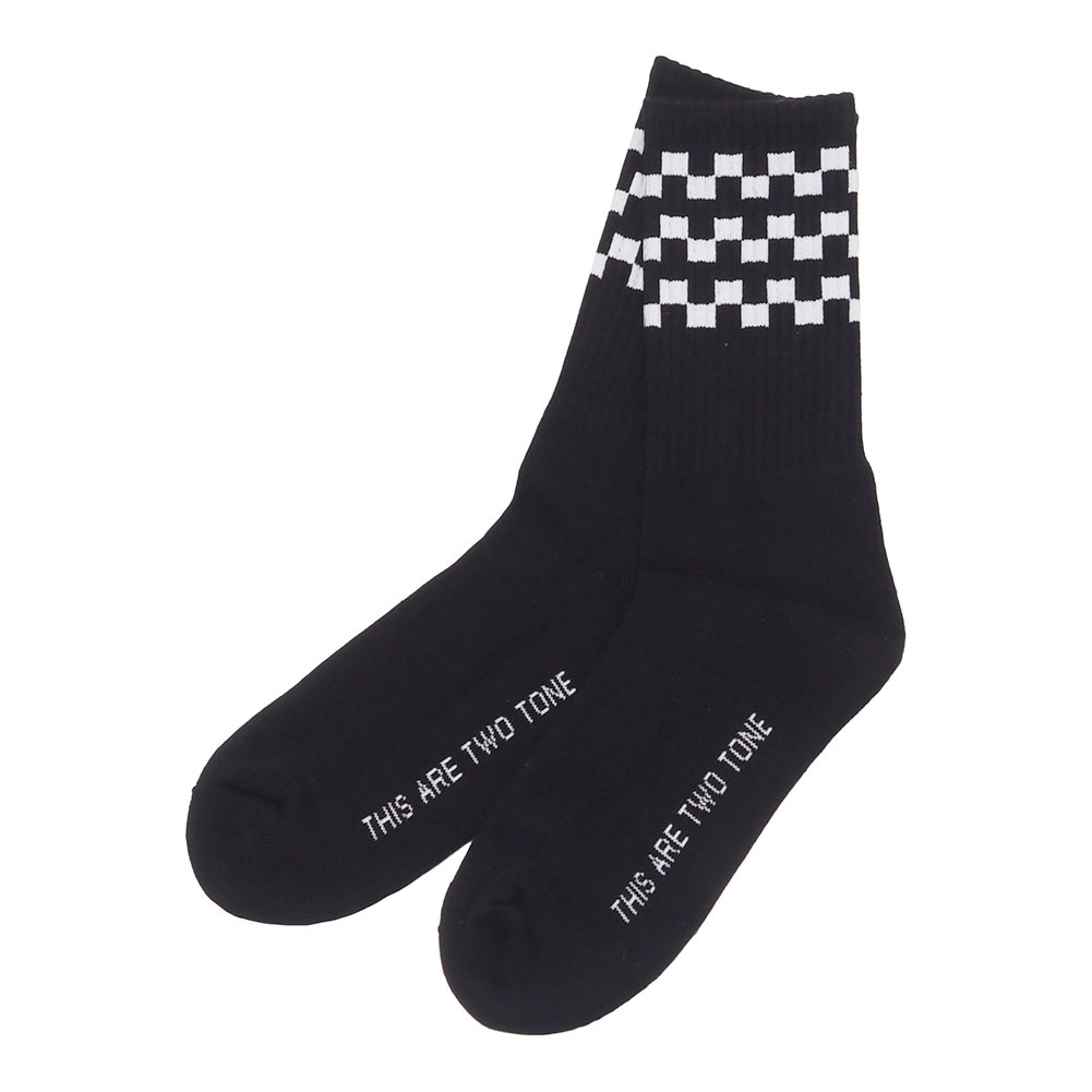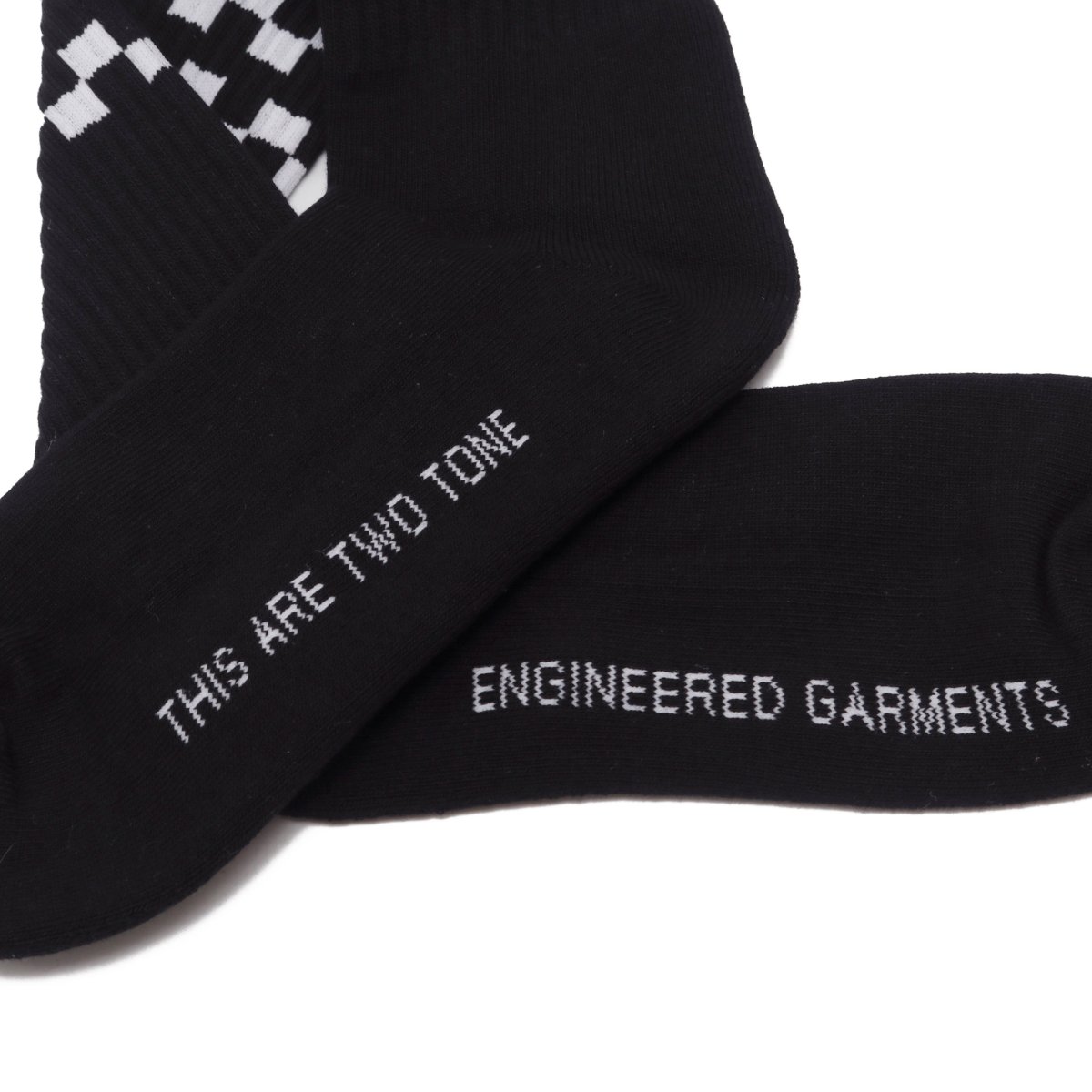 モノトーンチェッカー柄が新鮮なエンジニアドガーメンツらしさが漂うソックス。THIS ARE TWO TONEとENGINEERED GARMENTSの文字がプリントではなく織り仕様と拘った作りになっています。パーソナルギフトにもオススメなアイテムです。