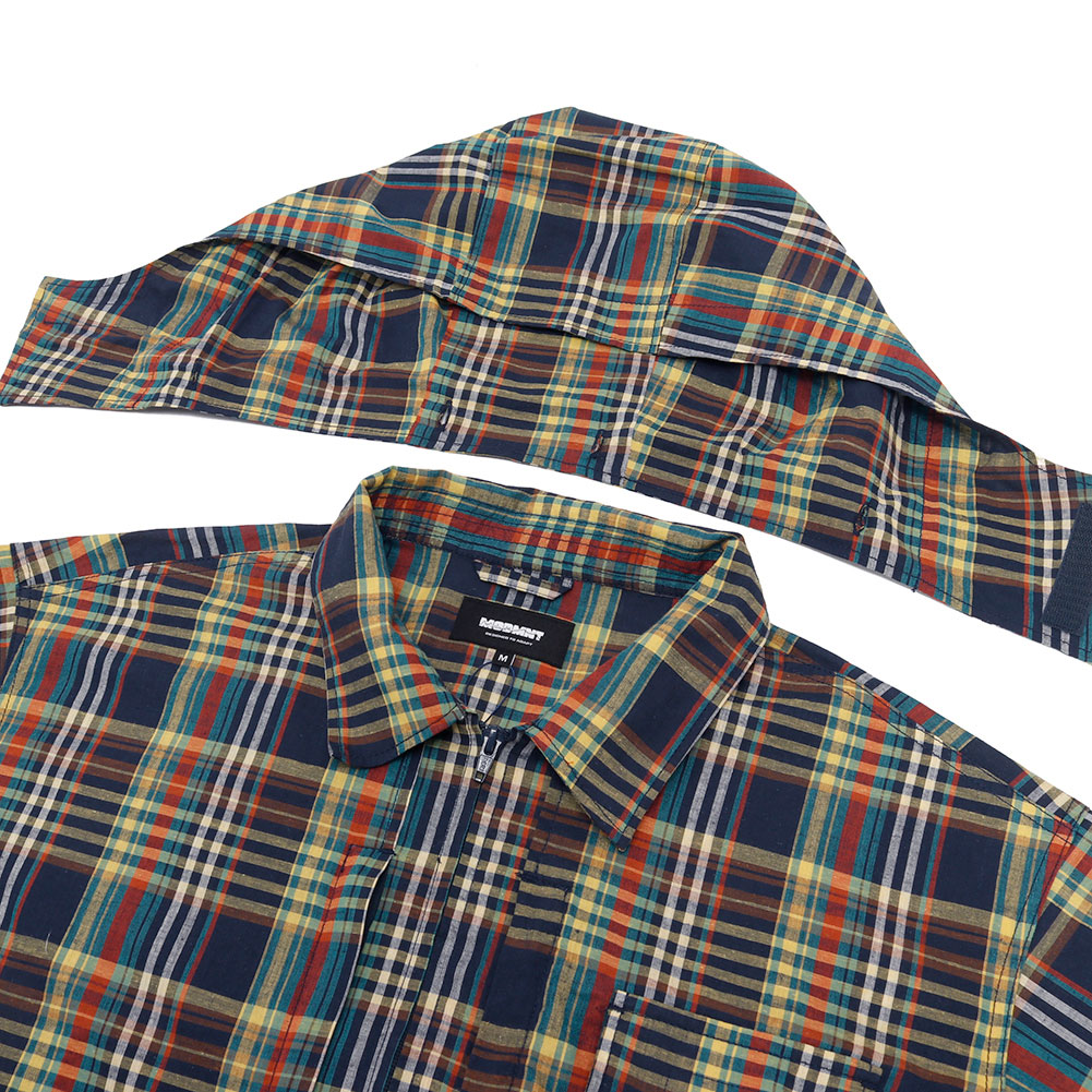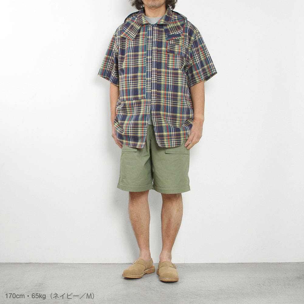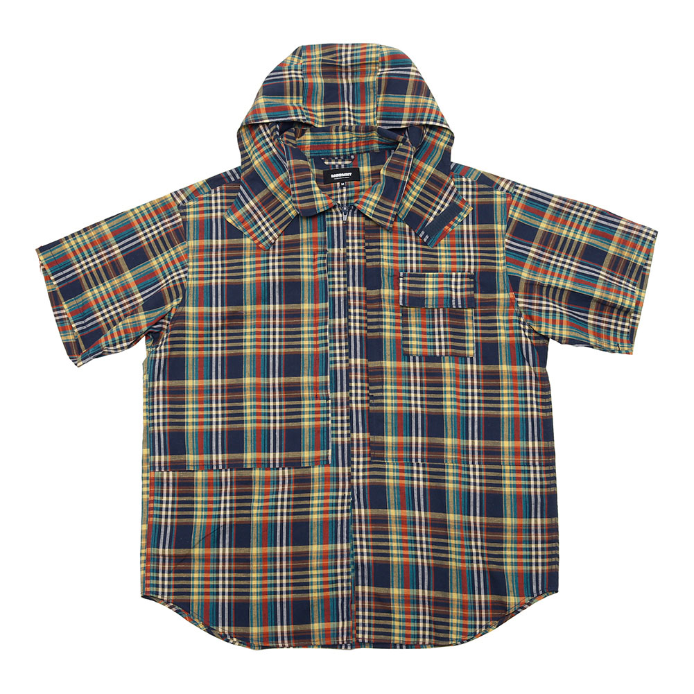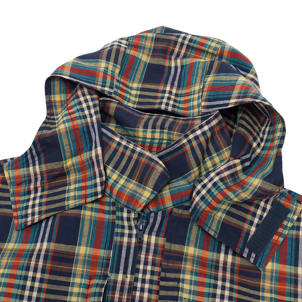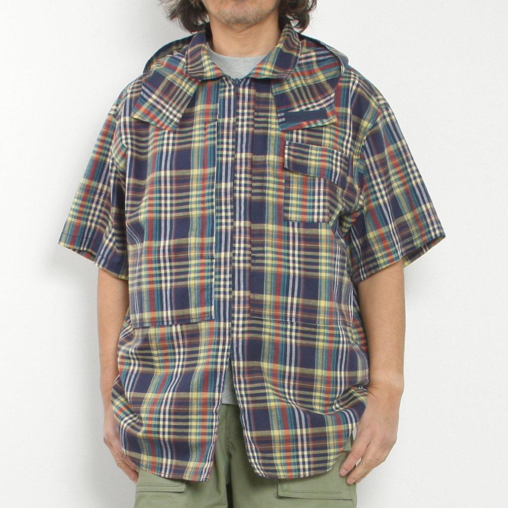 清涼感あるマドラスチェックを使用した、フードの着脱も可能なハーフスリーブシャツ。ボタンを使用しておらず、ジップの開閉で熱を放出可能なディテールで、胸にも両サイドにジップポケットが付属し、バッグ要らずのシャツに仕上がっています。