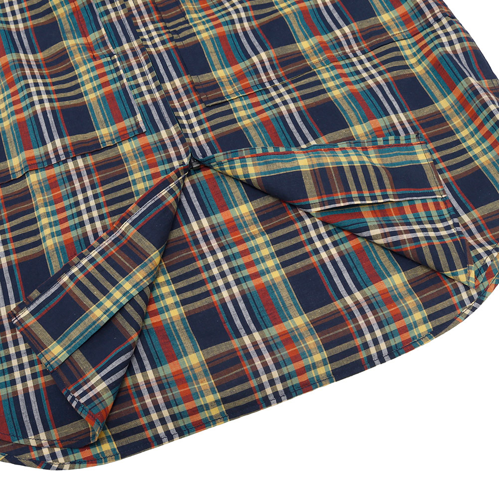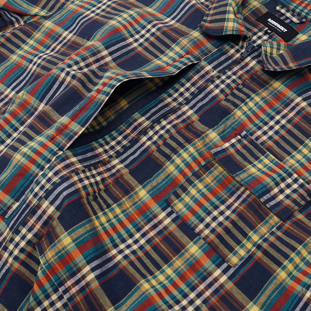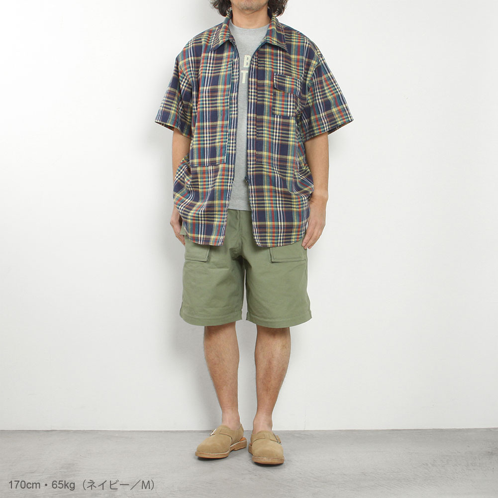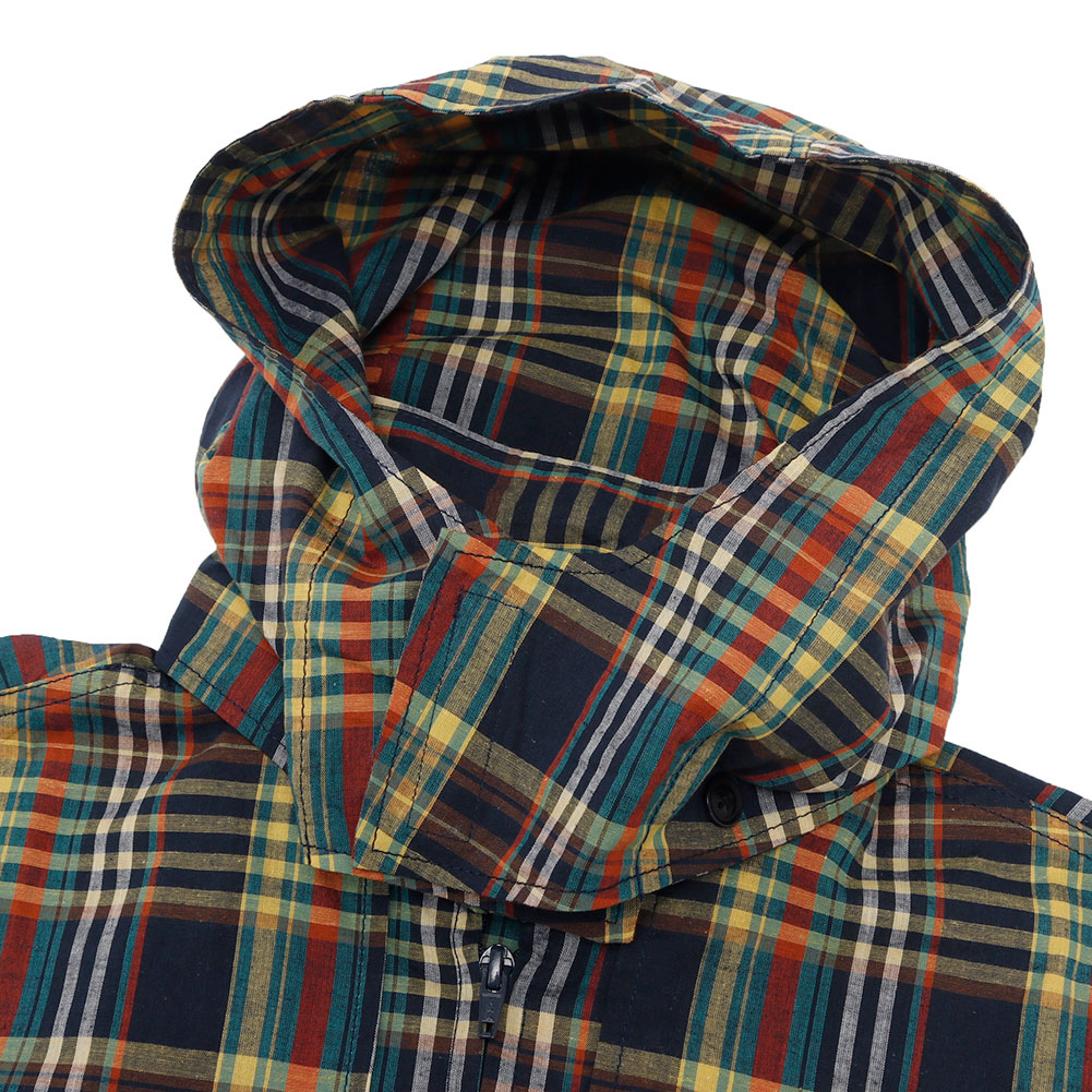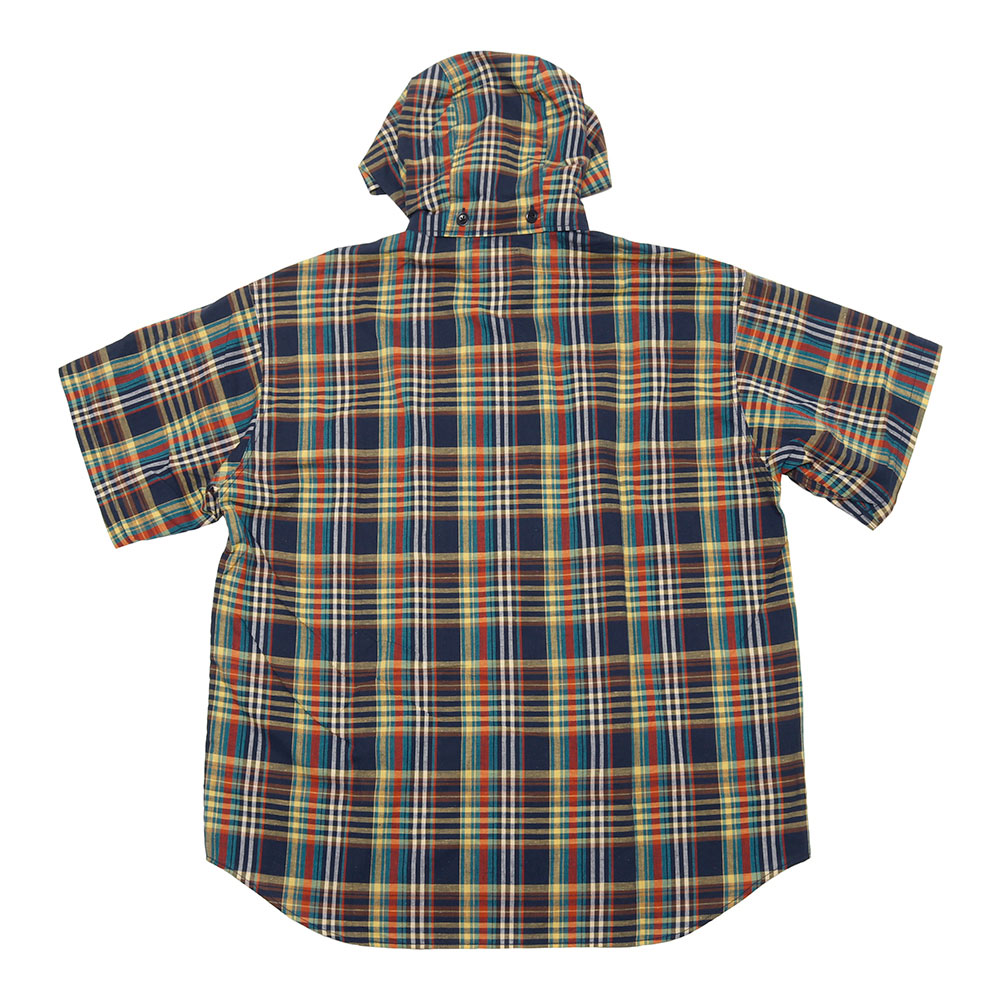 清涼感あるマドラスチェックを使用した、フードの着脱も可能なハーフスリーブシャツ。ボタンを使用しておらず、ジップの開閉で熱を放出可能なディテールで、胸にも両サイドにジップポケットが付属し、バッグ要らずのシャツに仕上がっています。