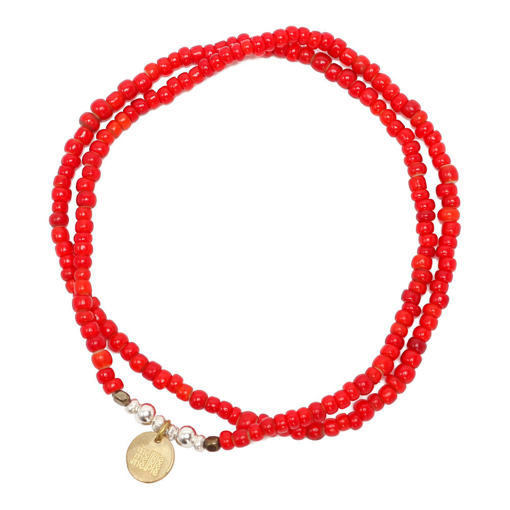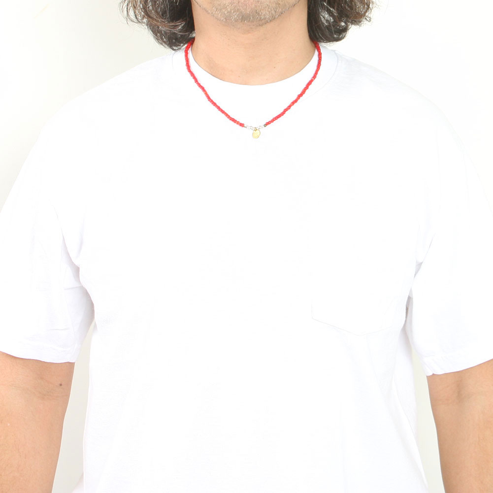 手元にも、足元にも。スタイリングに合わせて楽しめる、2WAY仕様のビーズアクセサリー。二重巻きでブレスレットやアンクレットとして、一重でネックレスとしても使える、自由度の高いデザインです。使用しているのは、発色の美しさで知られるホワイトハーツビーズ。コア(芯)の部分に白いガラスを配し、その周りに色ガラスを被せることで、奥行きのある鮮やかな色合いを生み出すのが特徴です。シンプルなTシャツスタイルやデニムスタイルのアクセントとして、さりげなくコーディネートに彩りを加えてくれます。ゴム仕様で着脱も簡単。夏のスタイリングに程よい個性を添えてくれるアクセサリーです。