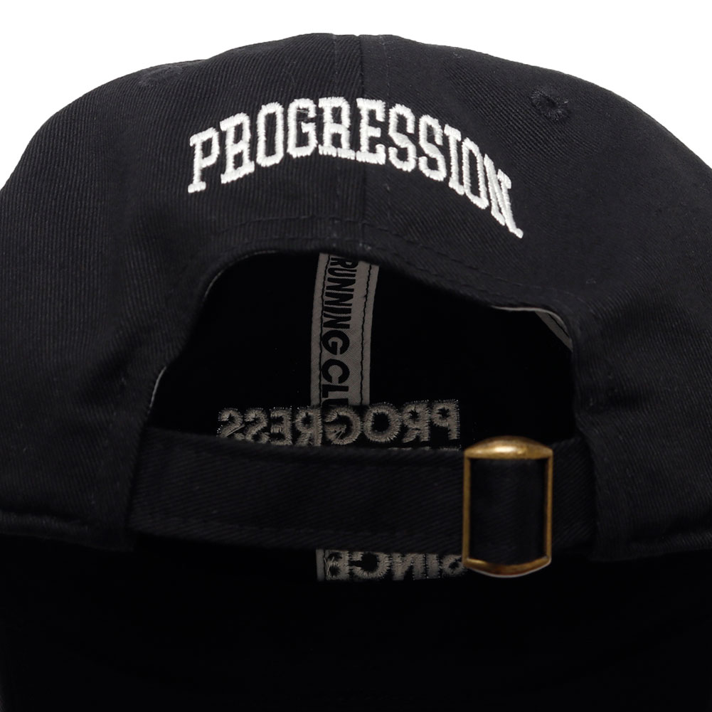 エイジング感のあるコットンキャンバスにオリジナルのグラフィックが刺繍されたキャップです。浅めのフィットで、バックルアジャスターで調節可能できユニセックスでお使いいただけます。 バックには "PROGRESSION" の刺繍がフロントと同色で入ります。