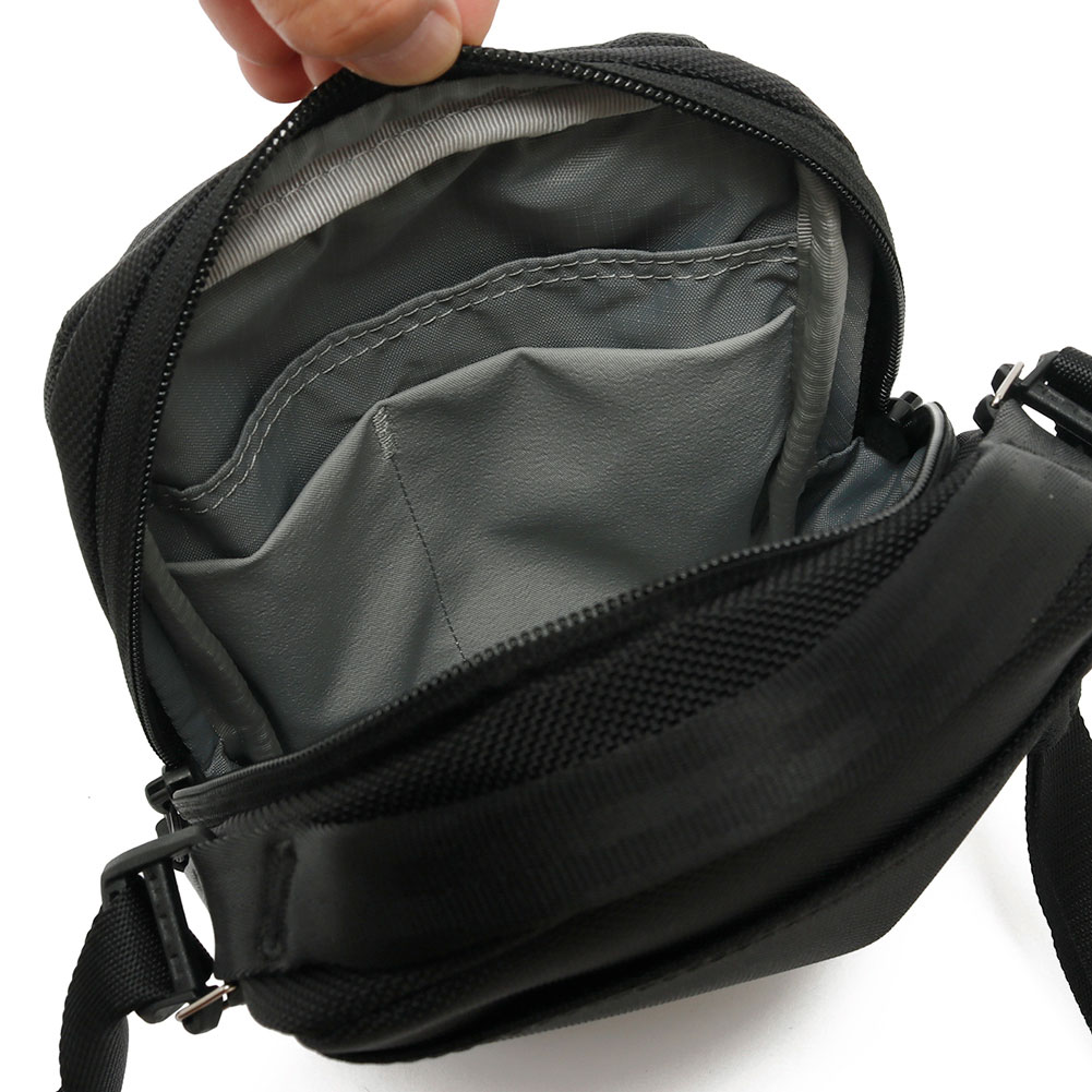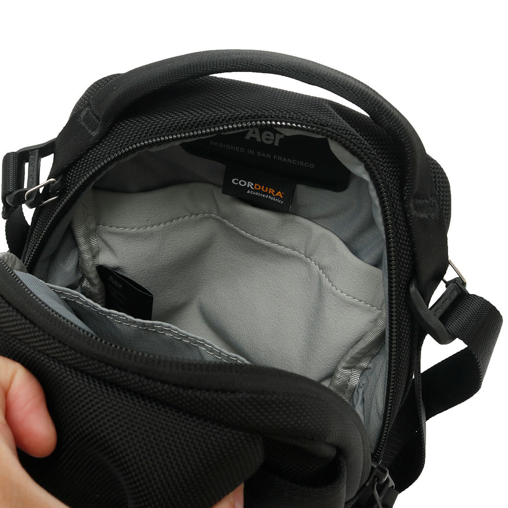 、フラットなアイテムを収納できる背面スリップポケット、そして調節・取り外し可能なクロスボディストラップ