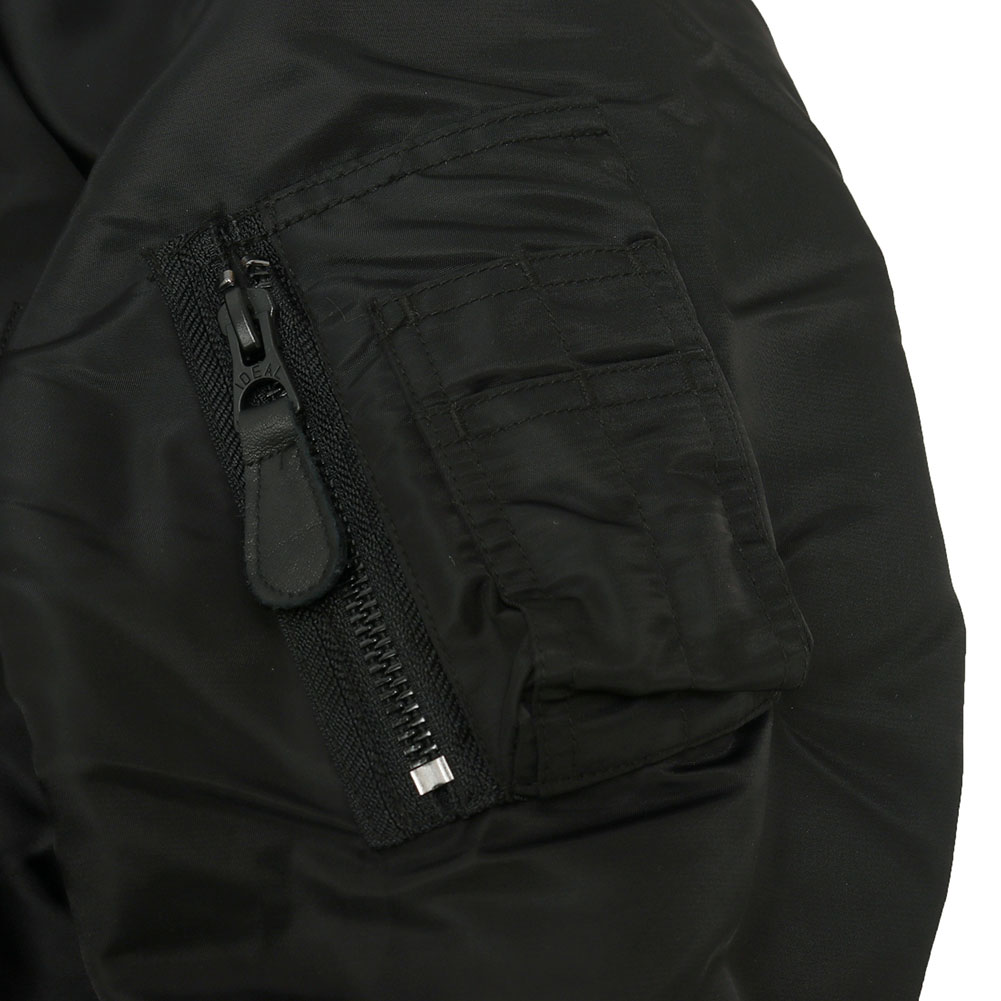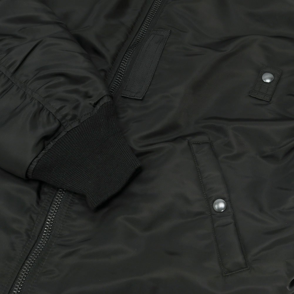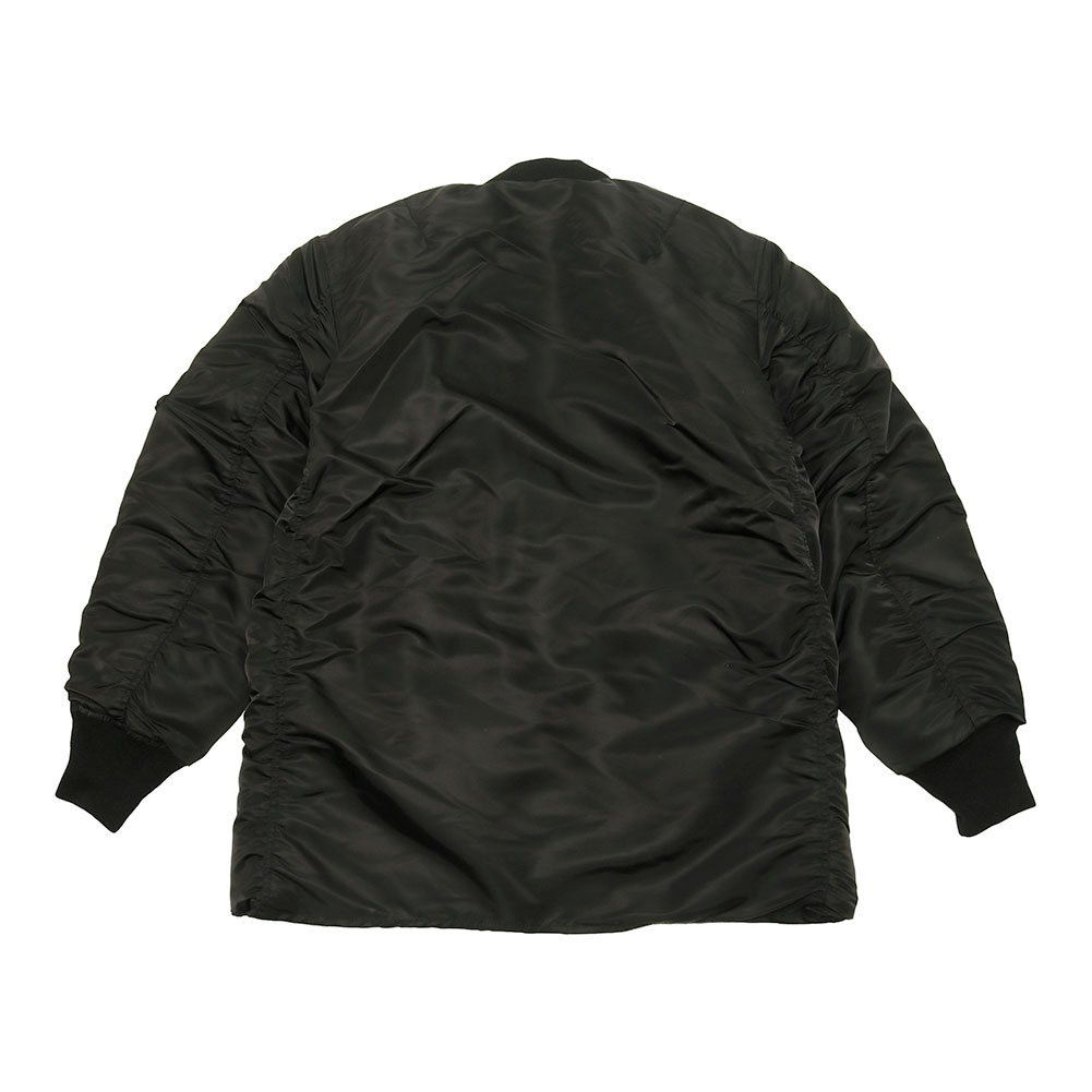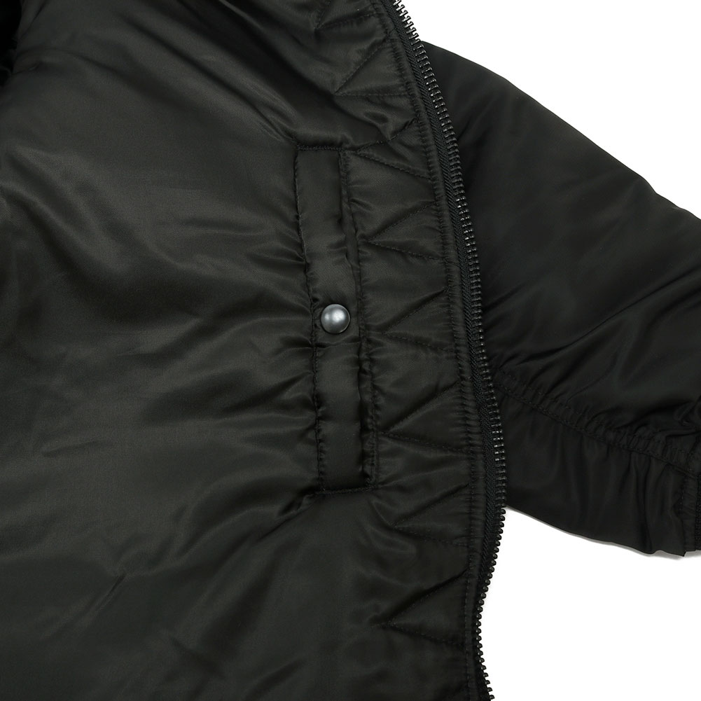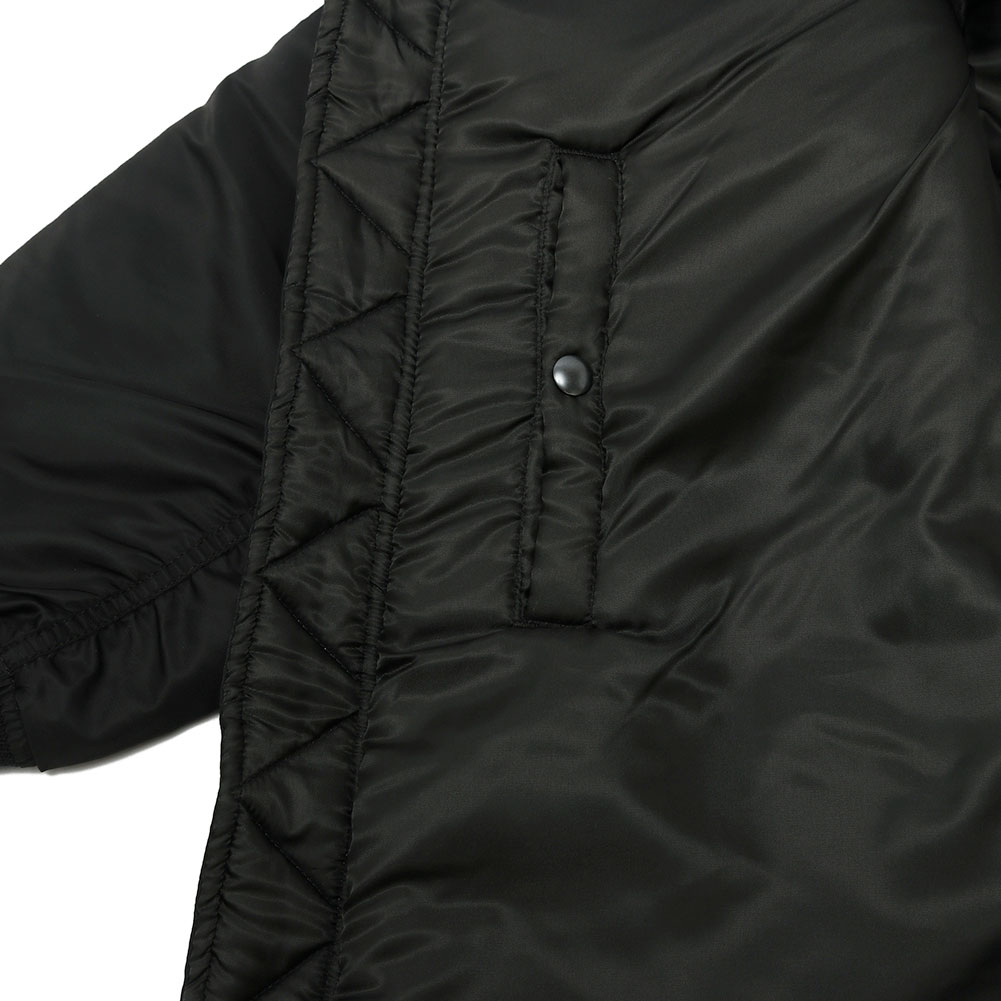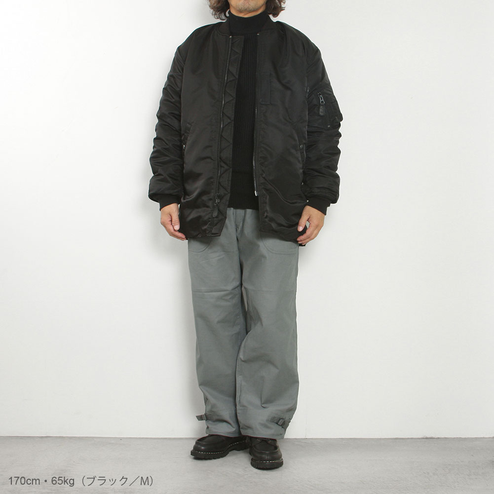 最も有名なフライトジャケットと言えば「MA-1」を連想する方が多いかと思います。今回はそんなフライトジャケットを象徴するMA-1をアレンジしたコートを製作しました。MA-1オールという名前の通り、カバーオールのようにお尻が隠れるハーフ丈のコートはありそうでないユニークなデザインとなっています。MA-1を象徴するディテールを残しつつも裾のリブを排除。ストンと裾まで伸びたストレートのシルエットはファラオコートと呼ばれるデザインに似ており、フライトジャケットのブルゾンとは違った印象を与えます。MA-1と言えばオレンジの裏地が印象的だと思いますが、年代ごとで多くのバリエーションが存在するのもMA-1の特徴です。MA-1オールは初期型のモデルを踏襲し、同色の裏地に胸のボックスタブ、両脇のICSコードループなど最も初期のディテールを再現。アームホールの立体的な構造は腕が前に振られた状態で可動域も広く、なおかつ着用した際に袖口に生地が溜まるヴィンテージのフライトジャケットのような着心地にこだわりました。 裾のファスナーは開き位置を上にすることで前を閉めた状態でも足が動かしやすく快適な着心地となっています。