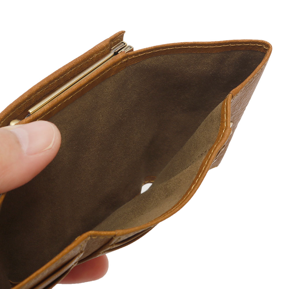 天然の風合いや独特のシボ感が、ワイルドでありながら洗練された佇まいが魅力です。一つとして同じものはない個性を演出します。新品の状態から、まるでヴィンテージのようなこなれた風合いを楽しめるのも特徴です。柔らかな印象のフラップデザインと、カチッとした口金の組み合わせが絶妙なバランスを生み出しています。コンパクトながらも、複数のカードポケットや仕切りを備えており、見た目以上の収納力と使いやすさを両立。普段使いはもちろん、個性的なファッションがお好みの方におすすめしたい逸品です。