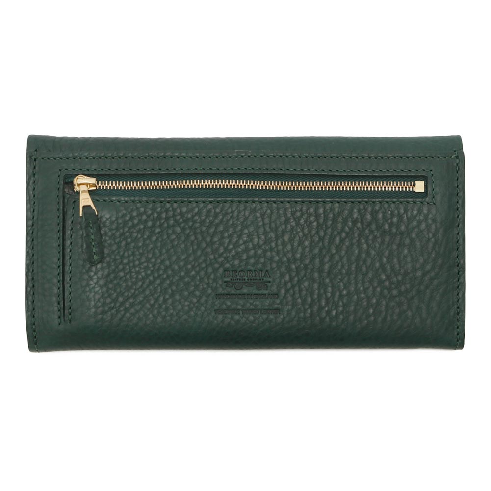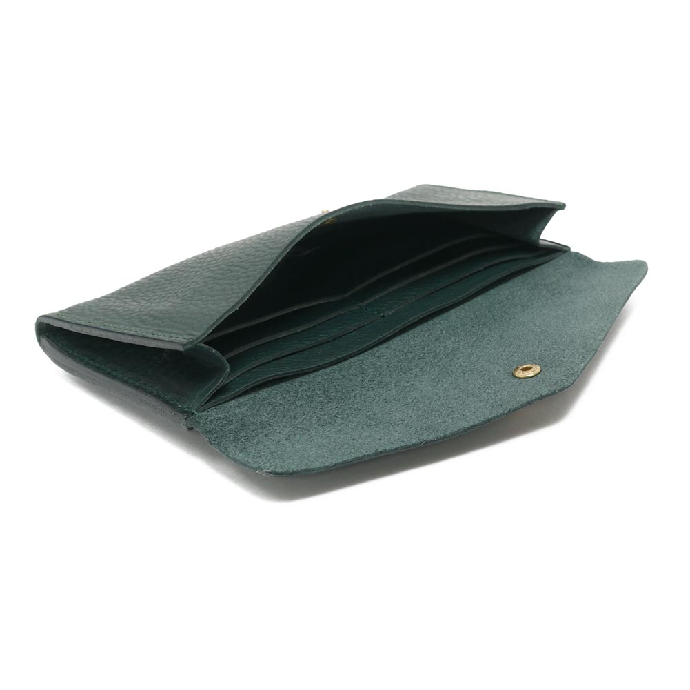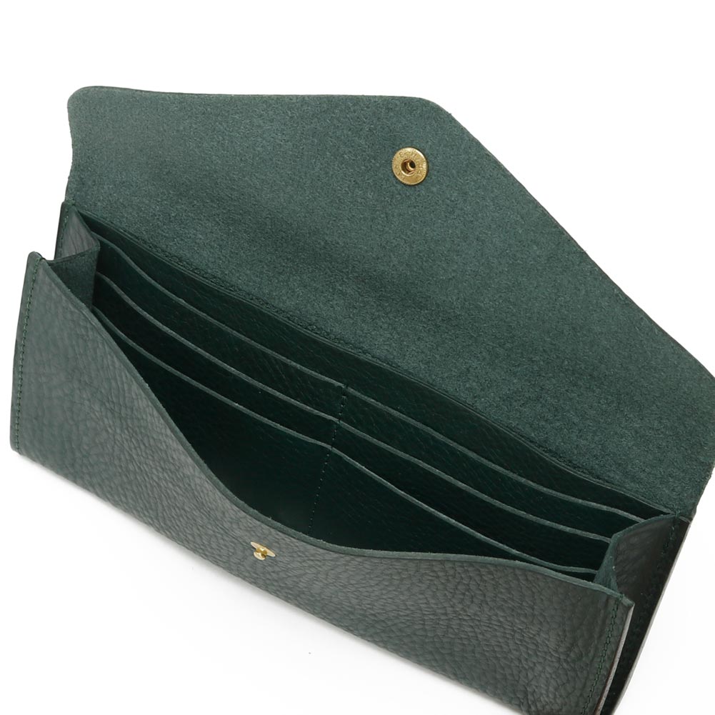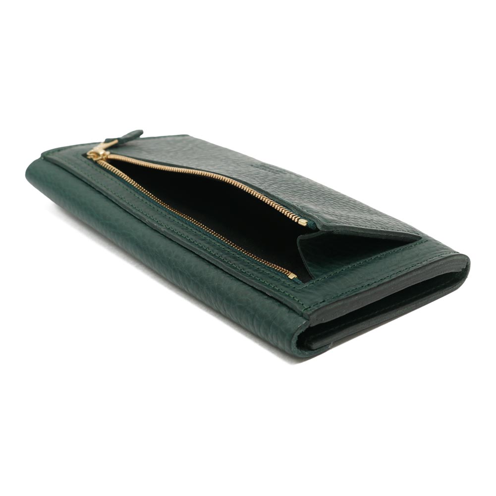 エンベロープ(封筒)型のロングウォレットは中身の視認性と収納性の高さが魅力です。内装には紙幣を折らずに入れることができる収容スペースに6つのカードポケットとレシートなどを入れるフリーポケットを、背面にはriri社製ジップが付いたワイドなコインポケットを備えています。