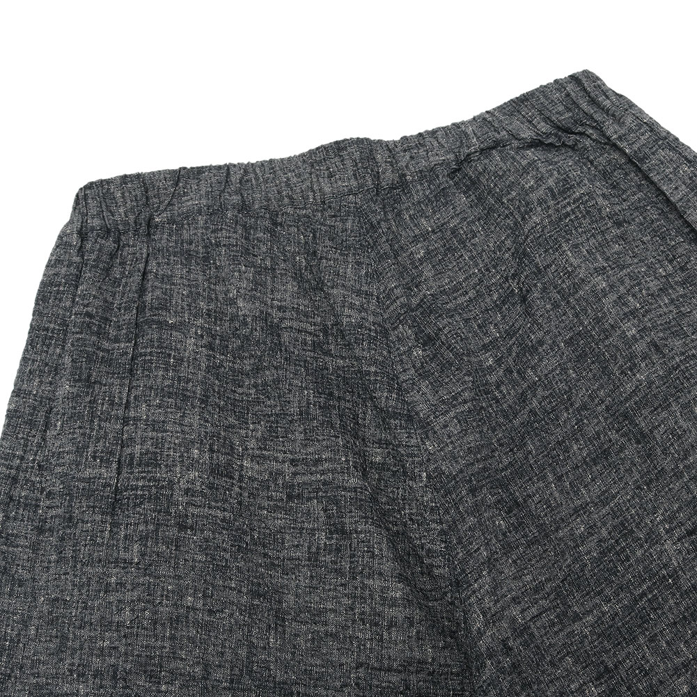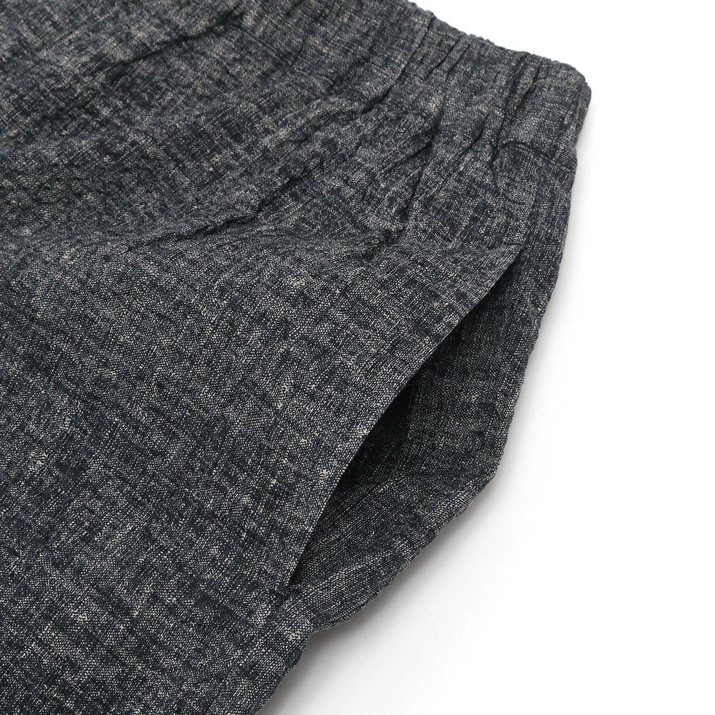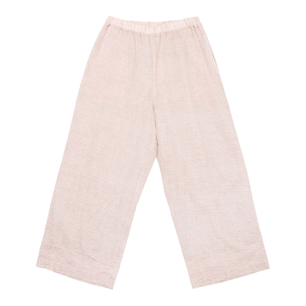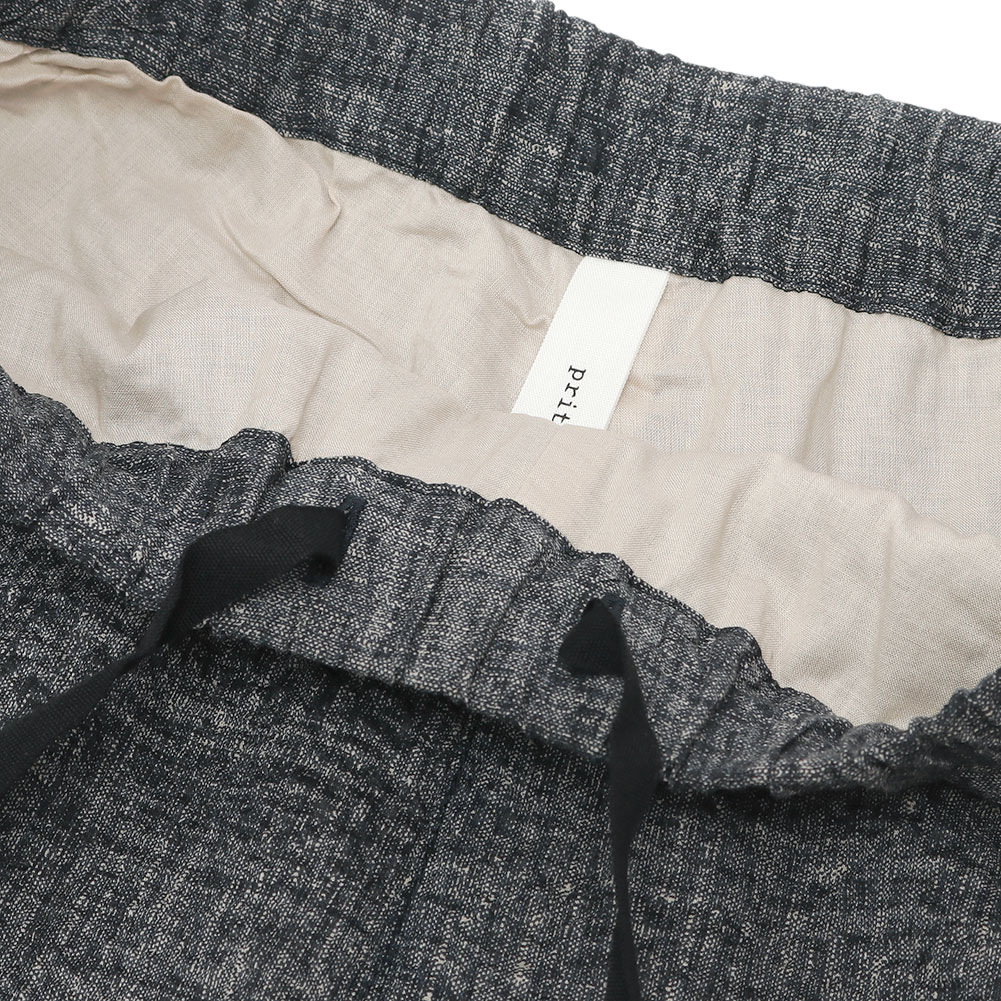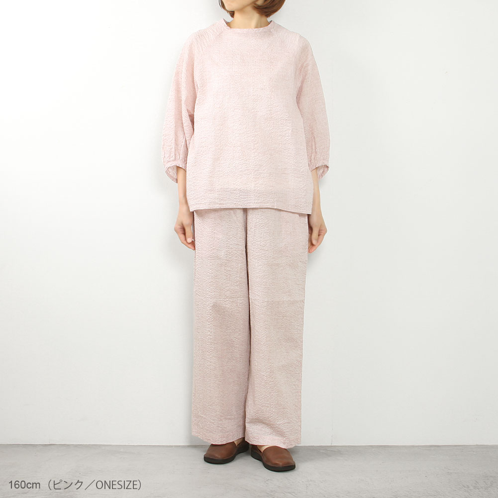 凹凸のある生地でサラっとして涼しいです。コットン生地の裏地も付いてるので透ける心配は無いです。ウエストはゴムと紐仕様になっていてリラックスして穿けます。