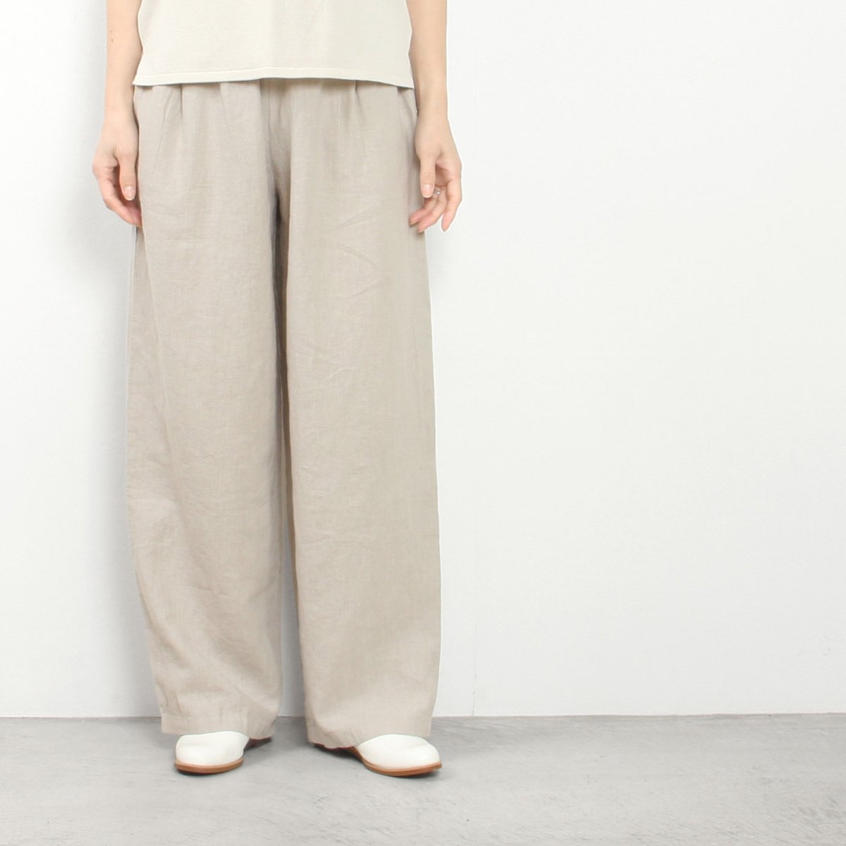涼しげなワイドパンツは、ゆったり穿けるリラックスシルエット。落ち感があるため、ワイドでもすっきりとした印象です。通年使えるリネンは春夏には清涼感を、秋冬には着こなしに奥行きを与えてくれます。