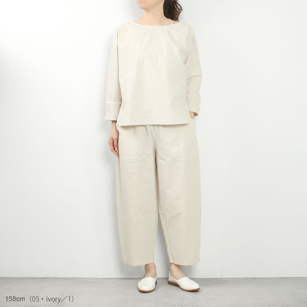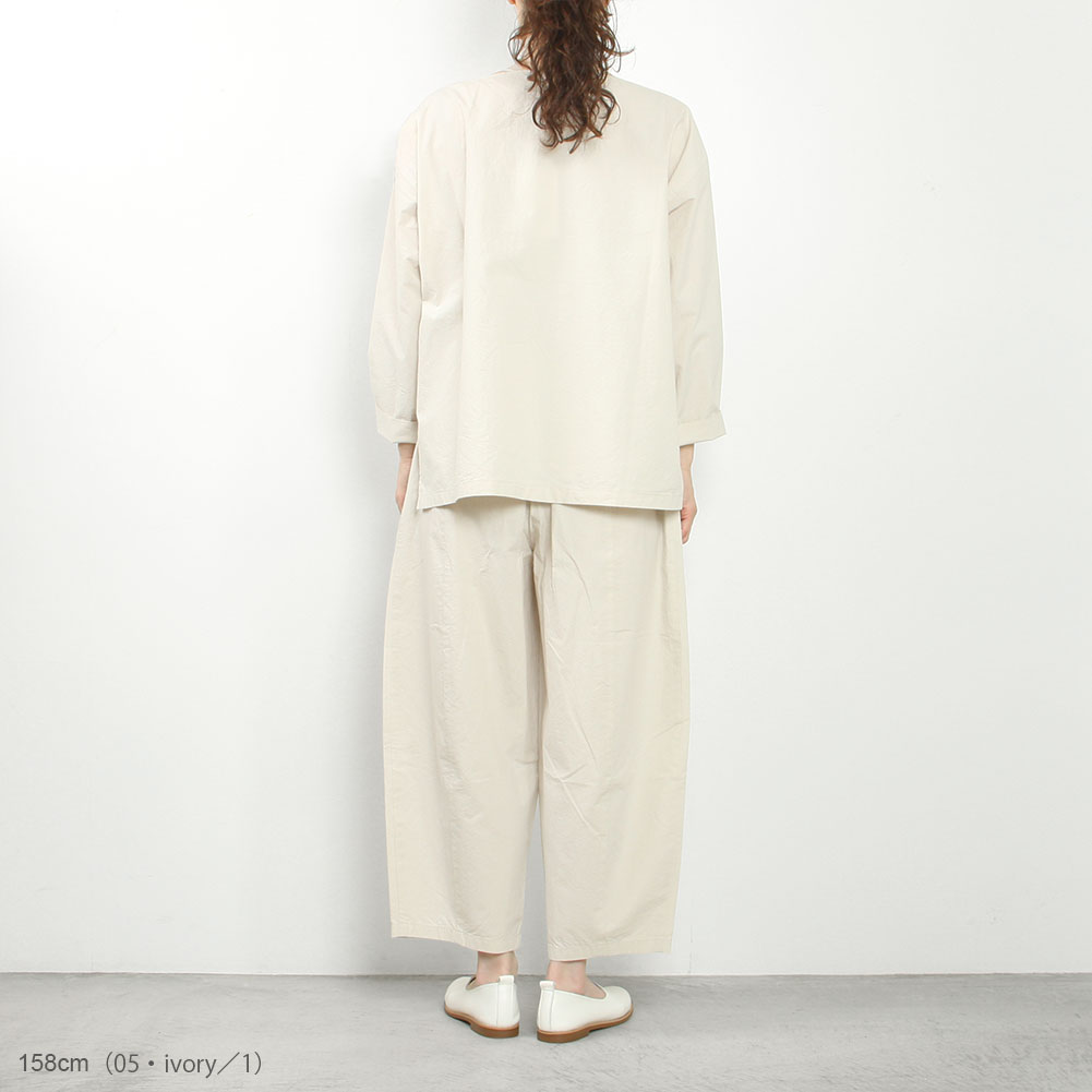 程よいハリ感と柔らかさを併せ持ったコットン素材のパンツ。ヒップ周りはゆとりがありつつも、裾にかけてゆるやかにテーパードを効かせることで、すっきり見えるようデザインされています。また、ドロップポケットもさりげないアクセントに。足元が軽くなるクロップド丈がこれからの季節にぴったりです。