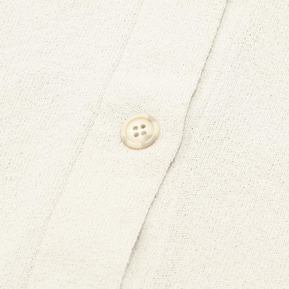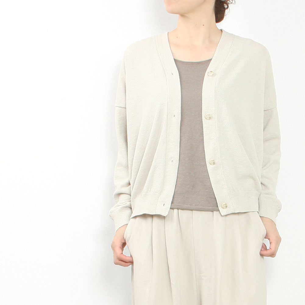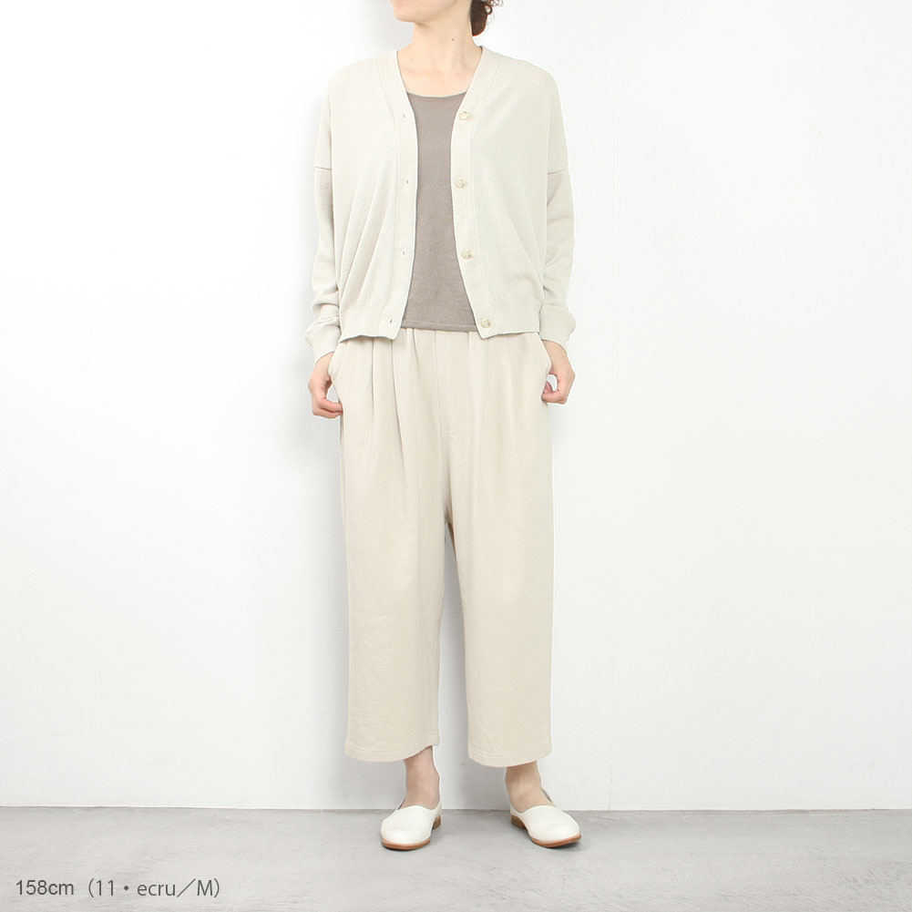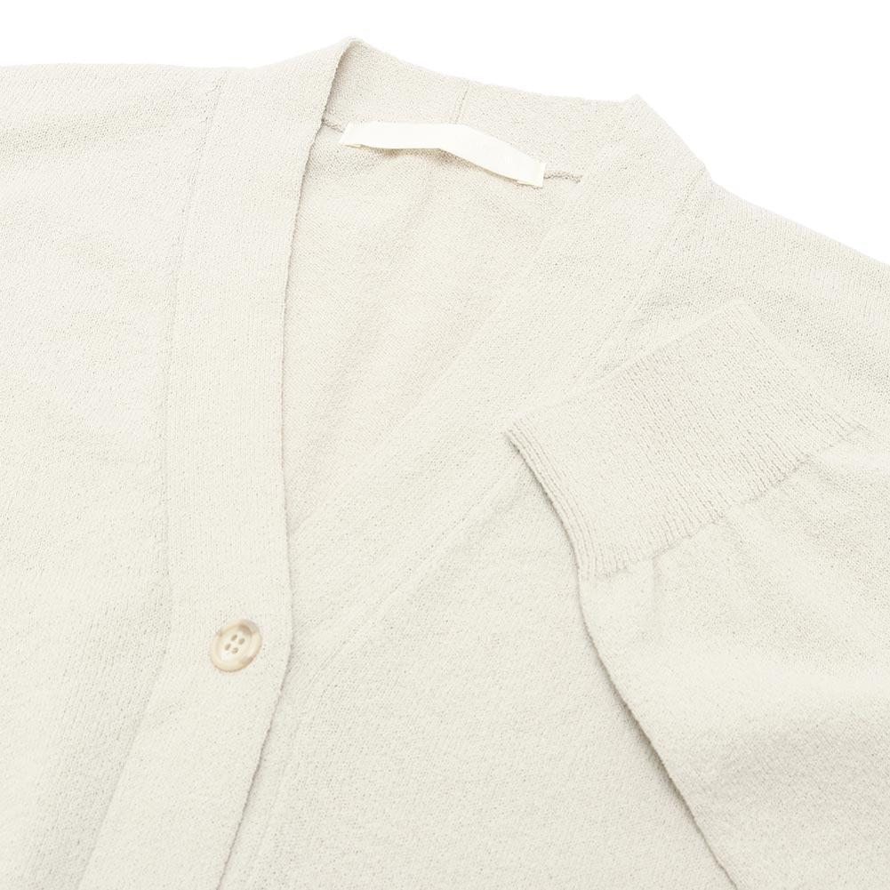 肌離れのいいドライなタッチのカーディガン。程よいゆとりがありながら、ニットならではの落ち感があるため、どこか華奢に見えるデザインです。短めの着丈は、ワイドパンツやスカート、ワンピースともバランスよくコーディネートしていただけます。季節の変わり目に持っておきたいアイテムです。