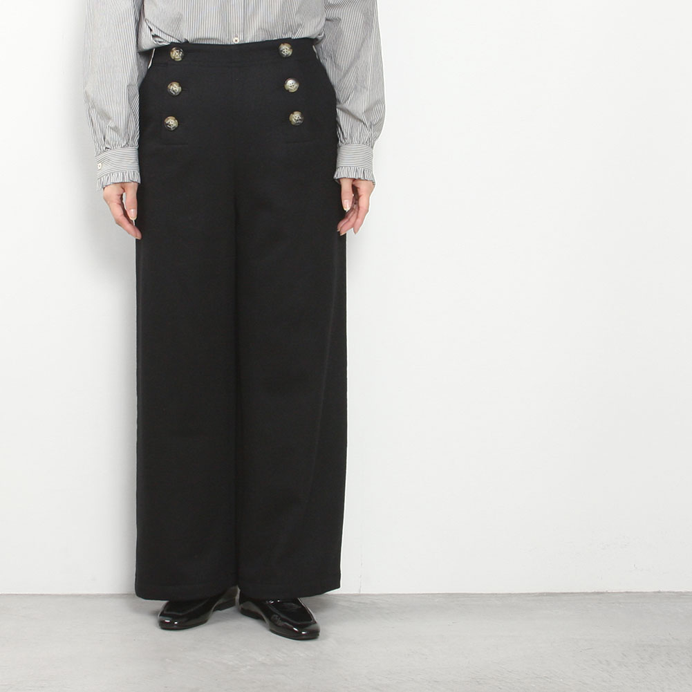 シーズン毎に買い足したくなるほど、シルエットが好評のマリンパンツで、定番人気のシルエットに暖かみのある圧縮ウールの生地で季節感溢れる一枚に仕上がっています。裏地はポリエステルとコットン素材が付いておりチクチクしません。 お腰回りはスッキリとしたシルエットで、程よいワイド感は小柄な方でもバランスが取りやすく、コーディネートもしやすいですよ。