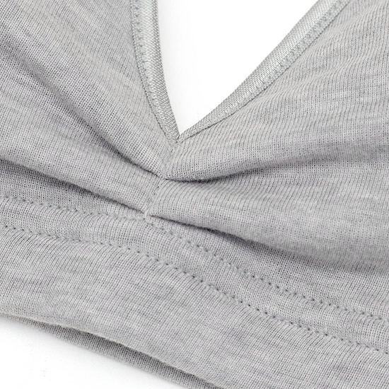 スープレルース定番素材、スポーティーなメランジグレーが特徴のしなやかな肌触りのエジプト綿ギザコットンを使用。大人の女性にぴったりなシンプルなデザインです。アンダーは少し幅広のゴムですので、バストの収まりがが良い仕様になっています。後ろの金具を気にせず着用できるよう、かぶって着るタイプです。