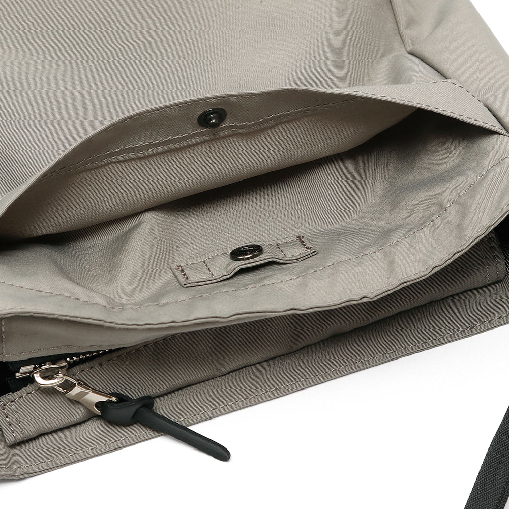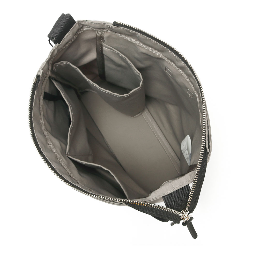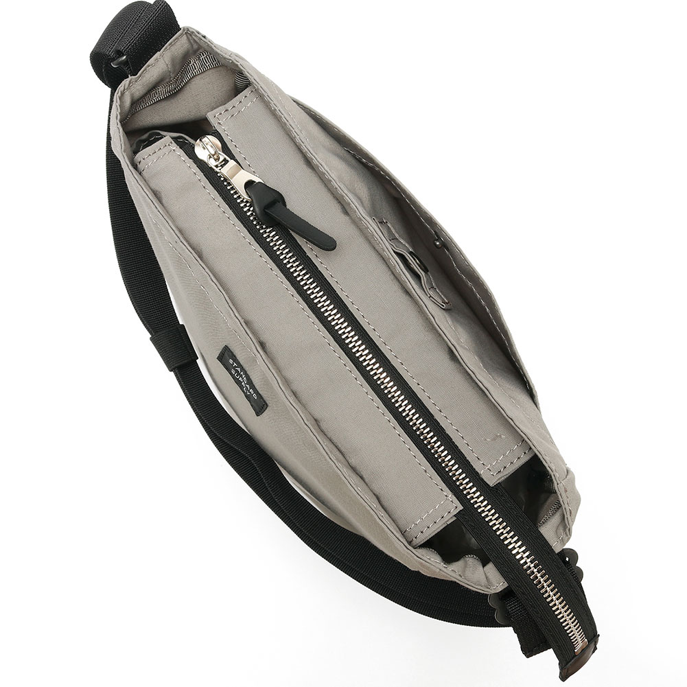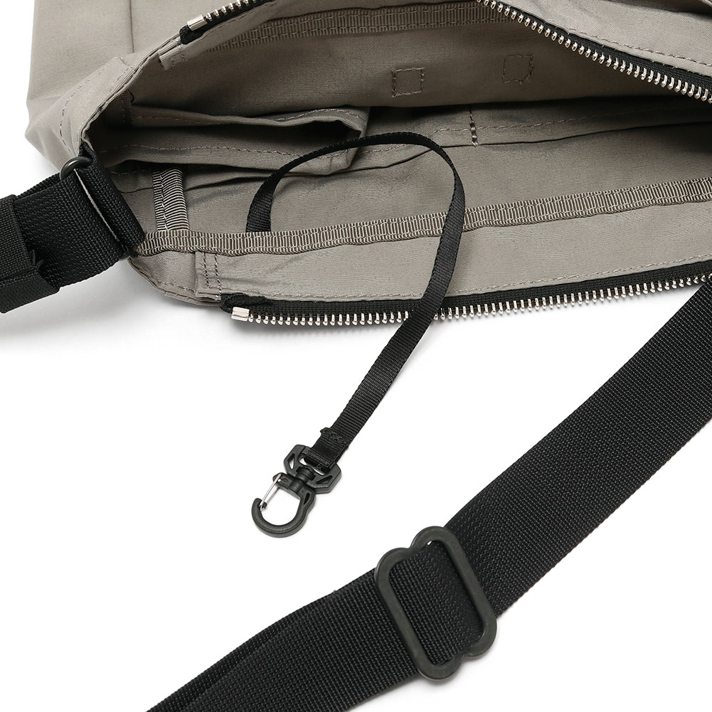 メインスペースの前面側には仕切りポケットとキーストラップが付いています。メインスペースの片側サイドにはペットボトルなどが入るホルダーがあり、ウォーキングなどの際にも便利です。