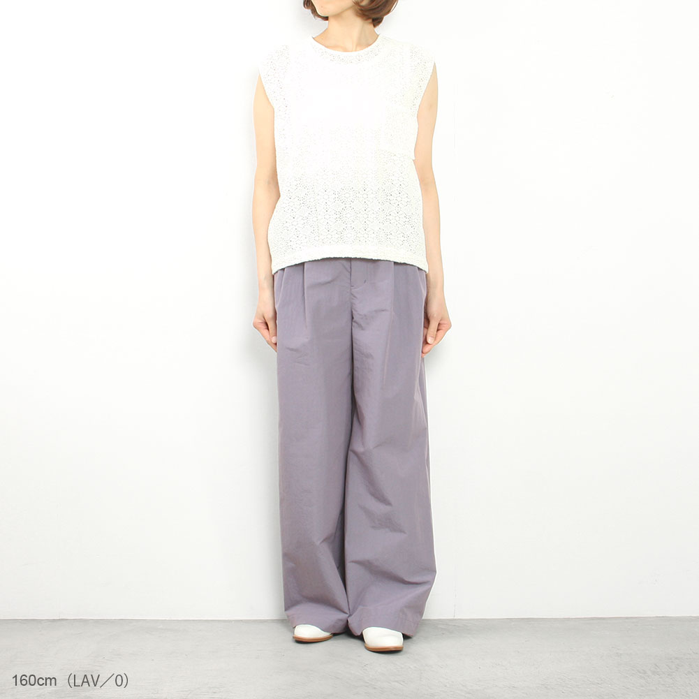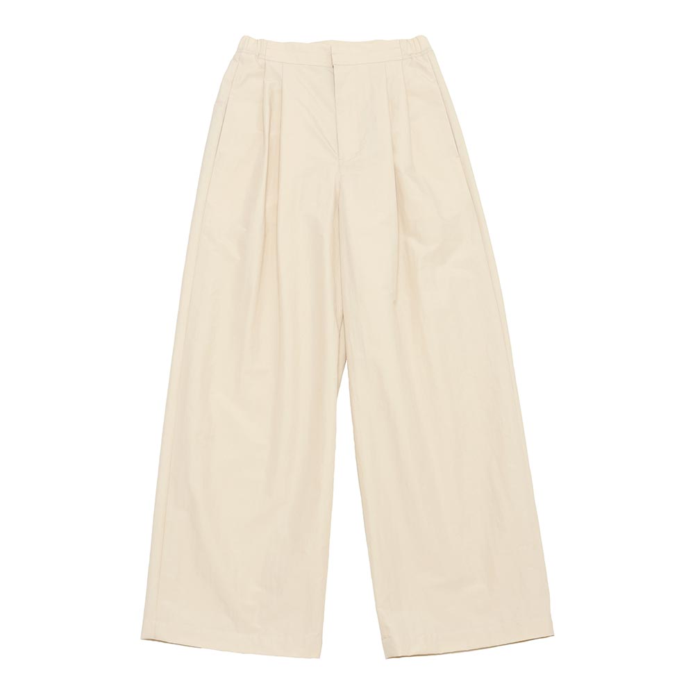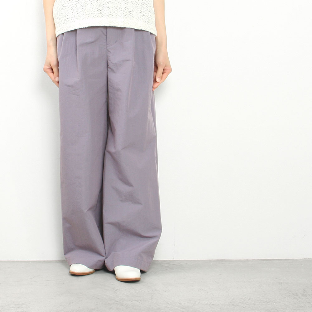 コットンナイロン素材を使用したタイプライターワイドパンツ。