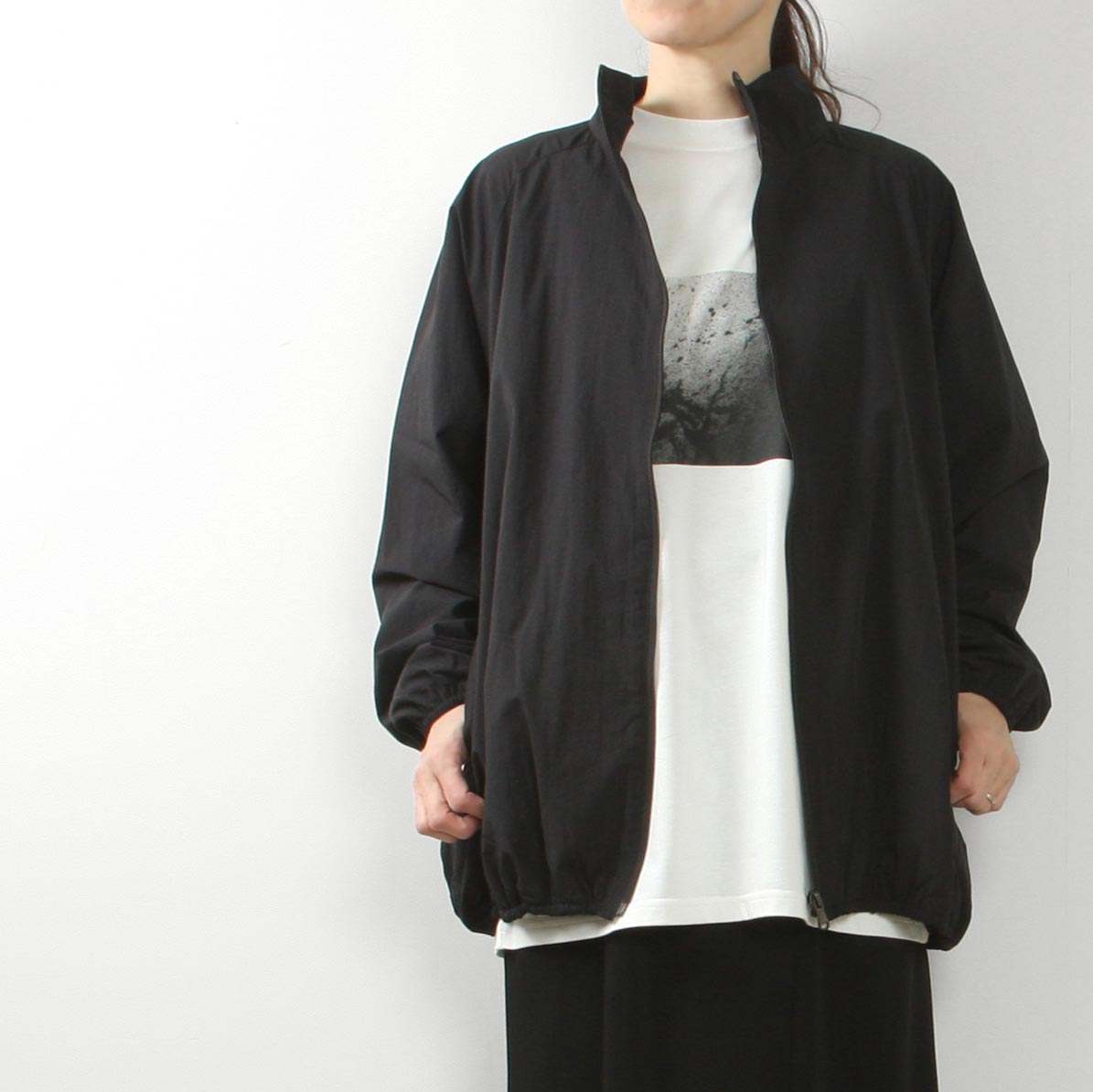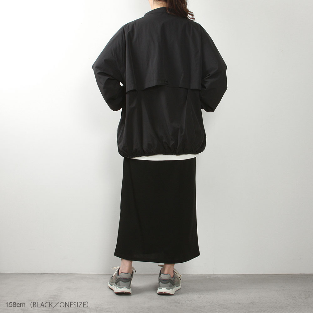 裾を絞ると丸みが出て立体的に。1枚持っていると重宝してくれるアイテム。スポーティになりすぎず、大人カジュアルに着こなせそうです。