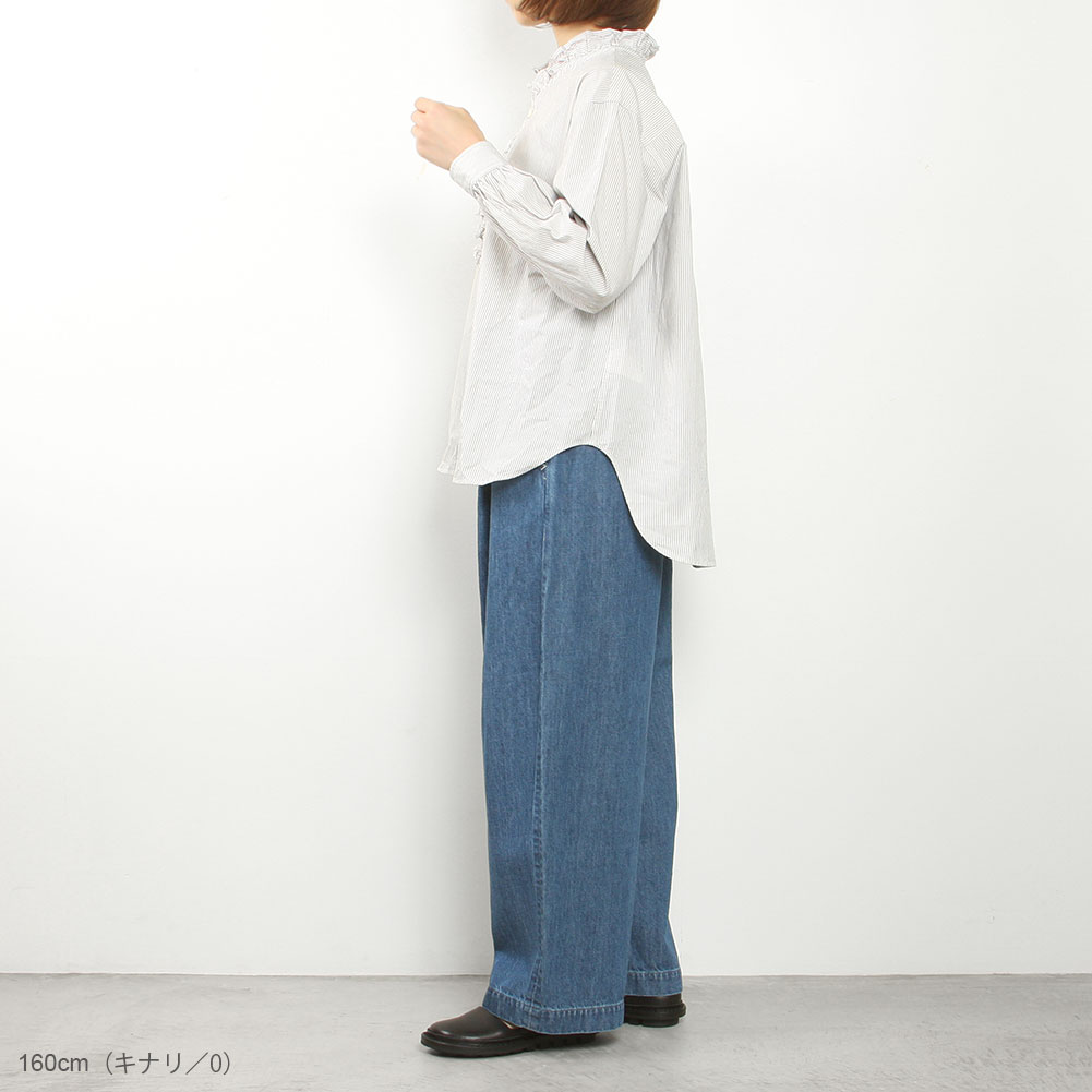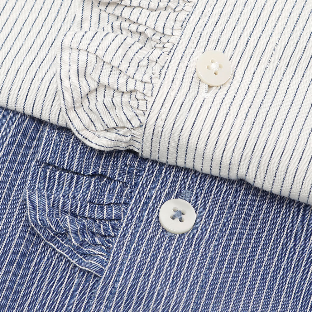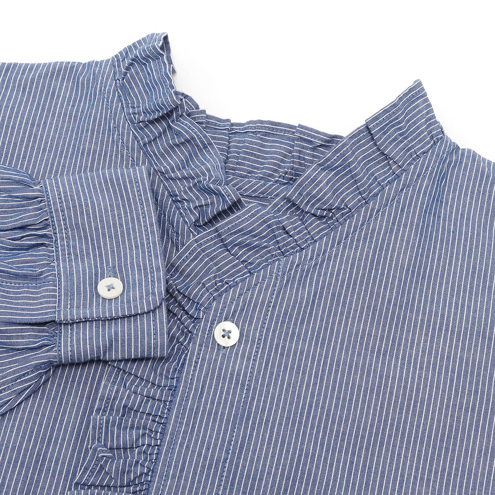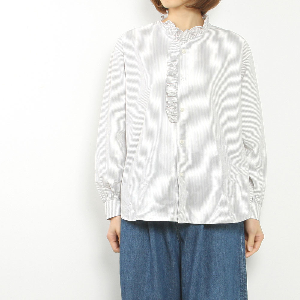 ストライプ柄が爽やかなVネックフリルシャツ。