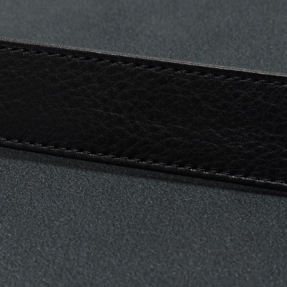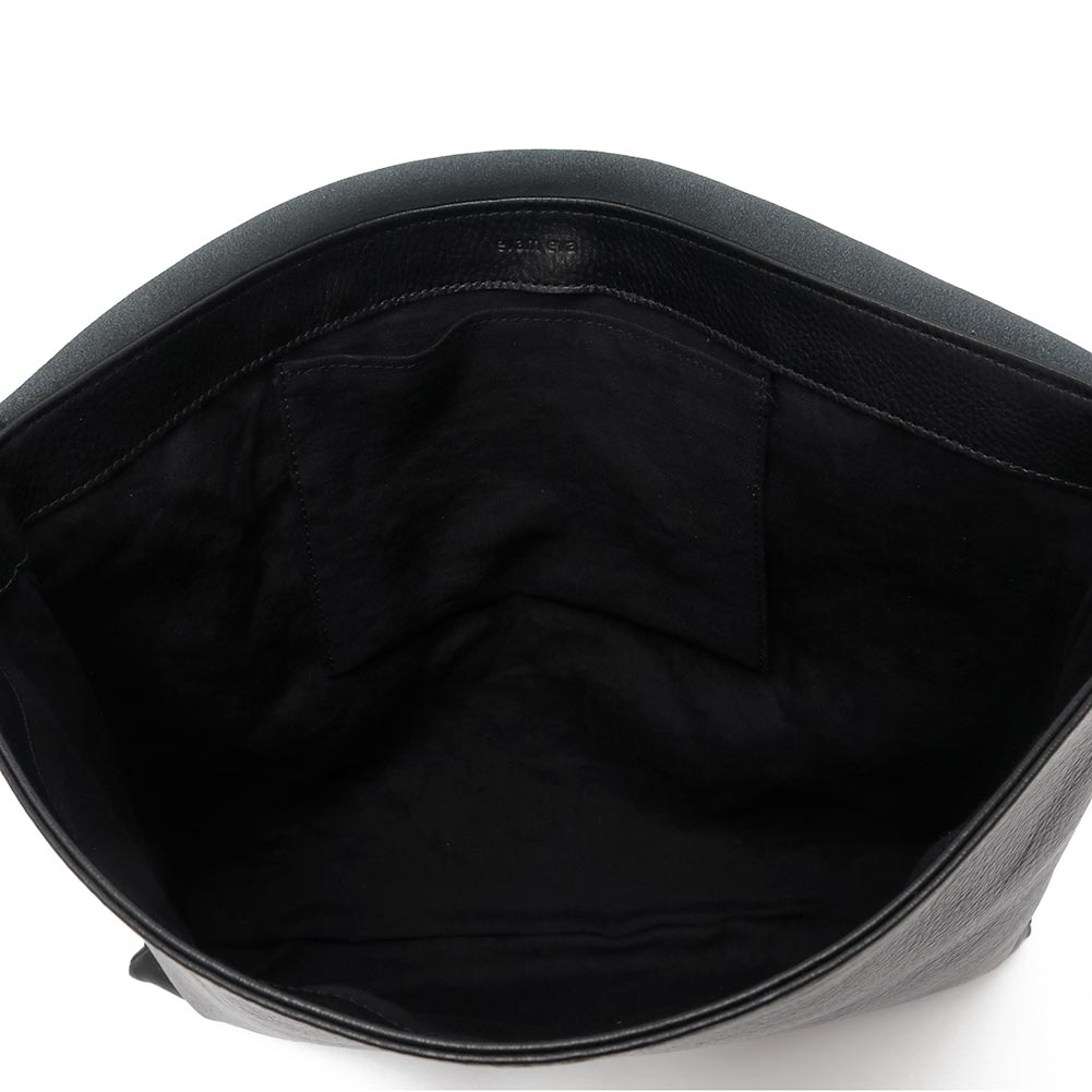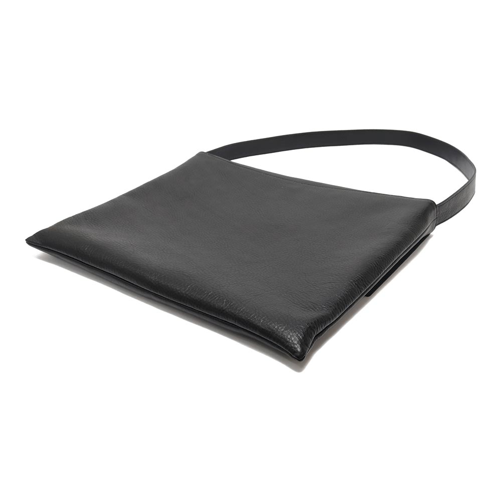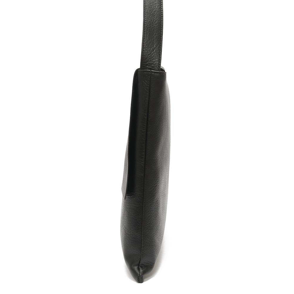 フラップ付きのショルダーバッグは、洗練された佇まいが上品な印象です。使用しているのは、程よい肉感がありながらも柔らかな手触りの牛革。表面にはシボ感があり、レザー特有の表情ある仕上がりです。A4サイズが横向きにすっぽり収まるサイズで、割と大きさはありますがマチがないぶん、嵩張らない仕様です。内側には細々した小物を収納できるポケットがひとつ付いています。シンプルなデザインが様々なシーンで活躍します。