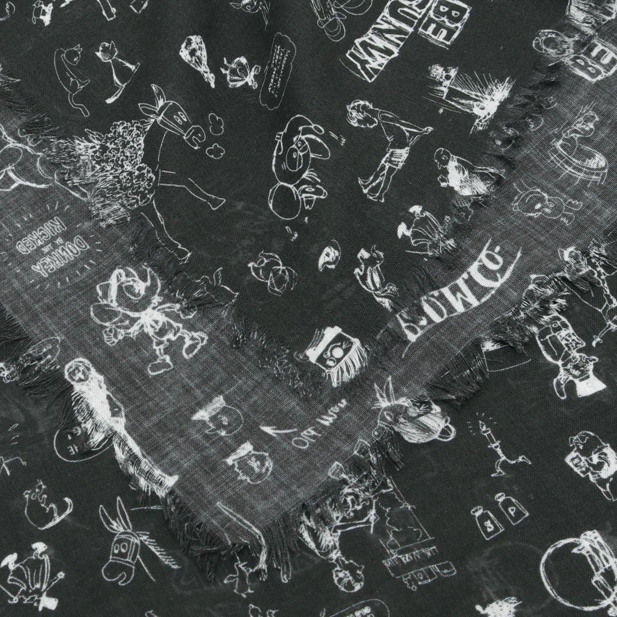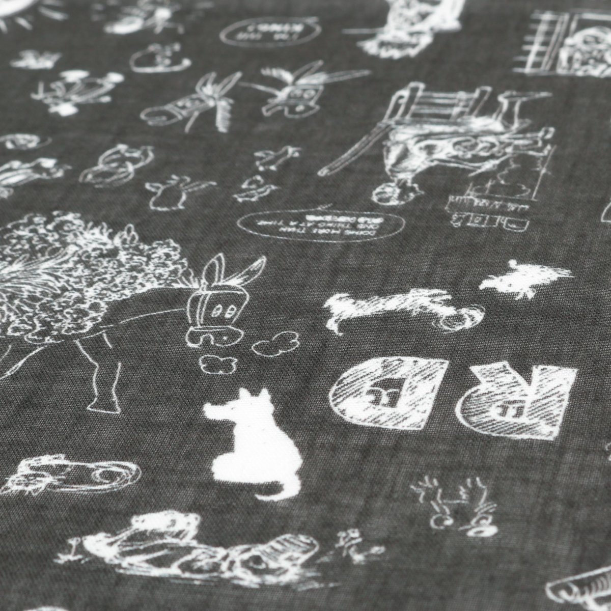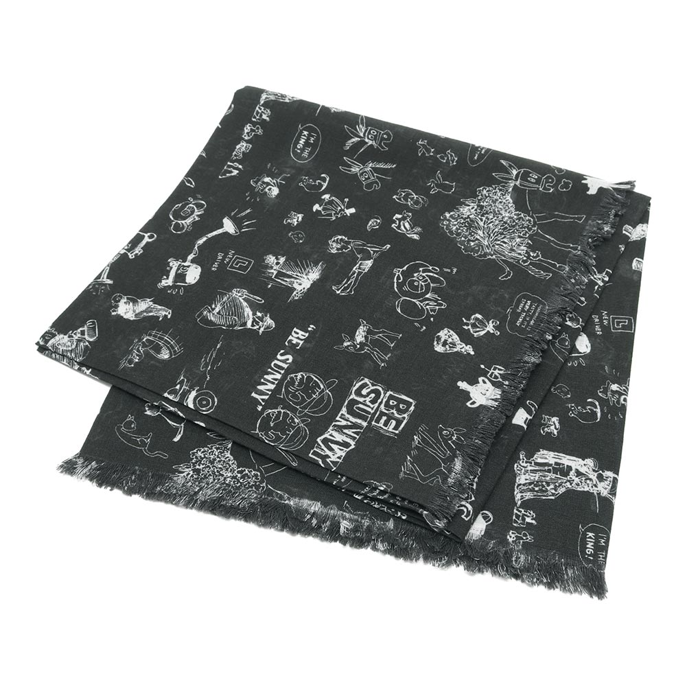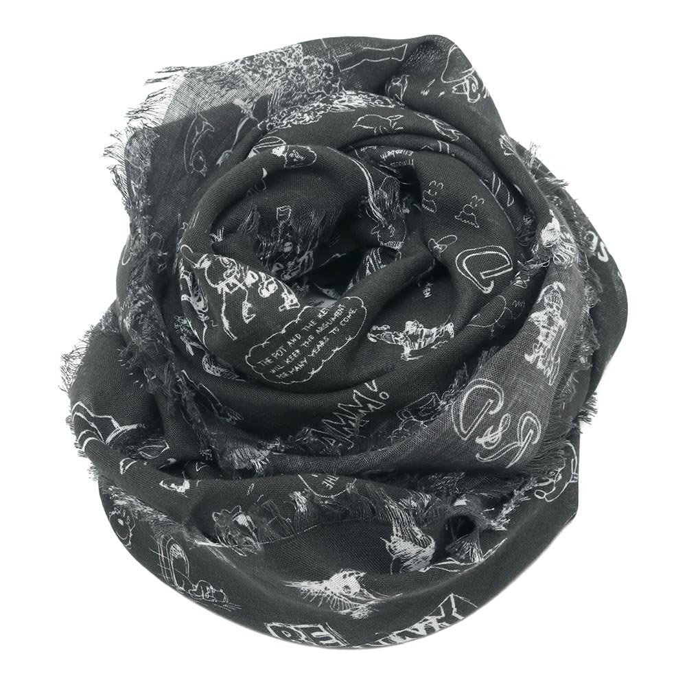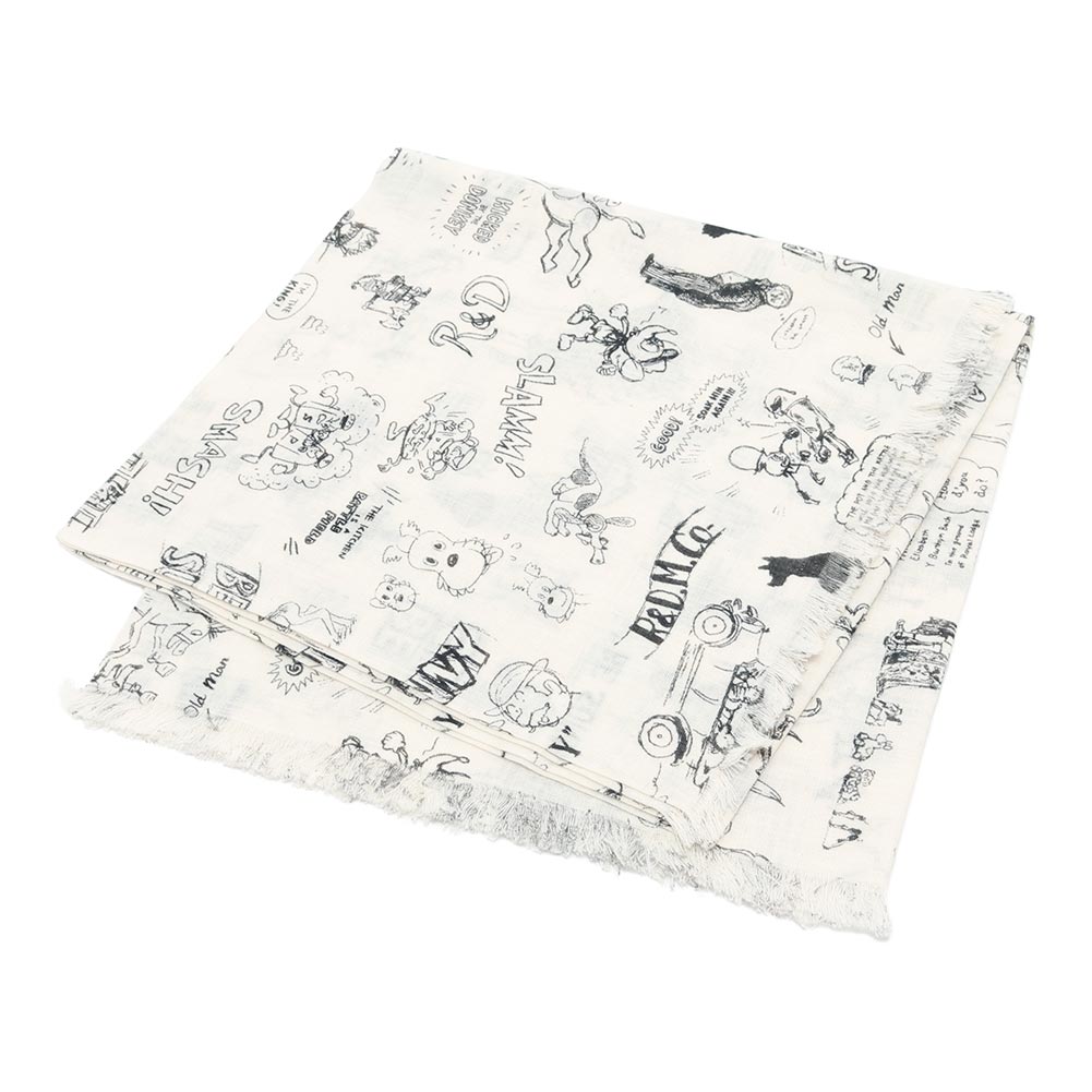 様々な動物や紳士たちが描かれた遊び心のあるガーゼショール。ラフなスケッチで描かれていて、見覚えのあるキャラクターもちらほら。ふわっとした柔らかさが素肌にも優しく、首に巻いたり、肩にかけたり、いろいろな使い方ができます。 シンプルなコーディネートのポイントにおすすめです。
