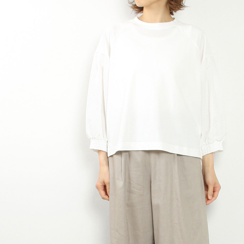 一枚でもサマになり、カットソーですがきちんと見えます。袖口がシャーリングになっていて着心地も○