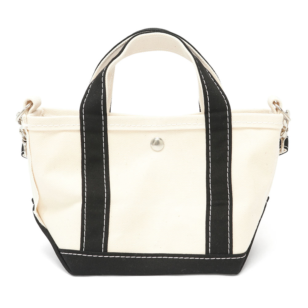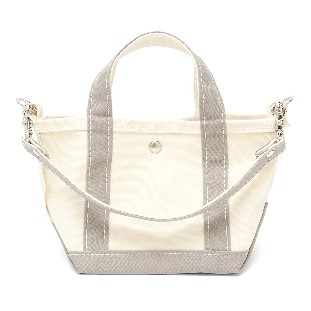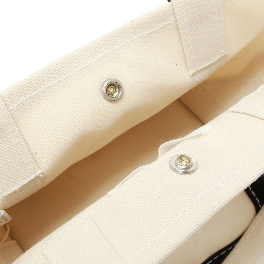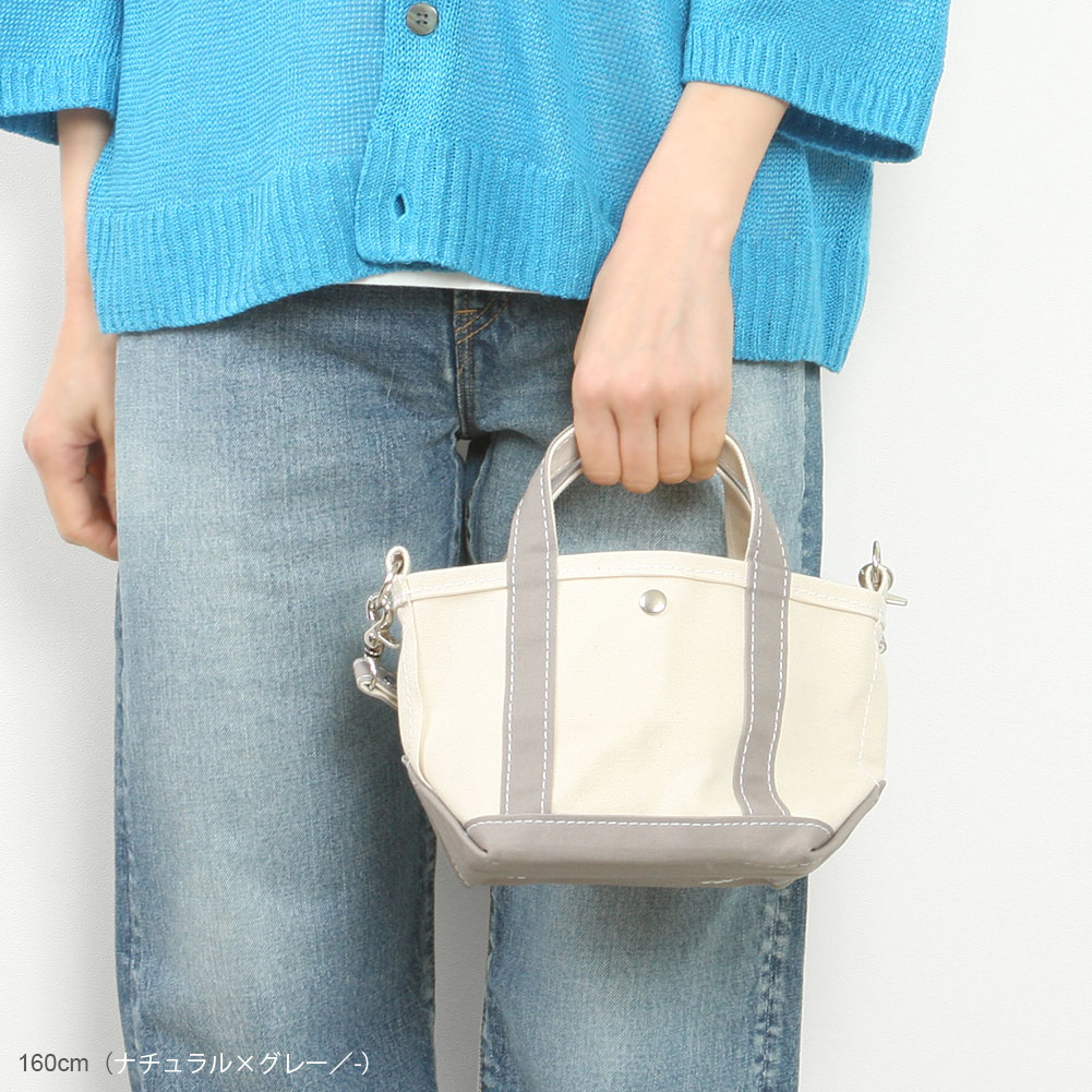 新作のトートバッグミニミニ。 サイドの金具で付け外しのできる短いハンドル付き。 手持ちや肩掛けで持つことができ、大きめのトートのハンドルに付けて持つこともできます。 袋口を留めるボタン付きなので中身が丸見えになる心配はないですね。