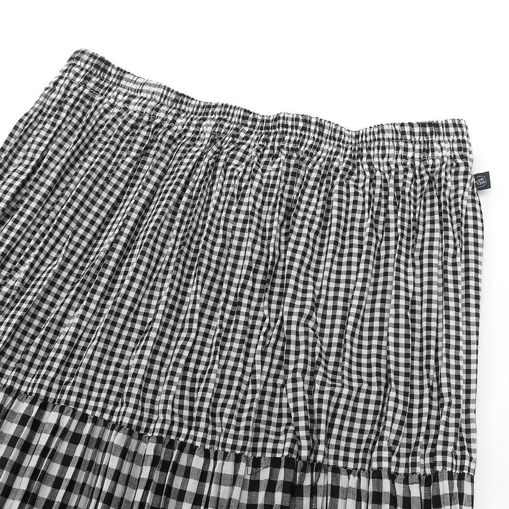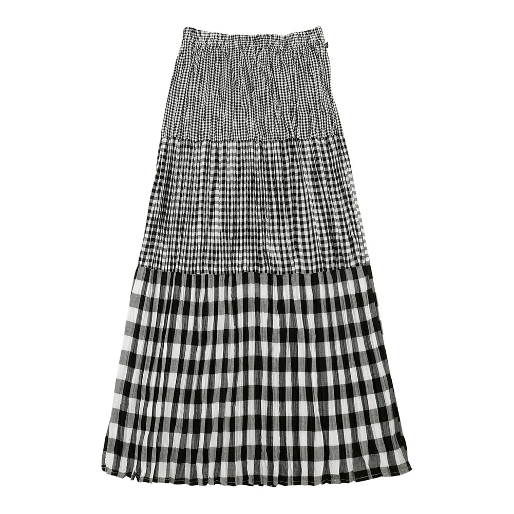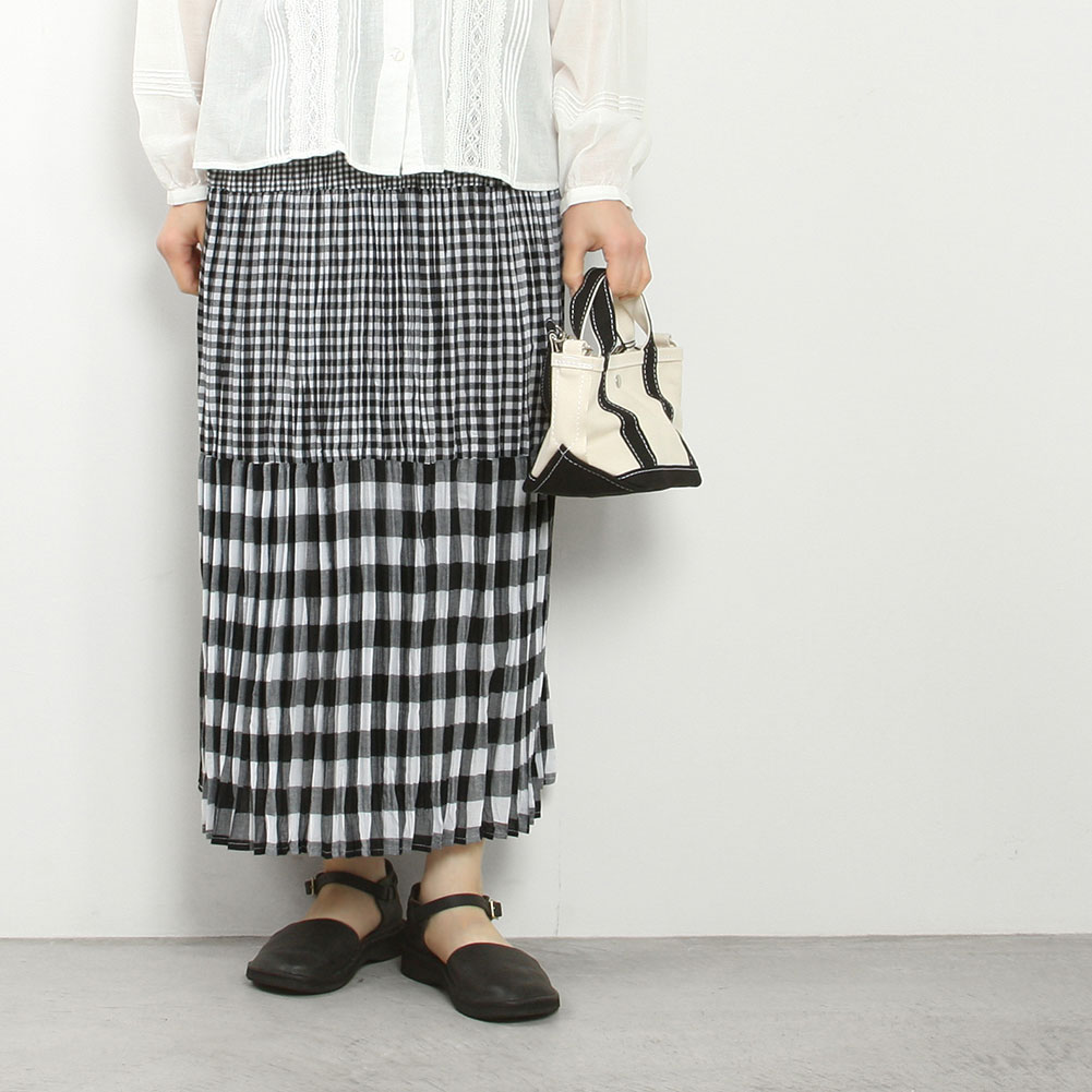 軽くて柔らかい生地のロックマウントスカート。お洗濯で少しフレアーになります。3種類のピッチの違うギンガムチェックを組み合わせたスカートでインパクトがあります。シンプルにTシャツ等と合わせて足元サンダルでお出掛けが楽しくなりそうなスカートです。少し透けるのでペチコートなどを合わせるといいですよ。