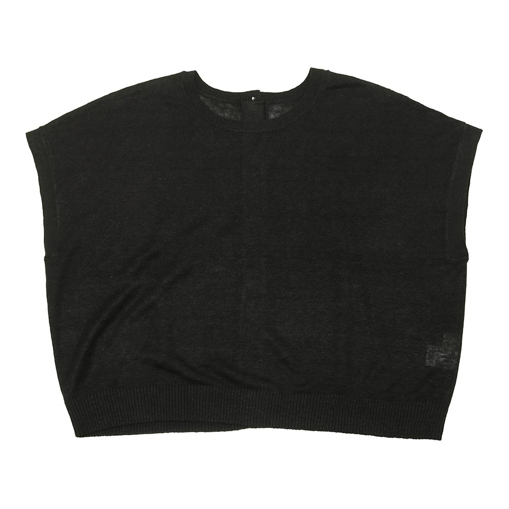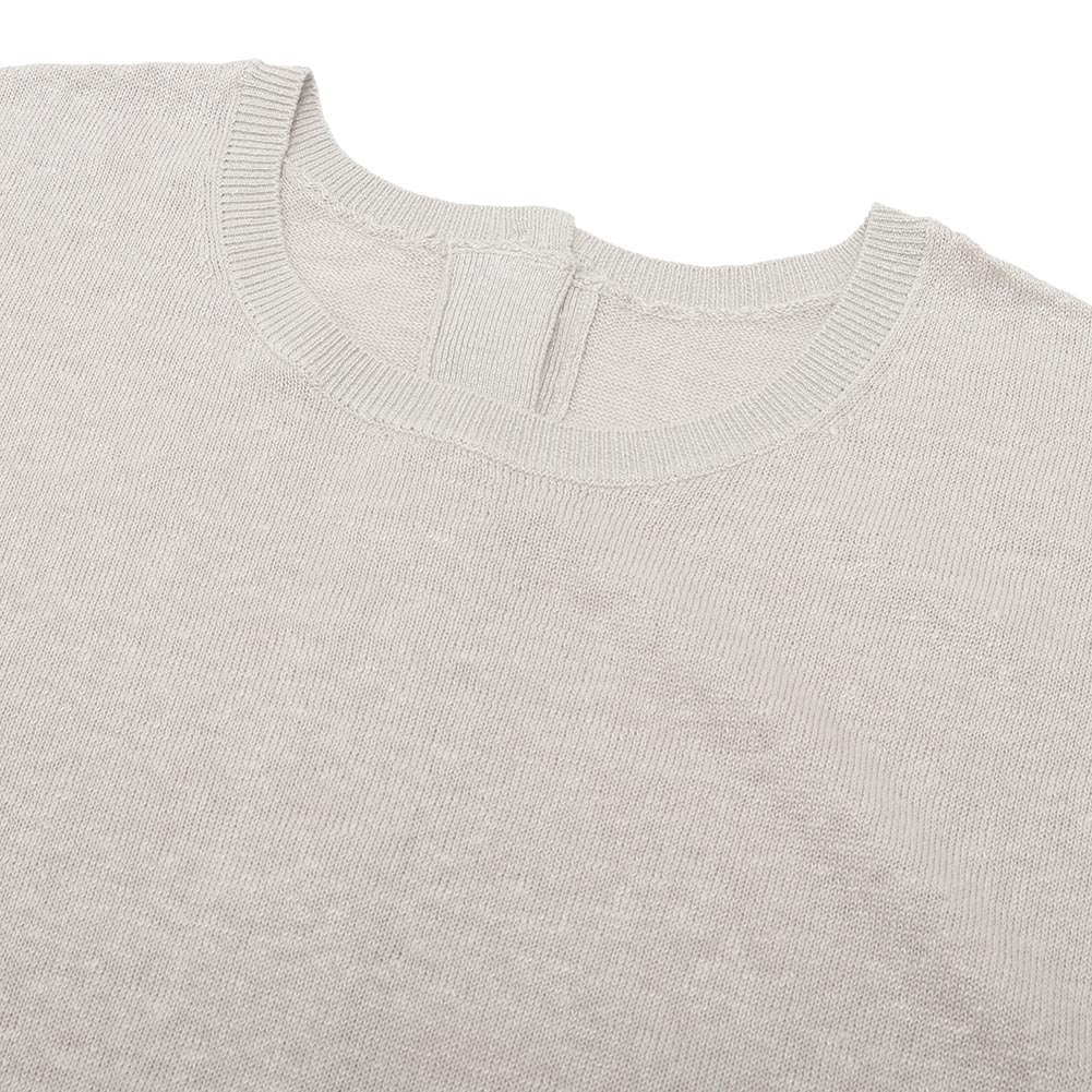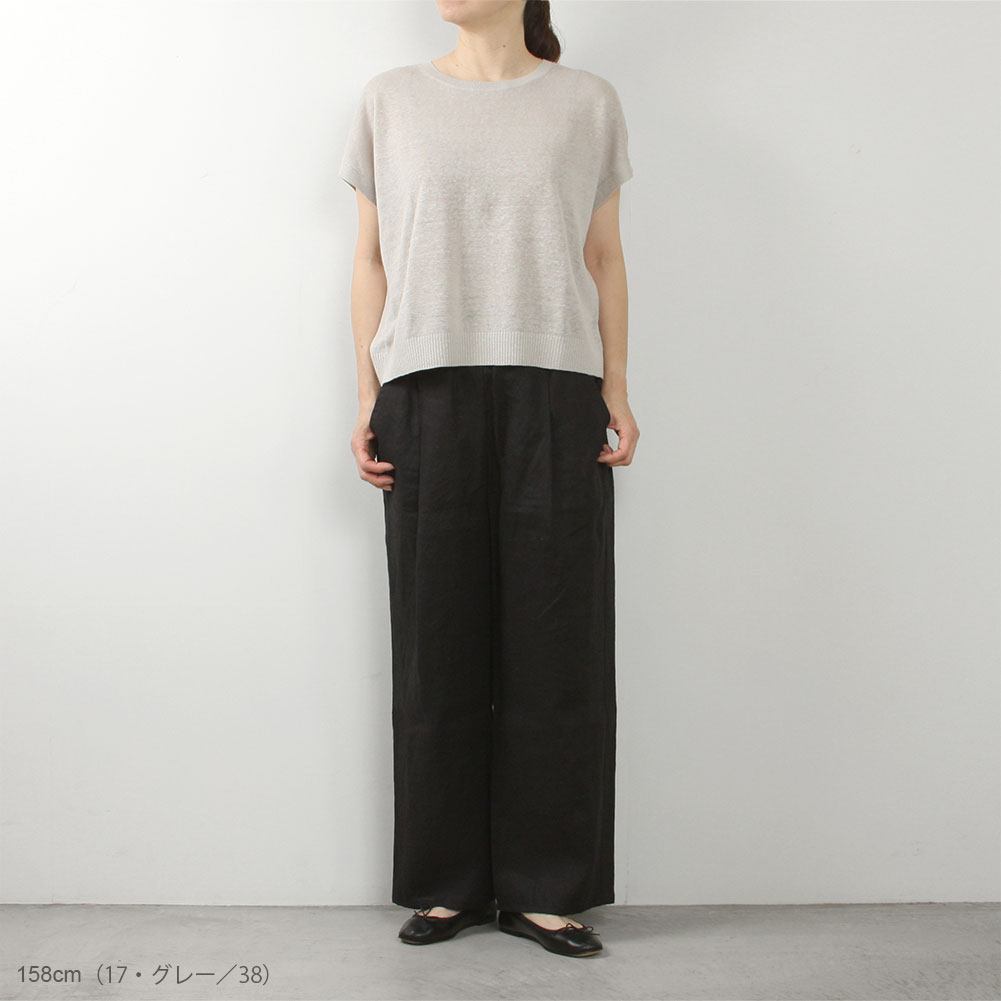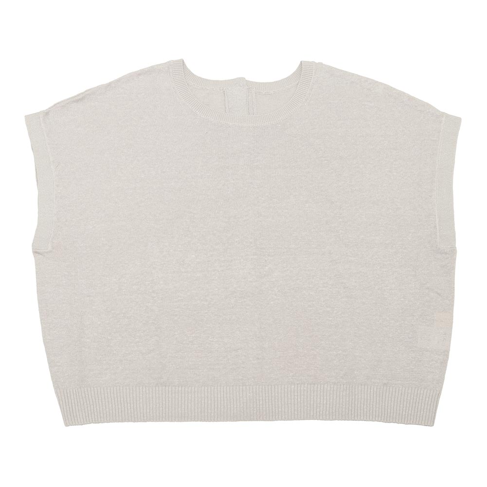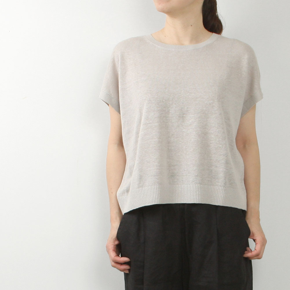 インにカットソーを入れベストとして、フレンチスリーブの着丈なので真夏は一枚でリネンニットとしてもお使いいただけます。