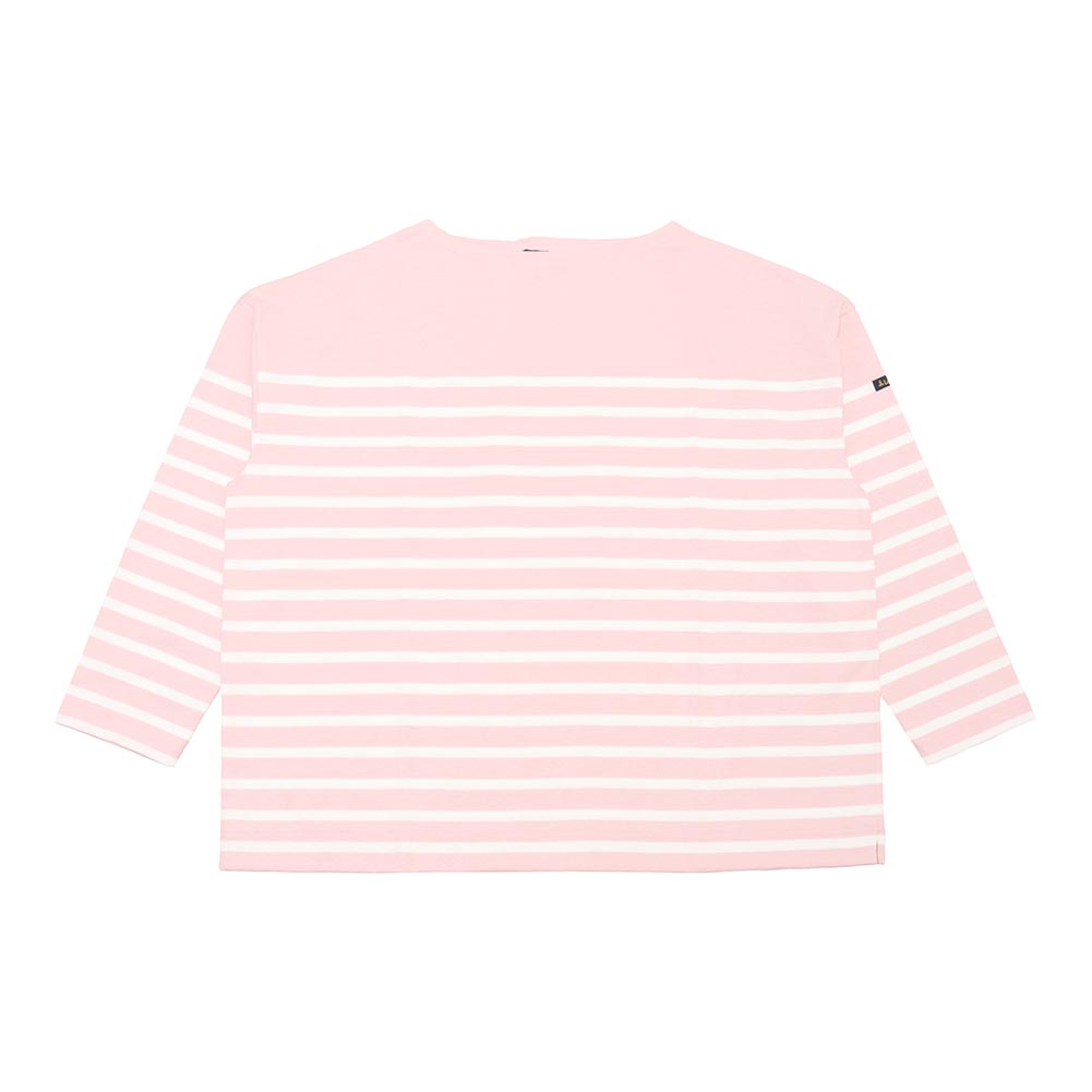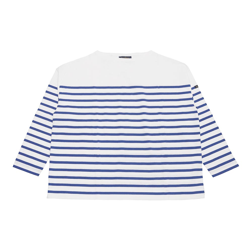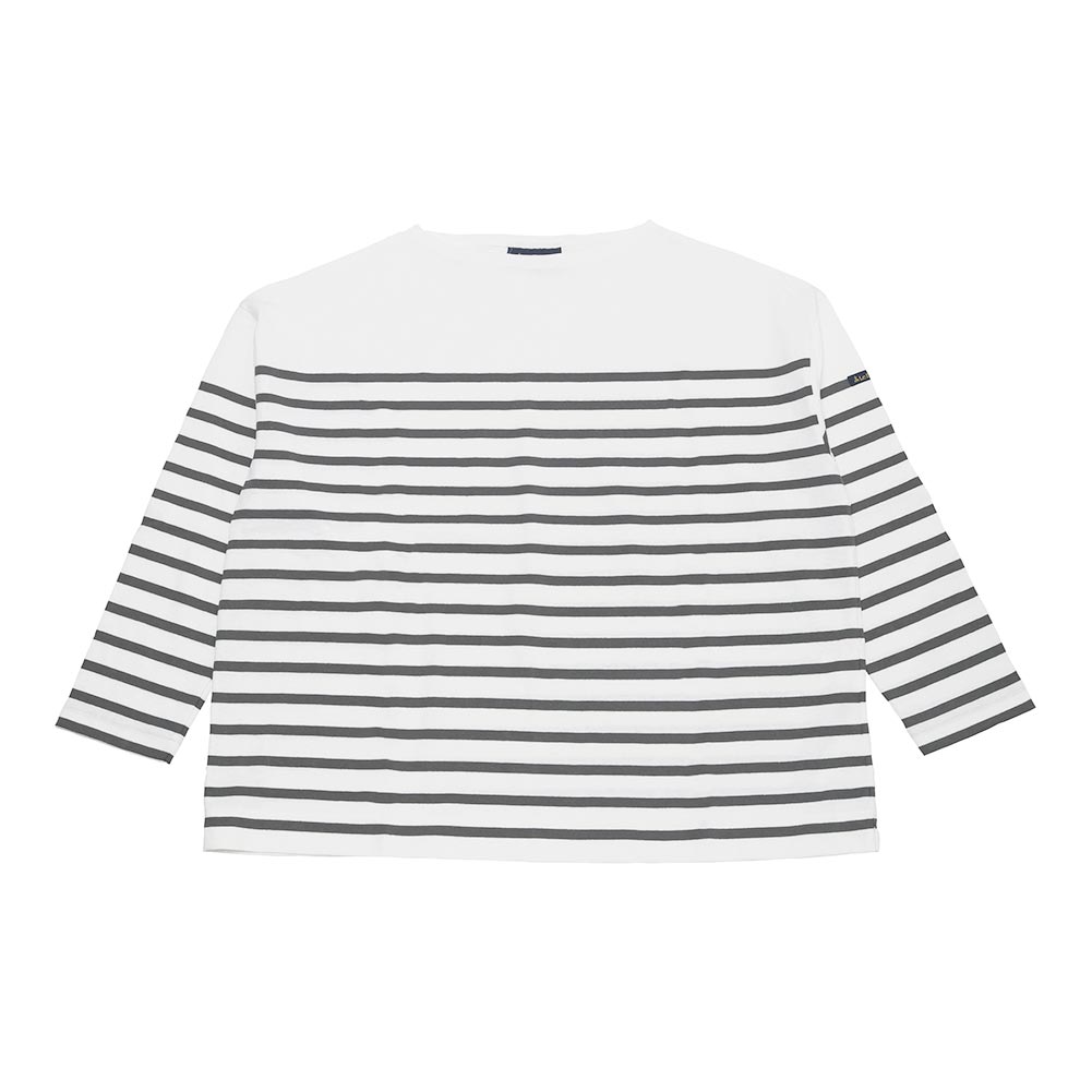 肩の位置を落としたドロップショルダーとワイドな身幅のデザインが特徴で、トレンド感のあるバスクシャツです。薄手なのでアウターなどのインナーにも着用しやすく、一枚で盛夏前までご利用いただけます。
