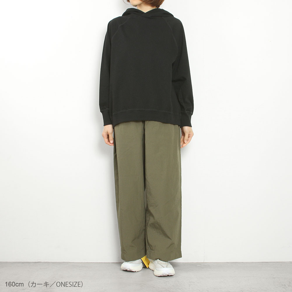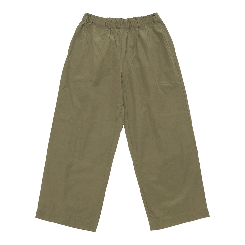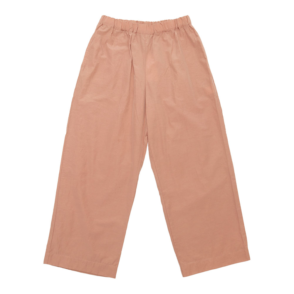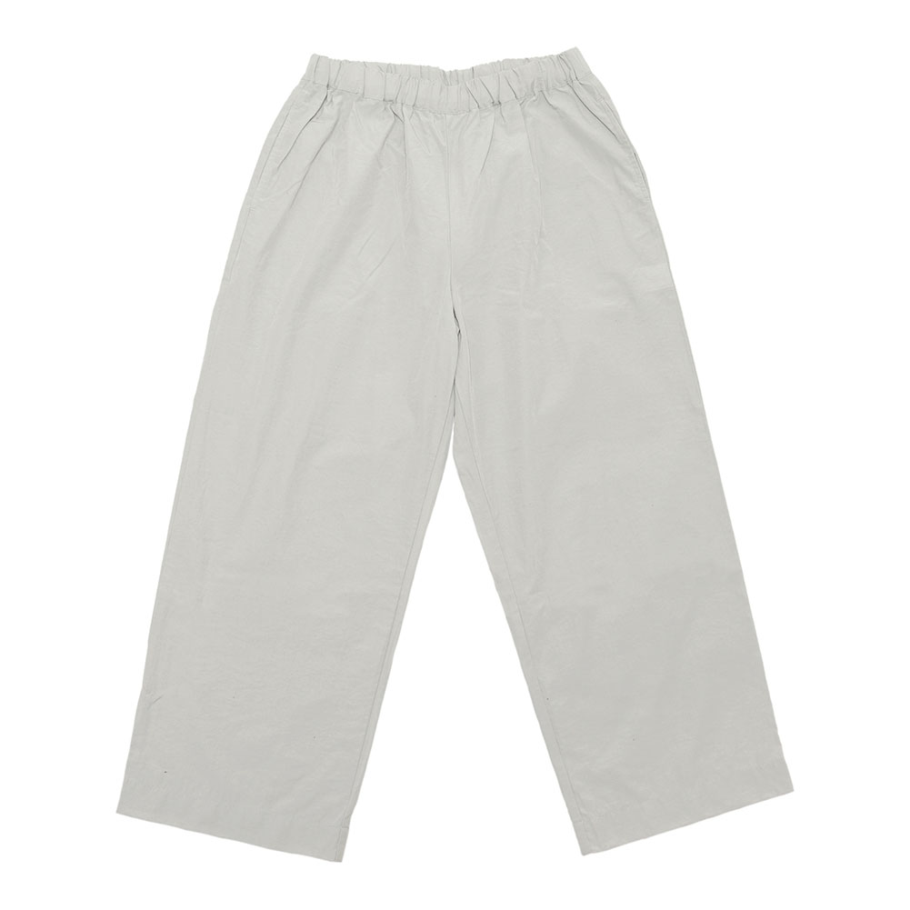 コットンナイロンの少しシャリ感のあるパンツ。軽くてサラっとしていて夏まで涼しく穿けそうです。ワイド過ぎないストレートなシルエットでトップスも合せやすそう。ウエストはゴム仕様でリラックスして穿けます。