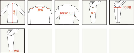 | 着丈(背中-裾) | 肩幅 | 胸囲 | 股下 | ワタリ幅 | 裾幅 |