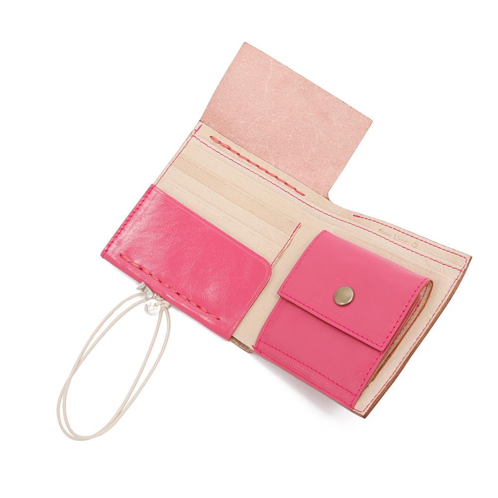 質の良い革は大人っぽさの中に可愛らしさもある2つ折り財布は丁度よいサイズ感。 エバゴスでは長年使われている牛ソフト。 シャイニーは牛ソフトの表面に表情の変化を与えた新しいシリーズです。 牛ソフトは渋なめしの限界の薄さまで薄くした革で柔らかくハリがあるのが特徴。 薄くした革に顔料を多く用いて、グレージングのアイロンにより透明感のある艶を出した仕上げになっています。 牛ソフトとはまた違ったハリ感のある素材。 本来の質感を大切にしているので使用していると細かい傷がつきますが、ずっと愛用していただくと傷も馴染んでくる革になっています。