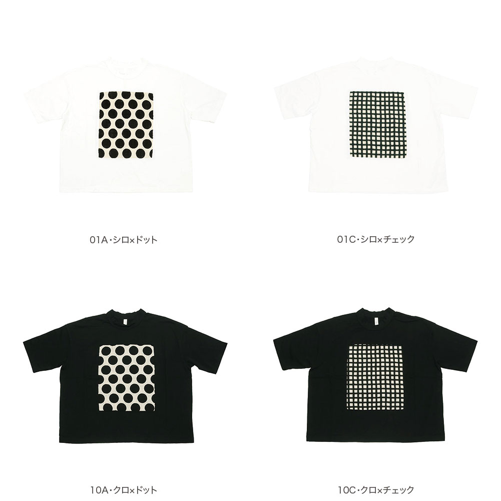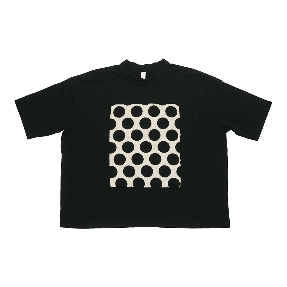 フレーム型にカットオフした前身頃に、ドット柄の生地を合わせた一枚。首元も開きすぎず詰まり過ぎずちょうど良い感じです。
