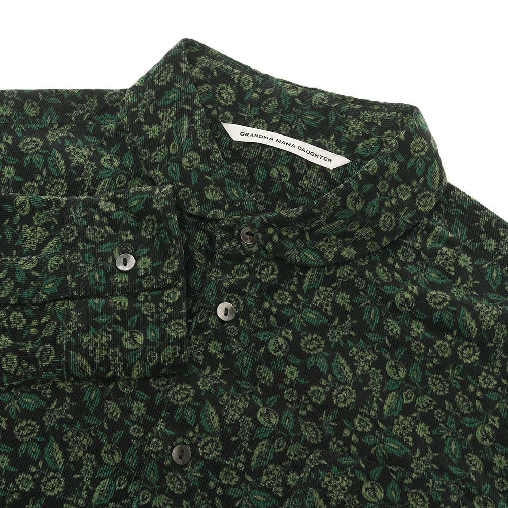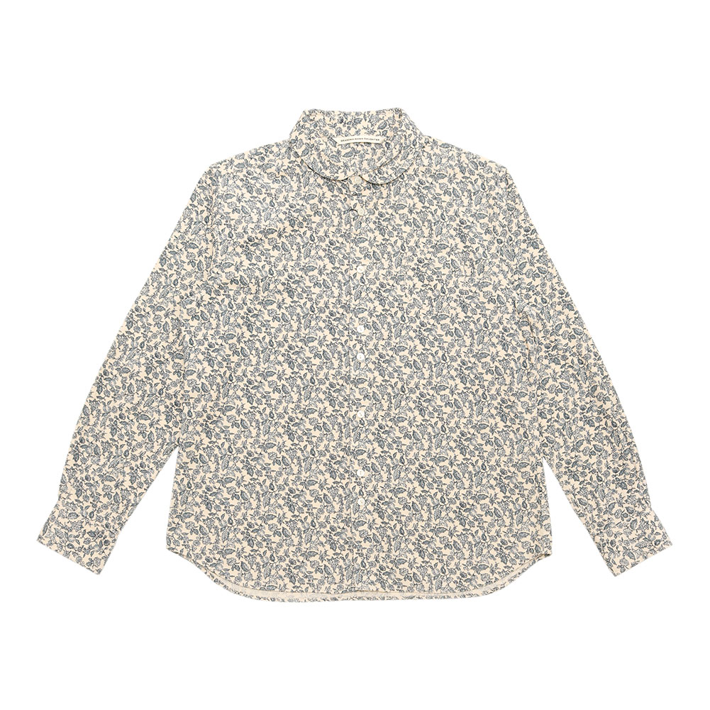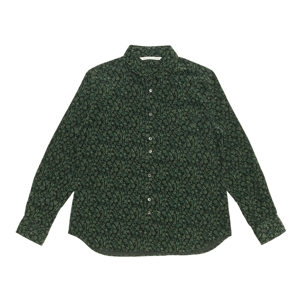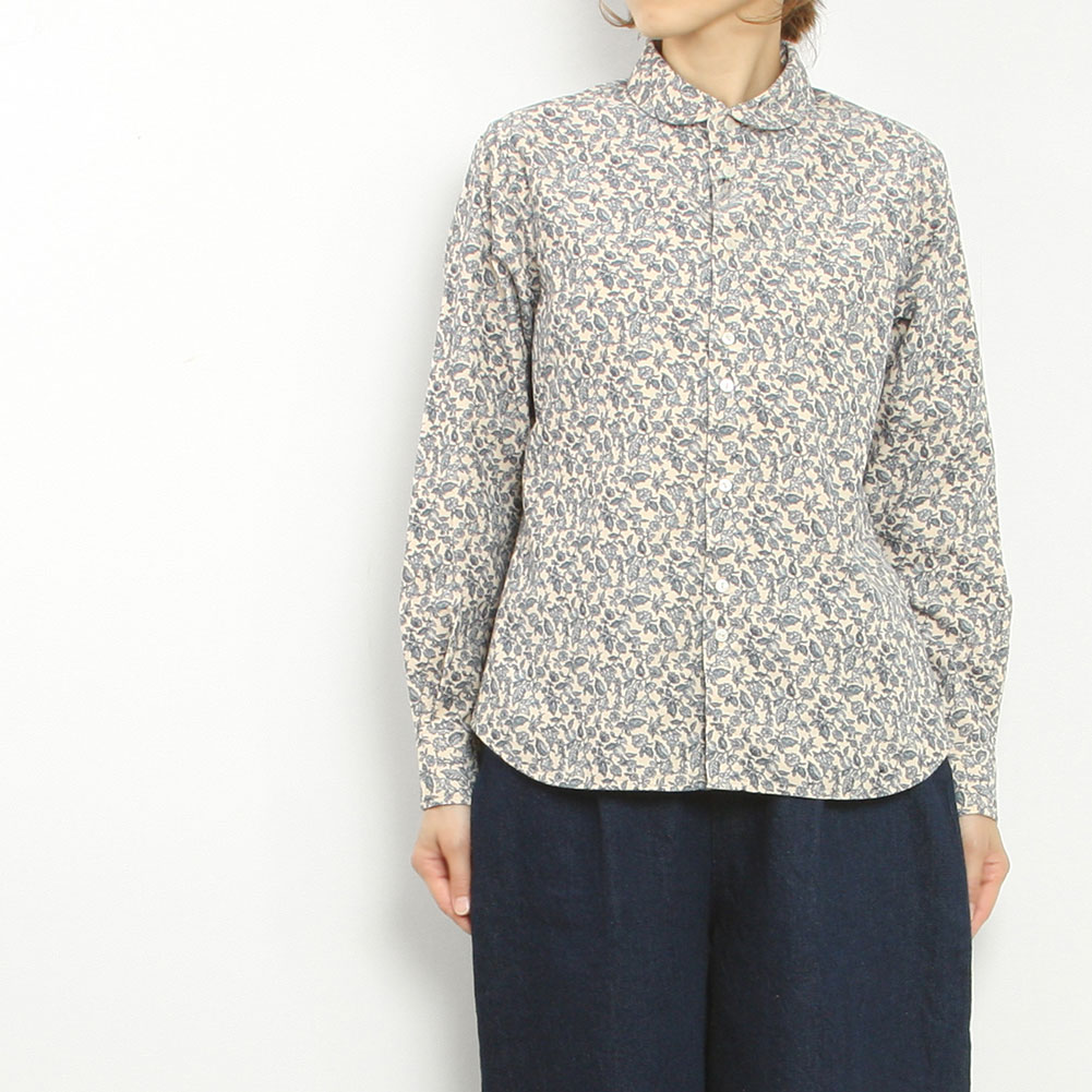 秋の果樹園をイメージしたオリジナルプリントのシャツ。小さめの襟や丸みのある胸ポケットが特徴、コンパクトなサイズ感が使い勝手のよいグランマ定番の形です。