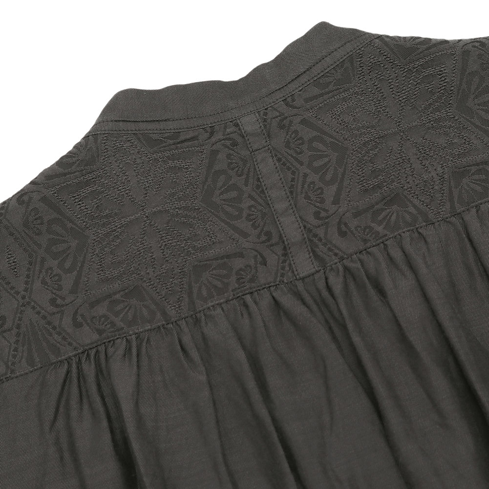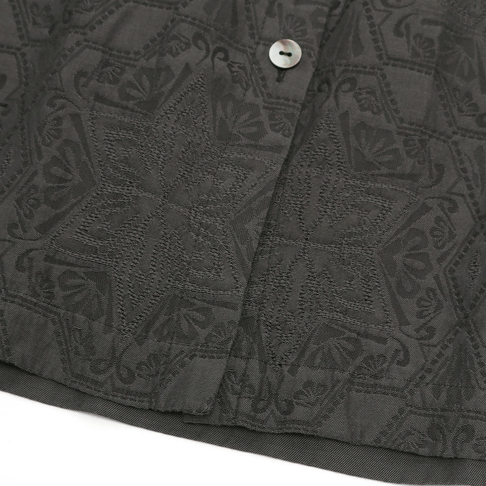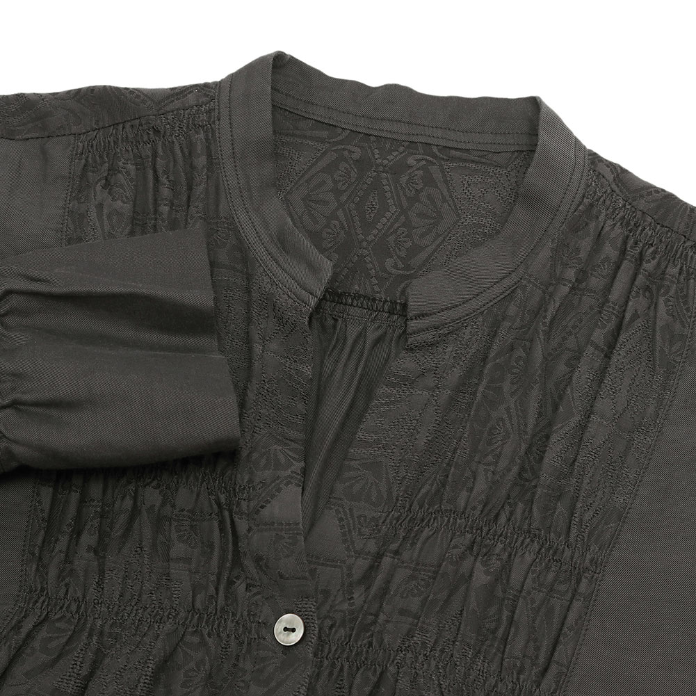 ギャザーディティールやジャガード生地がポイントのスタンドカラーシャツ。ジャガード生地は、70年代のアーカイブを参考にした幾何学の別注生地で透かし柄を組み合わせることで立体感が生まれ複雑な陰影と光沢感をもたせています。