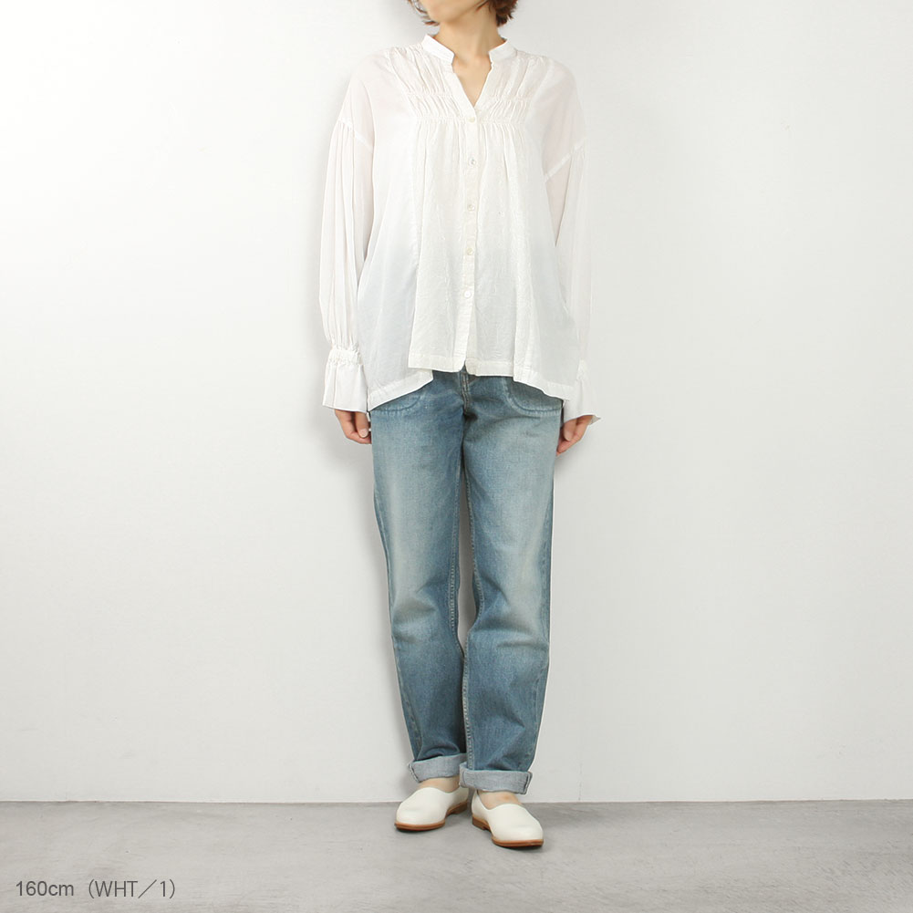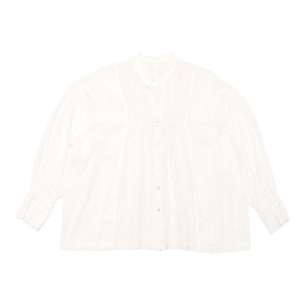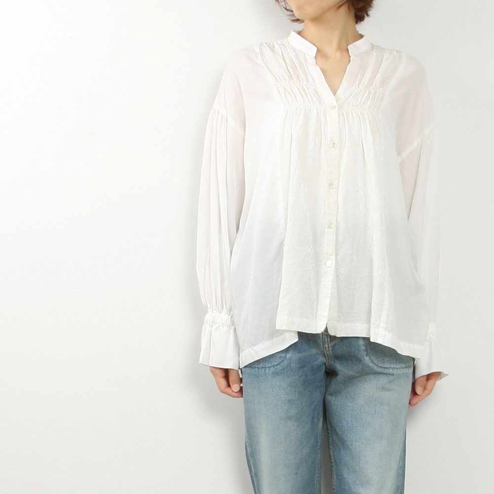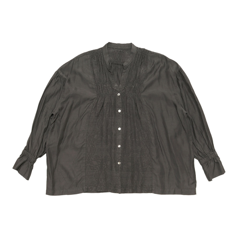 ギャザーディティールやジャガード生地がポイントのスタンドカラーシャツ。ジャガード生地は、70年代のアーカイブを参考にした幾何学の別注生地で透かし柄を組み合わせることで立体感が生まれ複雑な陰影と光沢感をもたせています。