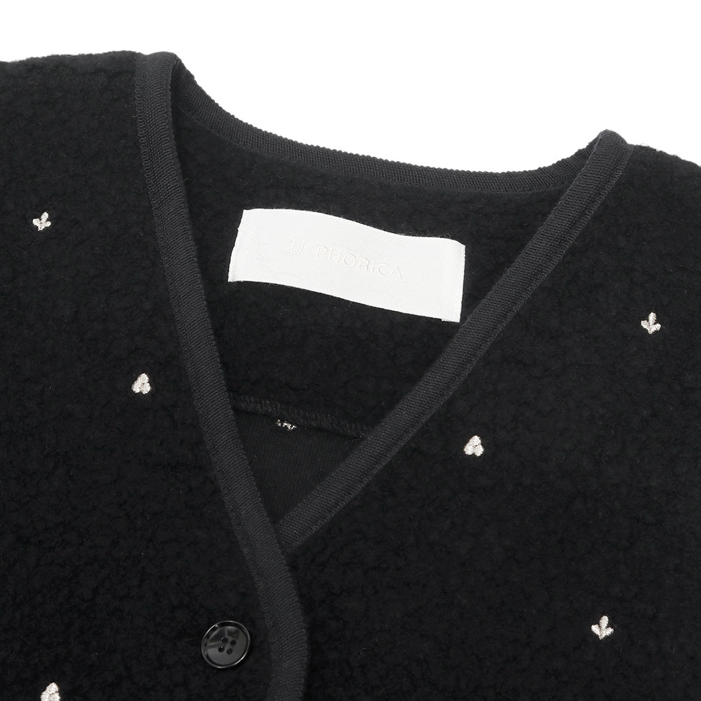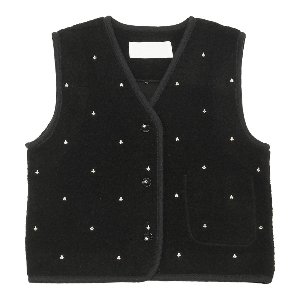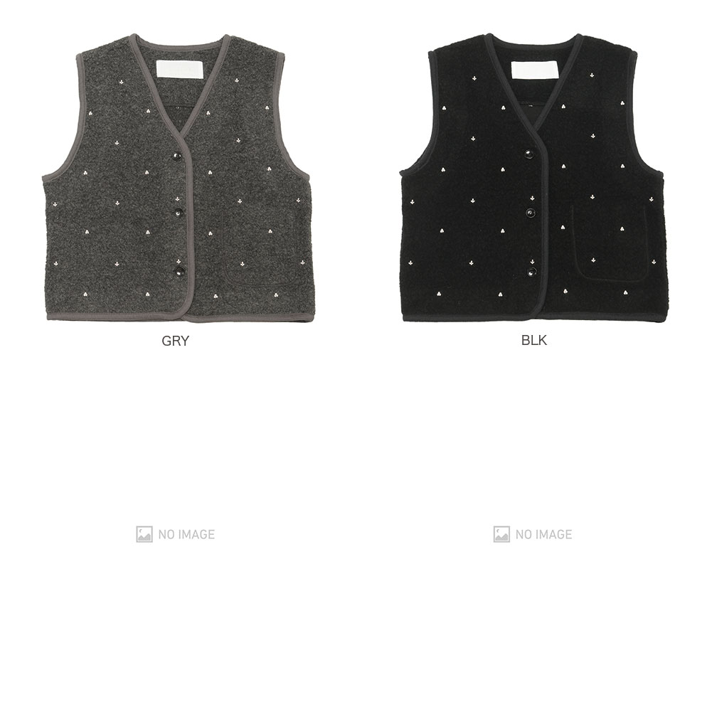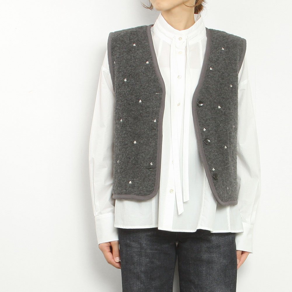 オリジナルモチーフ柄を前面にシルバー刺繍した特別感のあるベスト。特殊な丸編み機で空気と一緒に編んだふっくら柔らかな生地、ウール混の軽くて暖かな素材が特徴です。