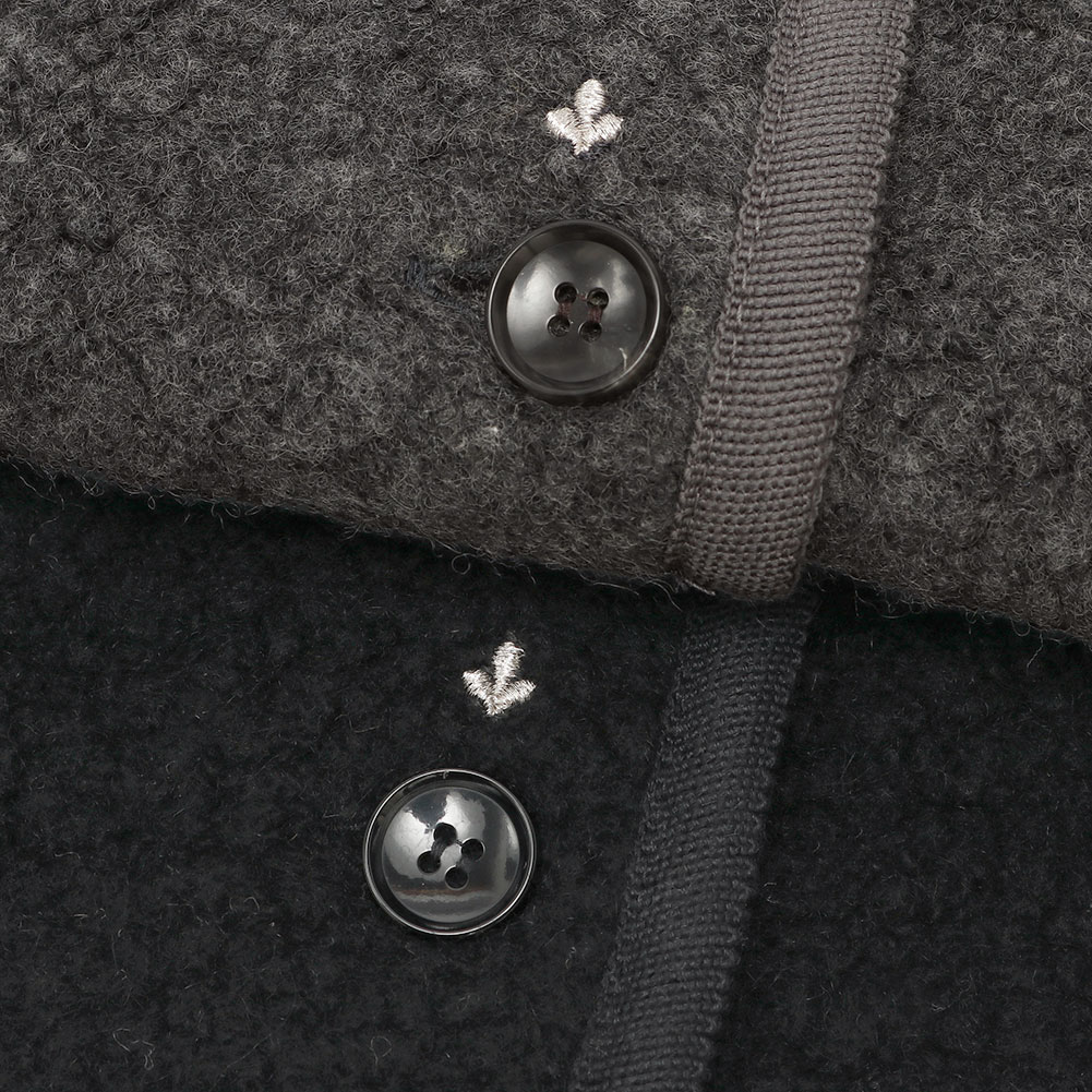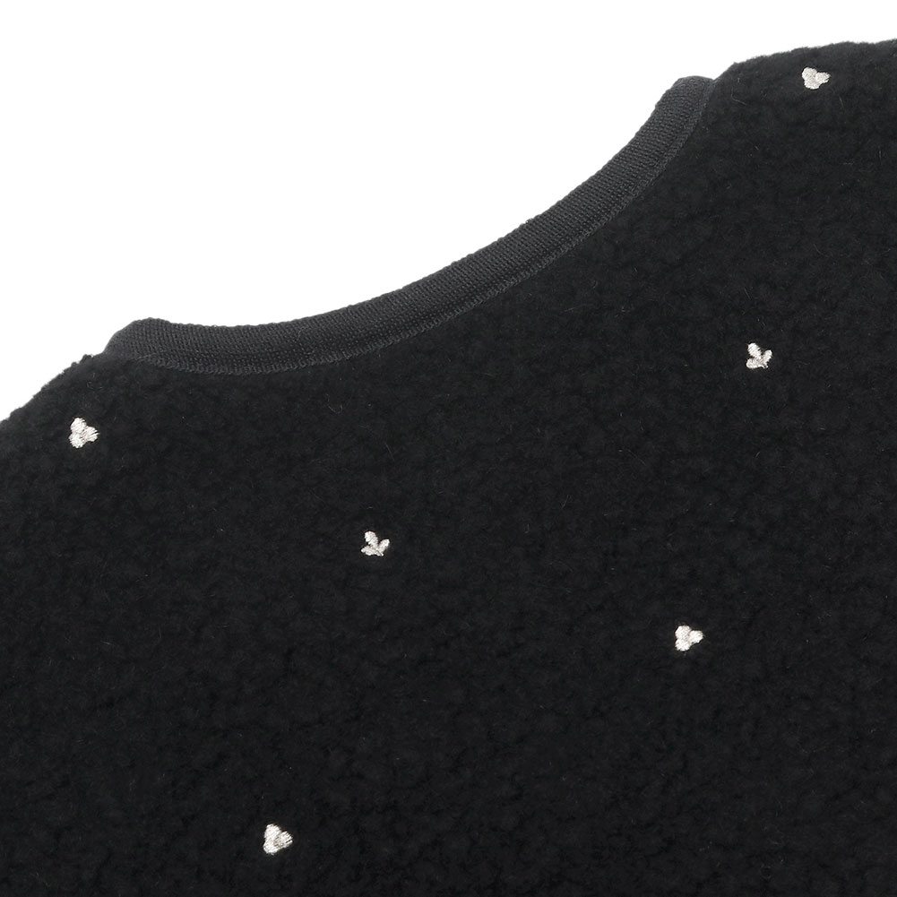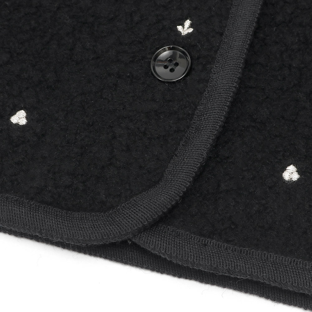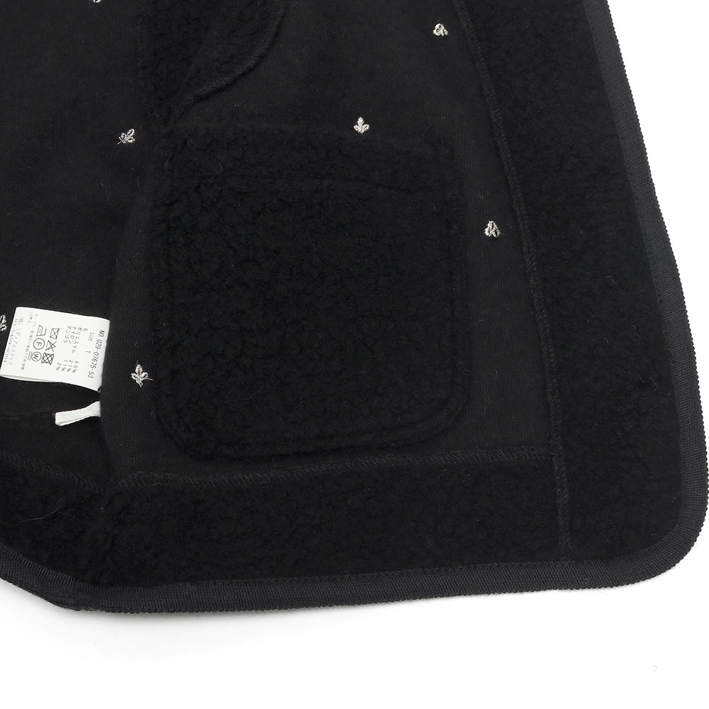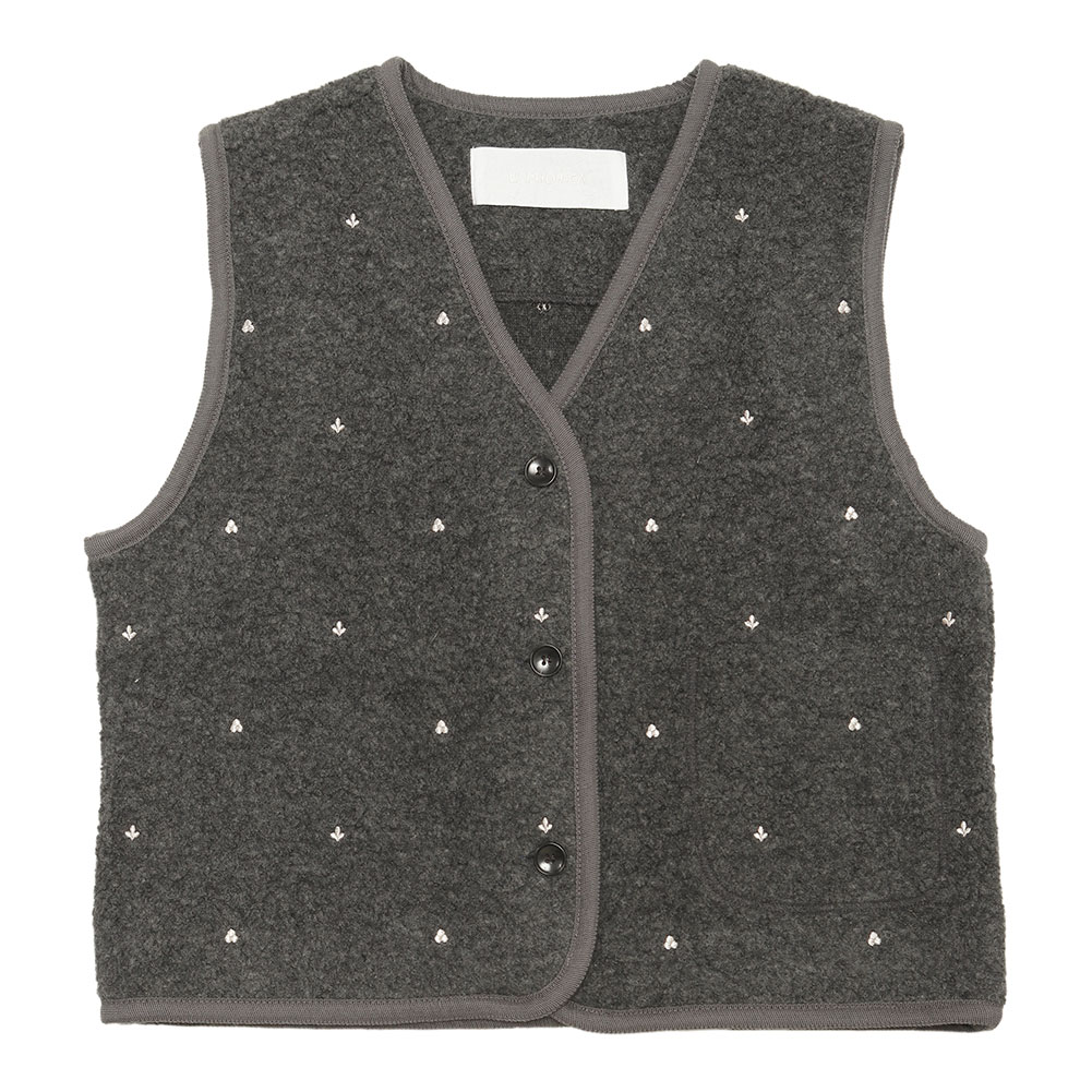 オリジナルモチーフ柄を前面にシルバー刺繍した特別感のあるベスト。特殊な丸編み機で空気と一緒に編んだふっくら柔らかな生地、ウール混の軽くて暖かな素材が特徴です。