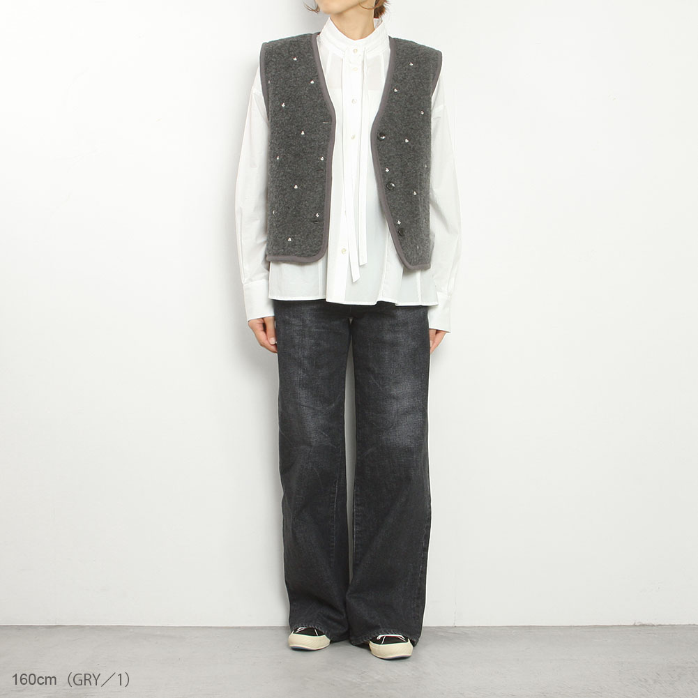 コンパクトな着丈でバランスよく着られ、ロングスカートやワイドボトムなど合わせるアイテムを選ばず着用できます。すっきり開いたVネックでアウターの下にライナーベストとして入れていただくことも可能です。